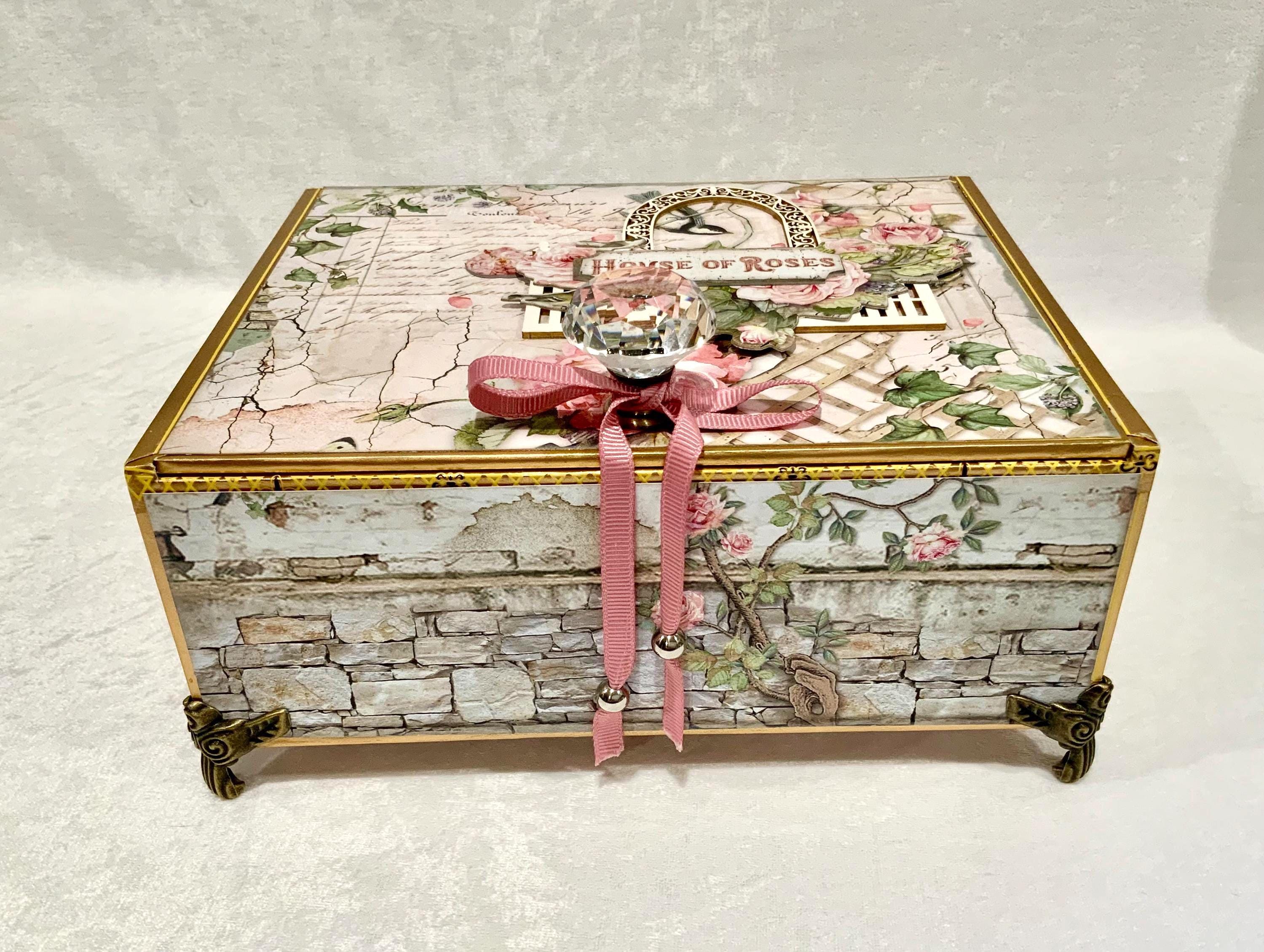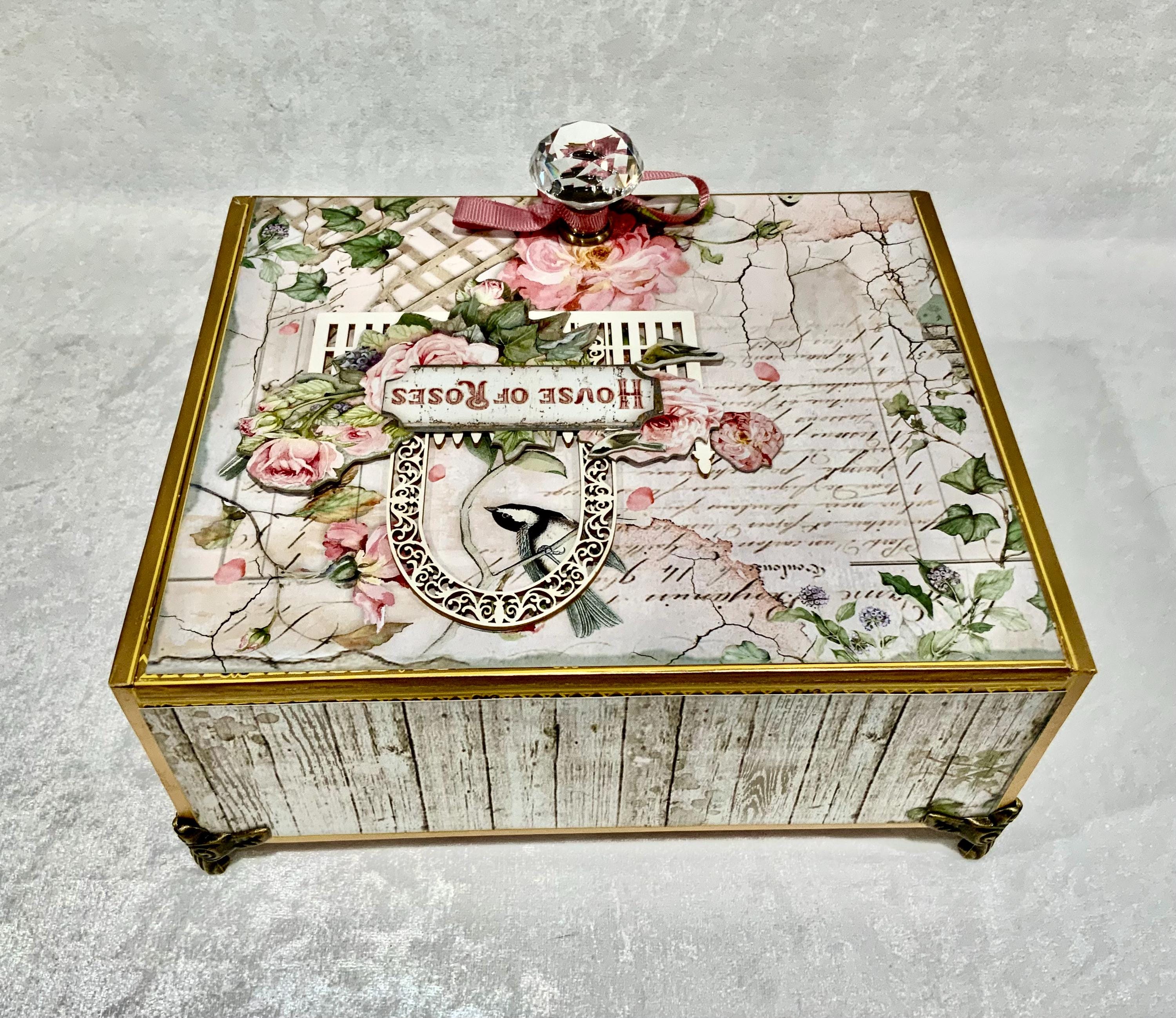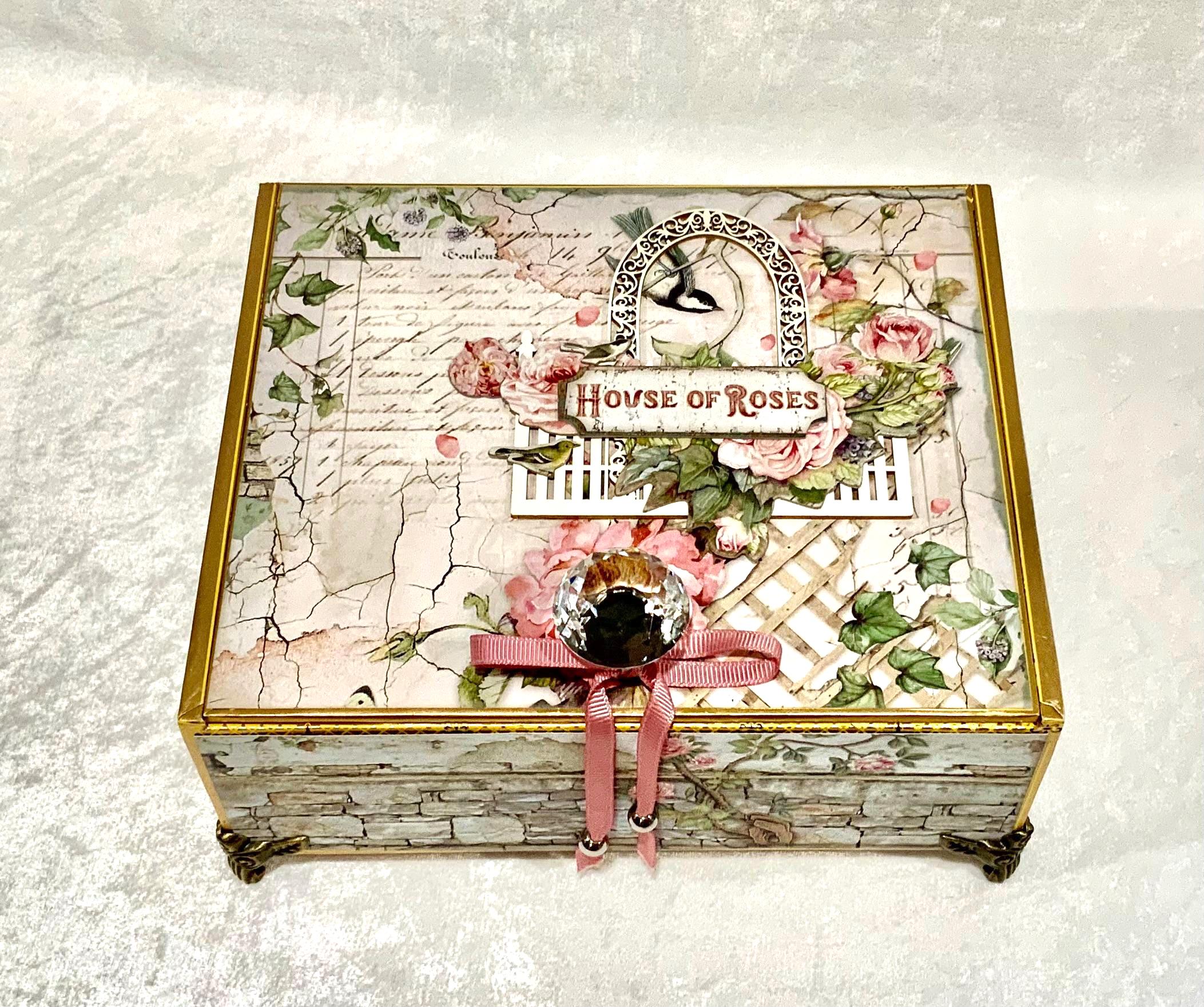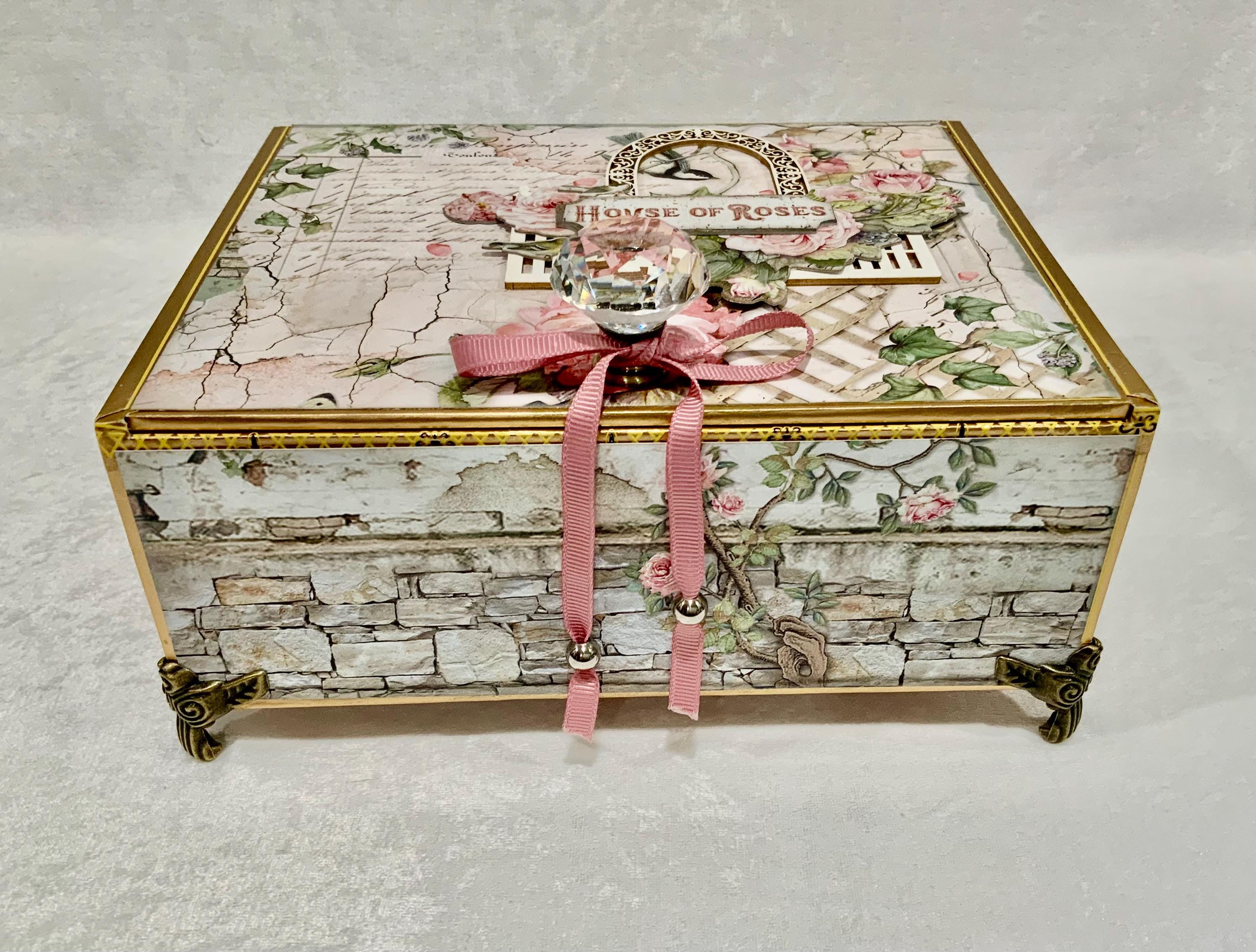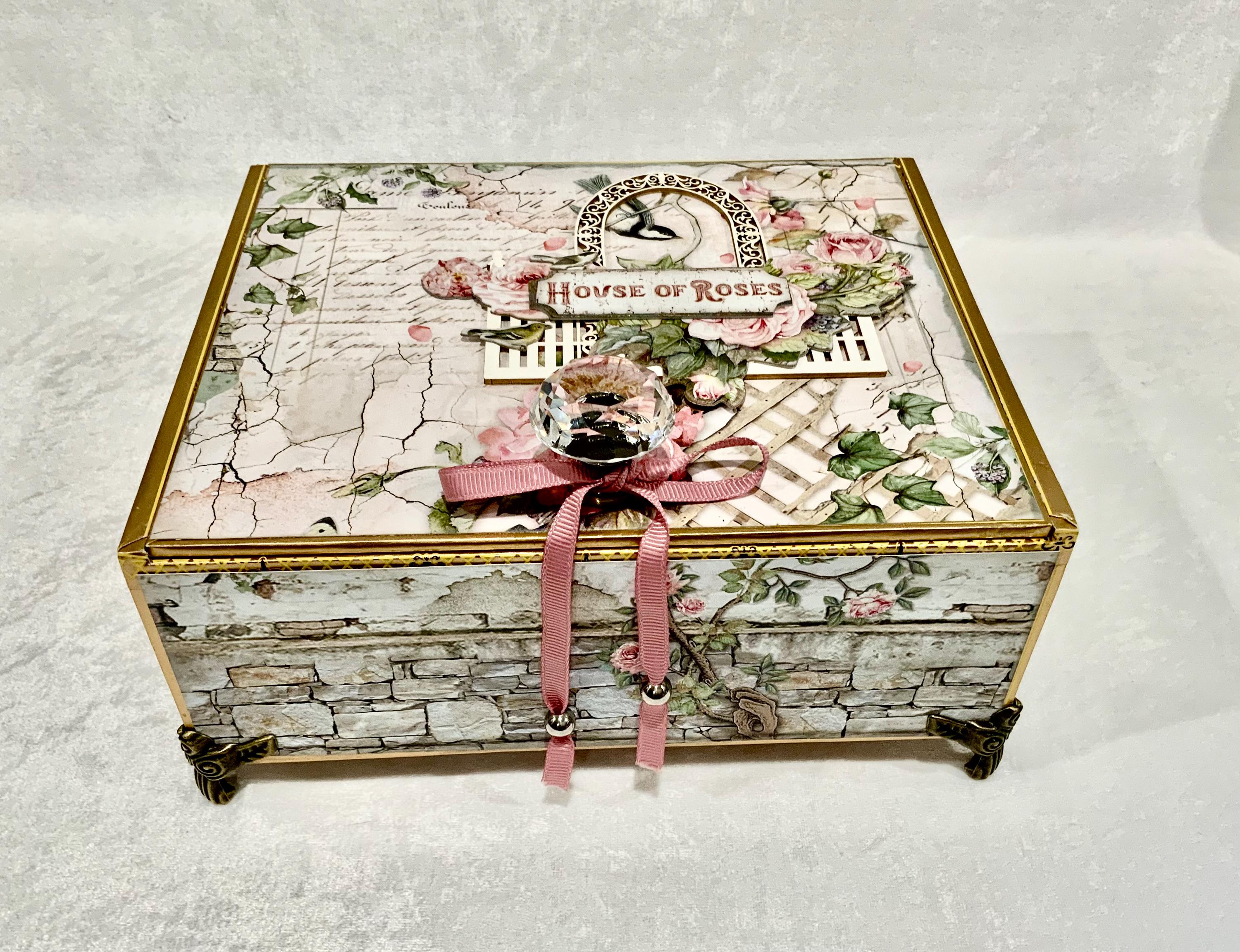Step into a dreamy garden with this romantic “House of Roses” decorated cigar box by My Little Pretties USA. This upcycled wooden cigar box features lush pink roses, ivy-covered lattice, and a bird framed by a vintage arch. The elegant crystal knob and gold accents add a touch of cottage glamour.
