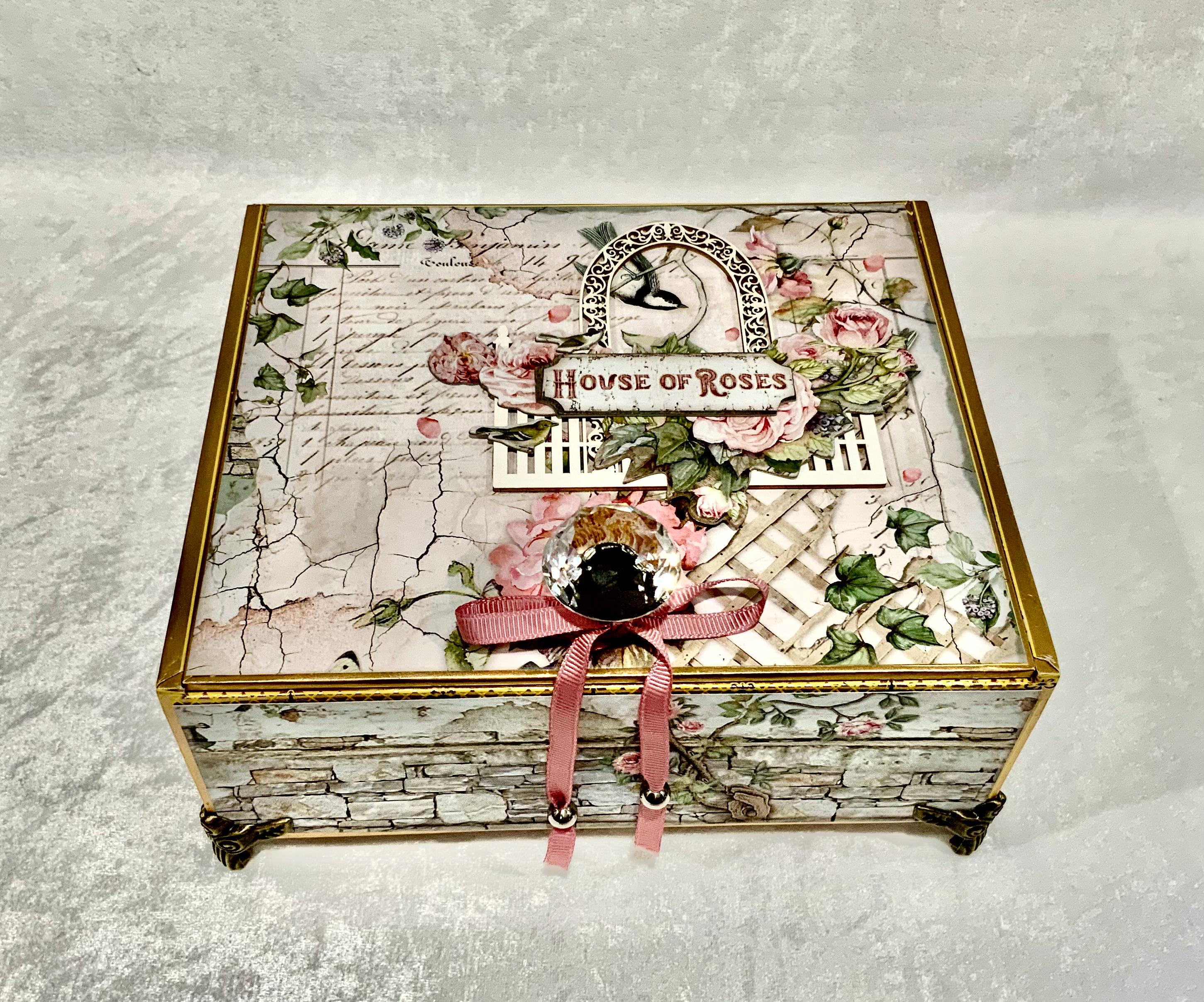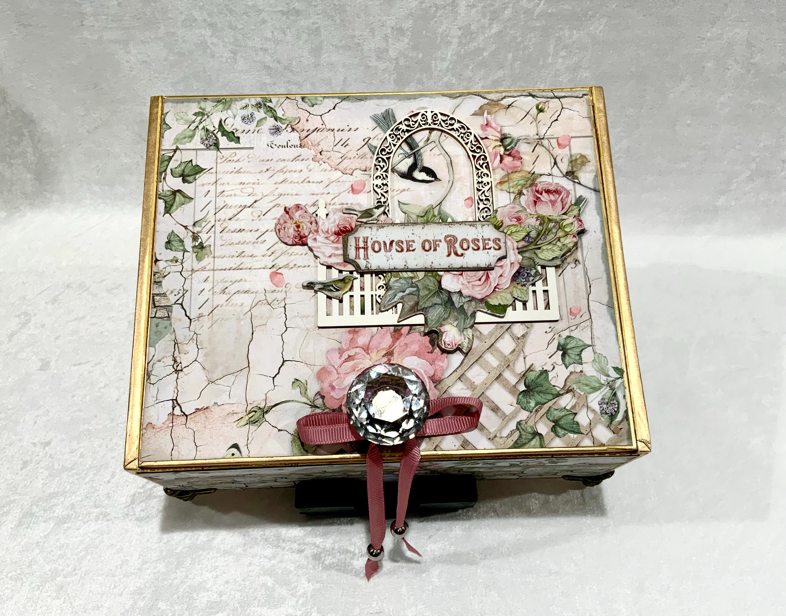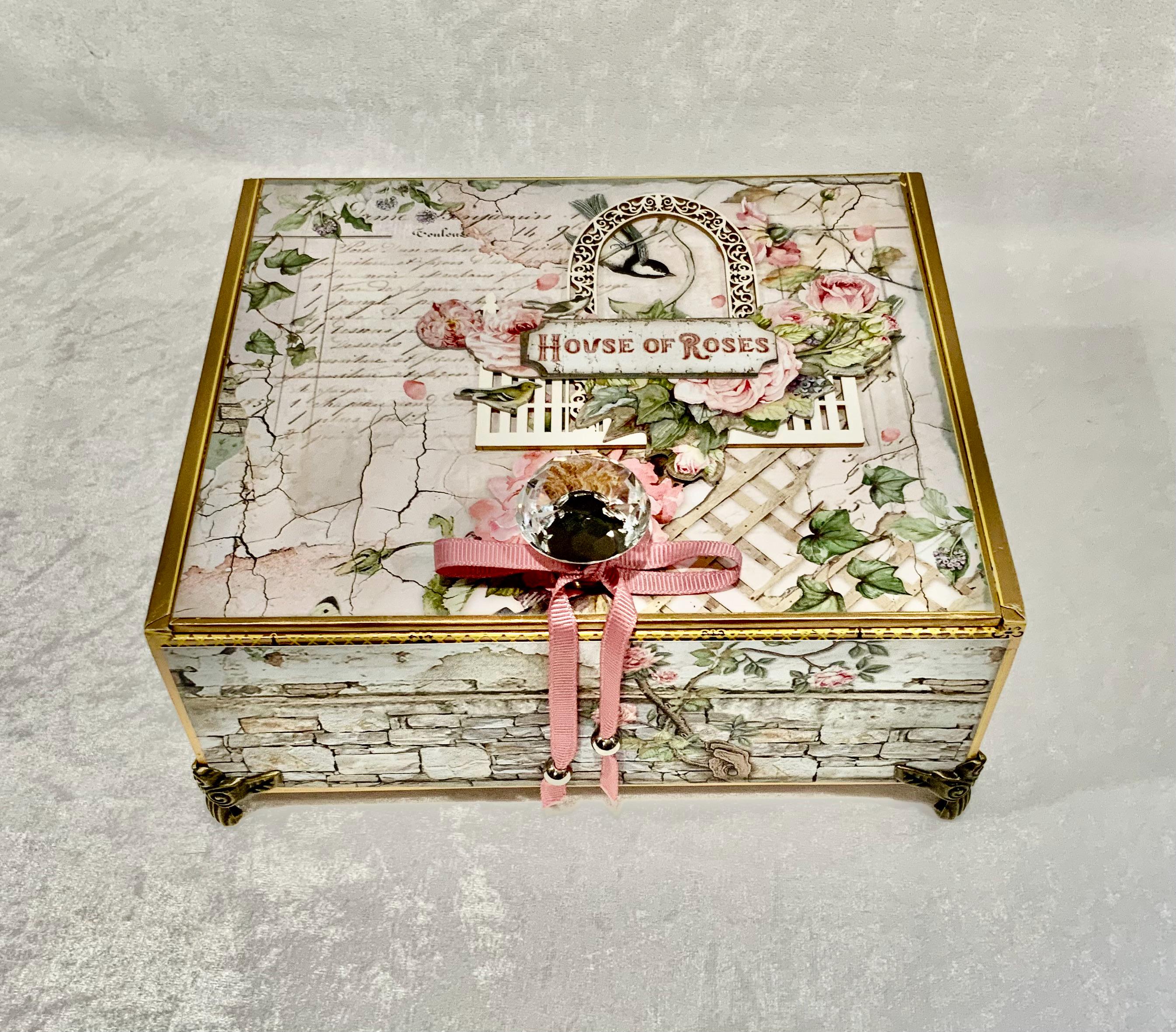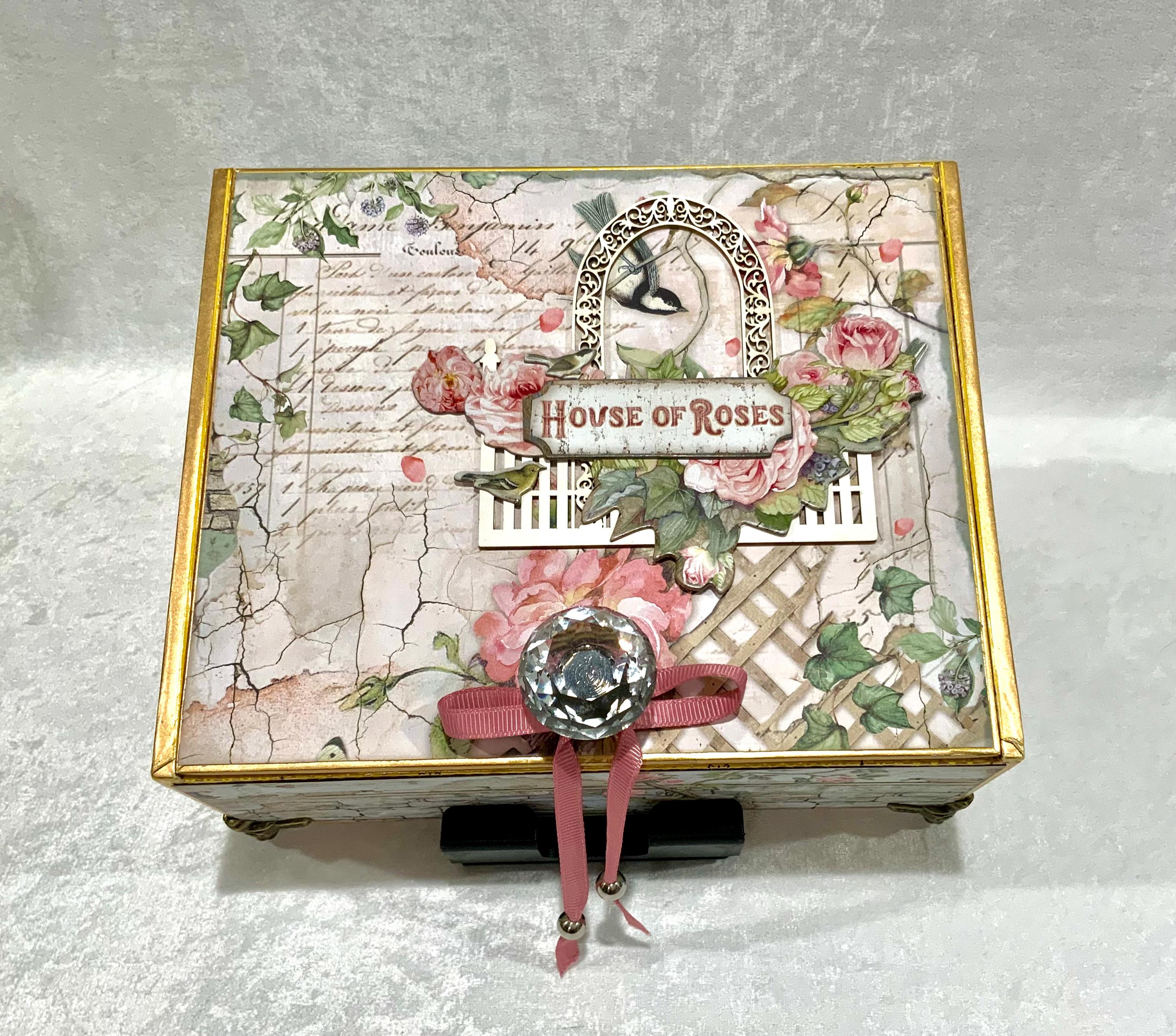 Step into a dreamy garden with this romantic “House of Roses” decorated cigar box by My Little Pretties USA. This upcycled wooden cigar box features lush pink roses, ivy-covered lattice, and a bird framed by a vintage arch. The elegant crystal knob and gold accents add a touch of cottage glamour.