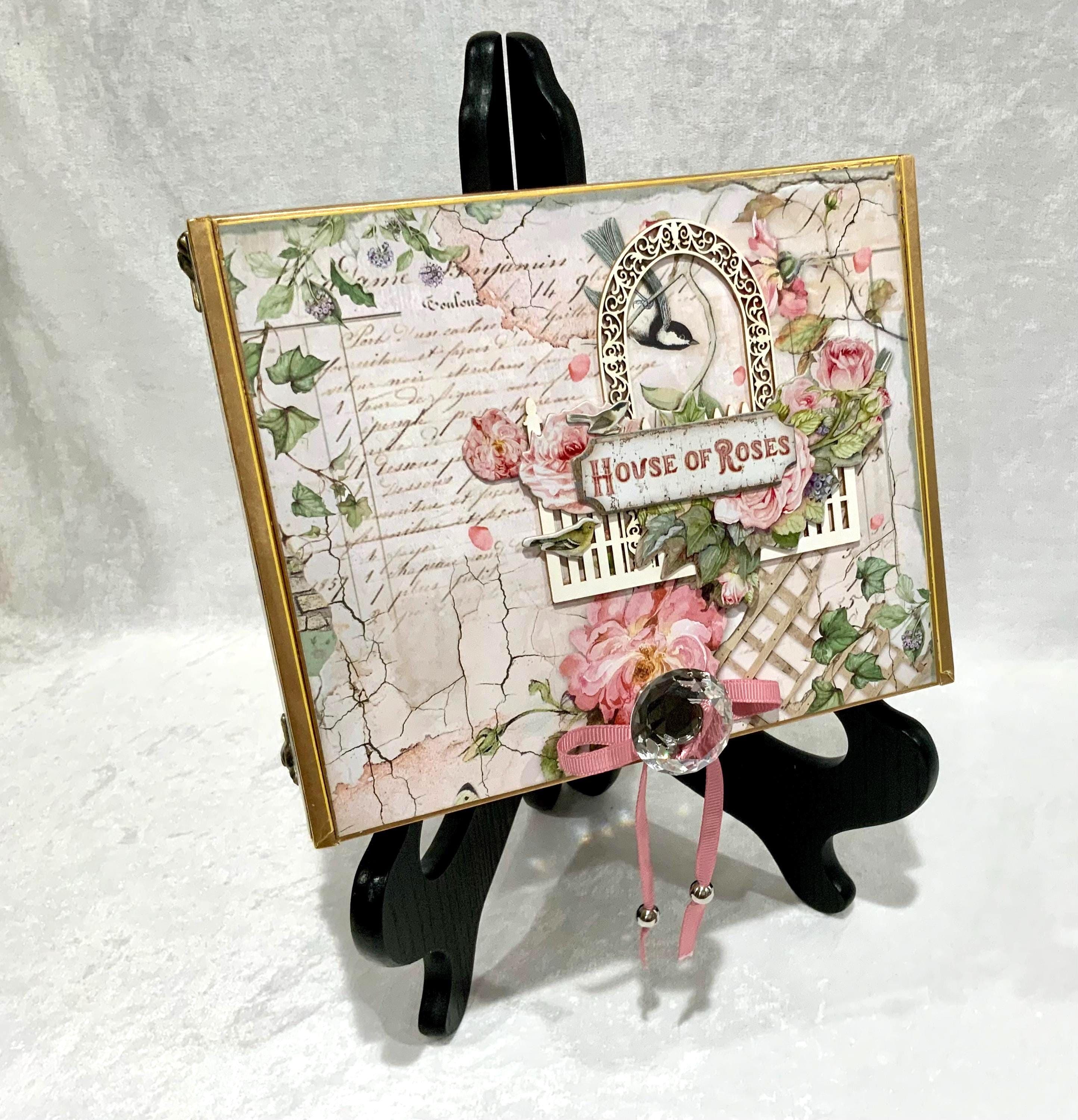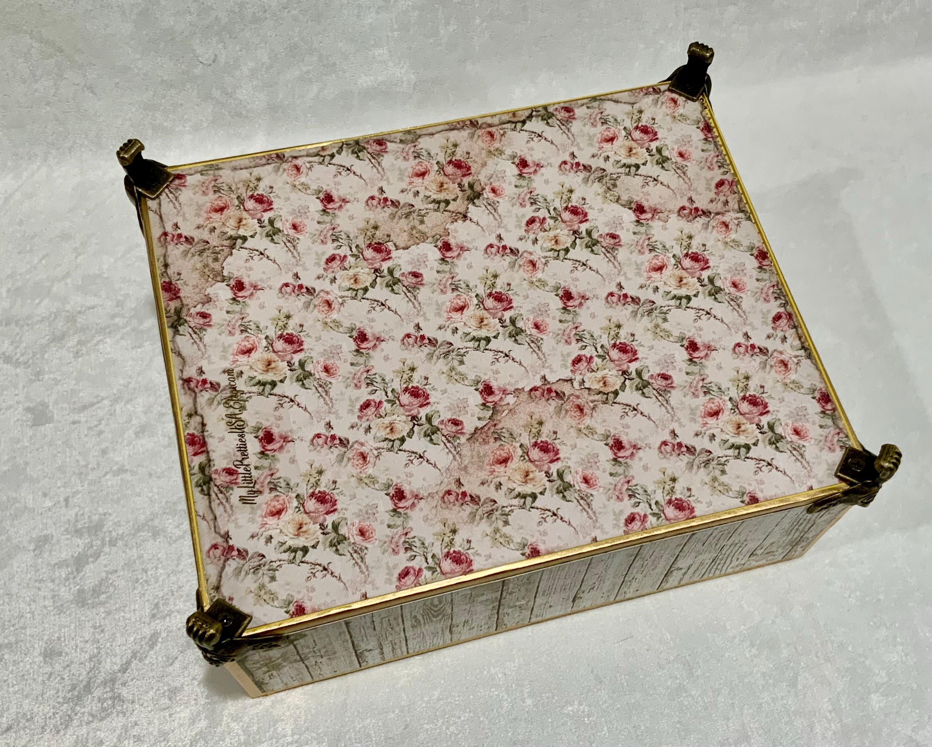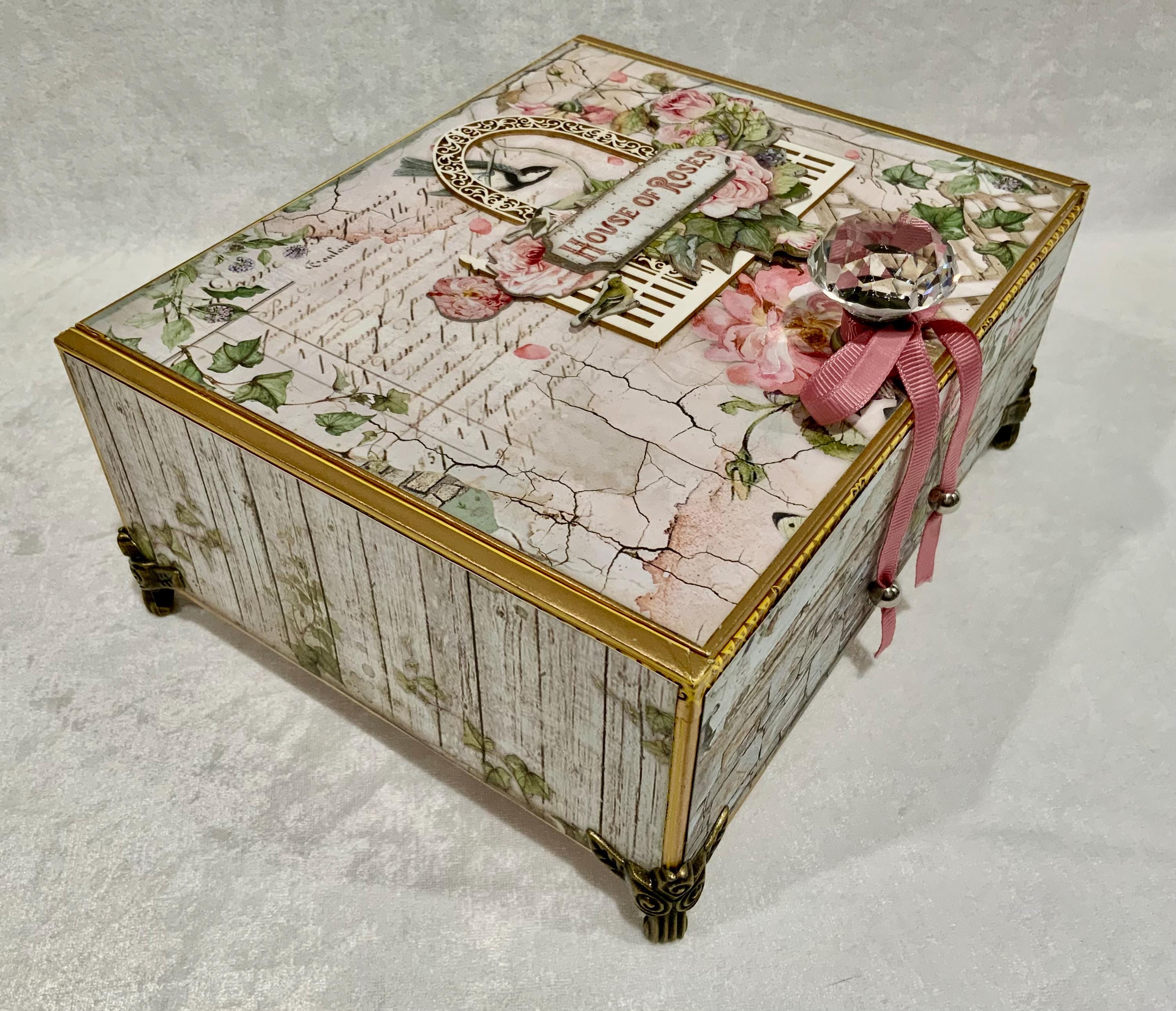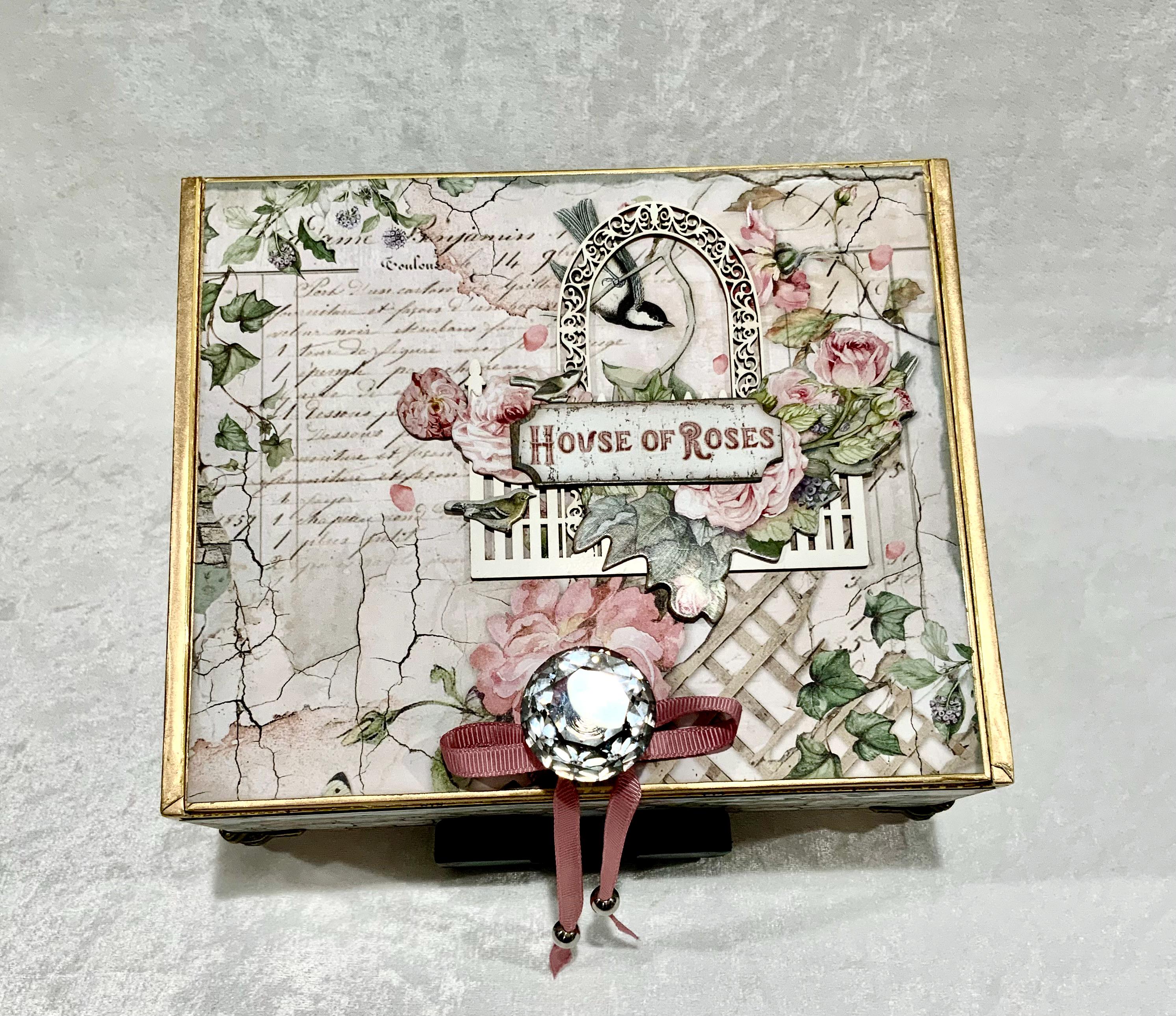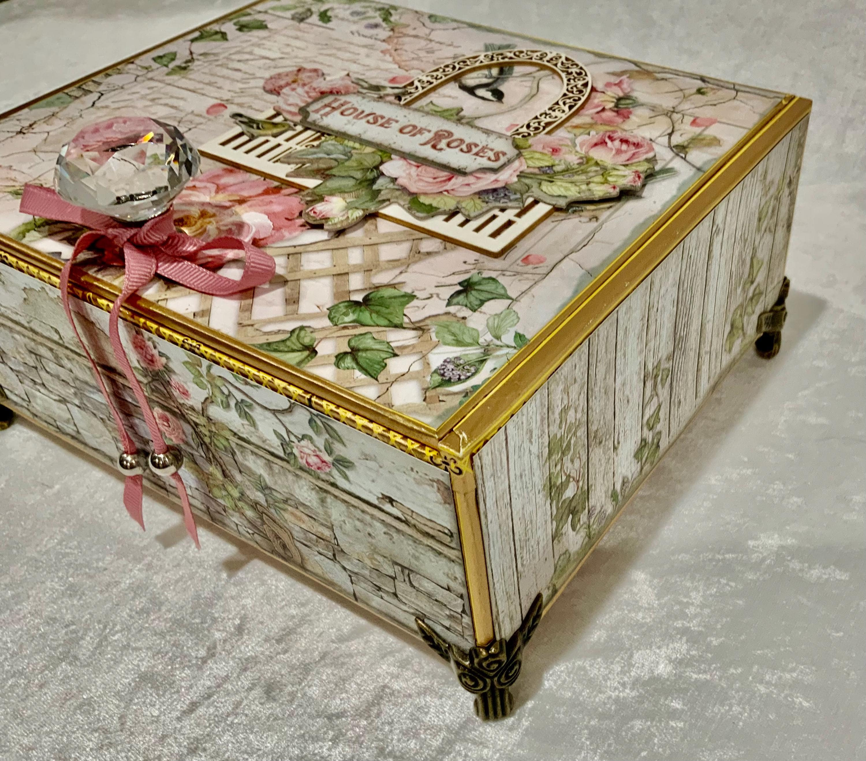 Step into a dreamy garden with this romantic “House of Roses” decorated cigar box by My Little Pretties USA. This upcycled wooden cigar box features lush pink roses, ivy-covered lattice, and a bird framed by a vintage arch. The elegant crystal knob and gold accents add a touch of cottage glamour.