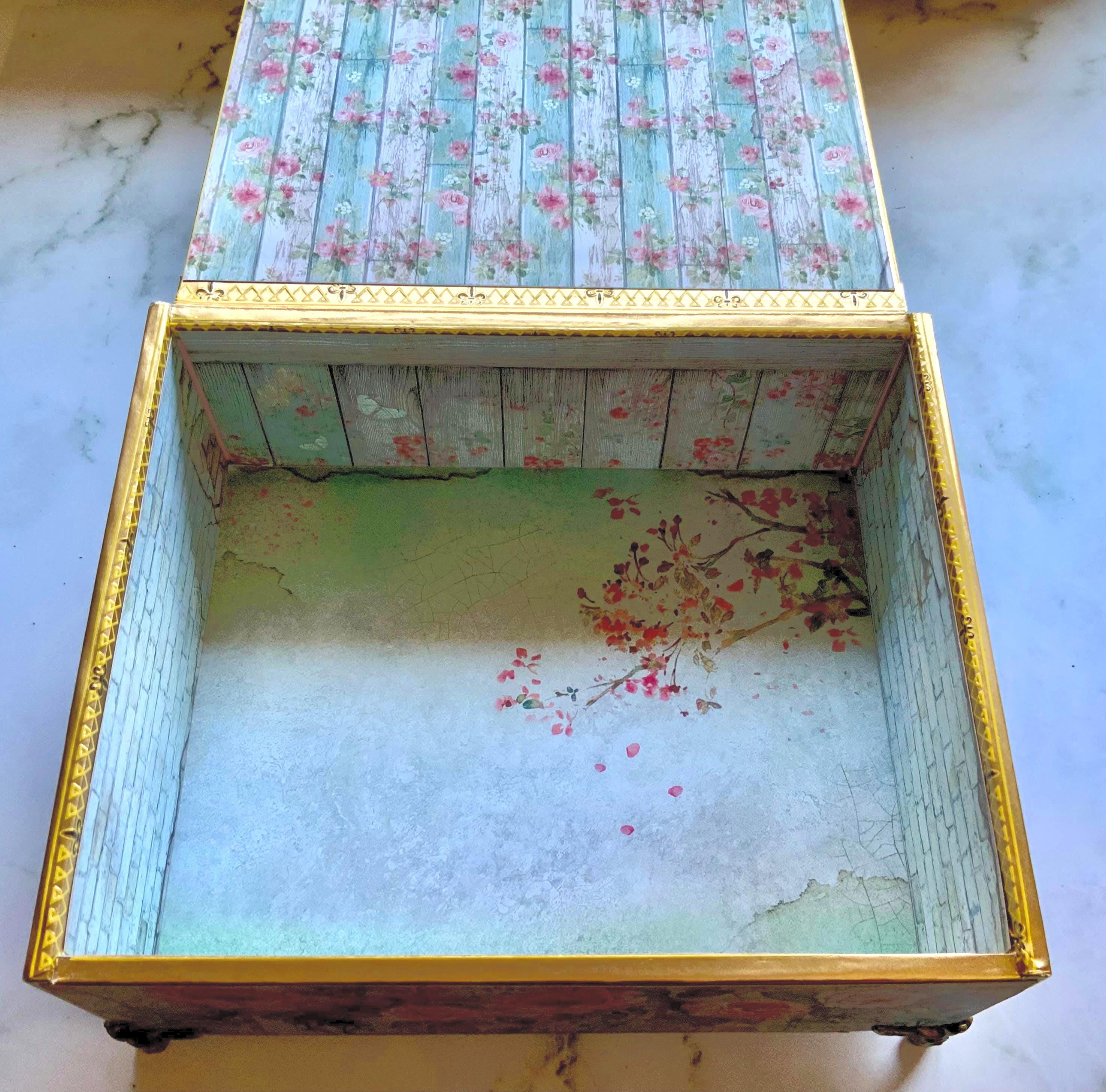 Finished with a gleaming crystal knob and ornate gold trim, the interior reveals more soft florals on weathered wood backgrounds. A perfect place to store treasured memories, jewelry, or love notes—this box is as beautiful inside as it is outside.