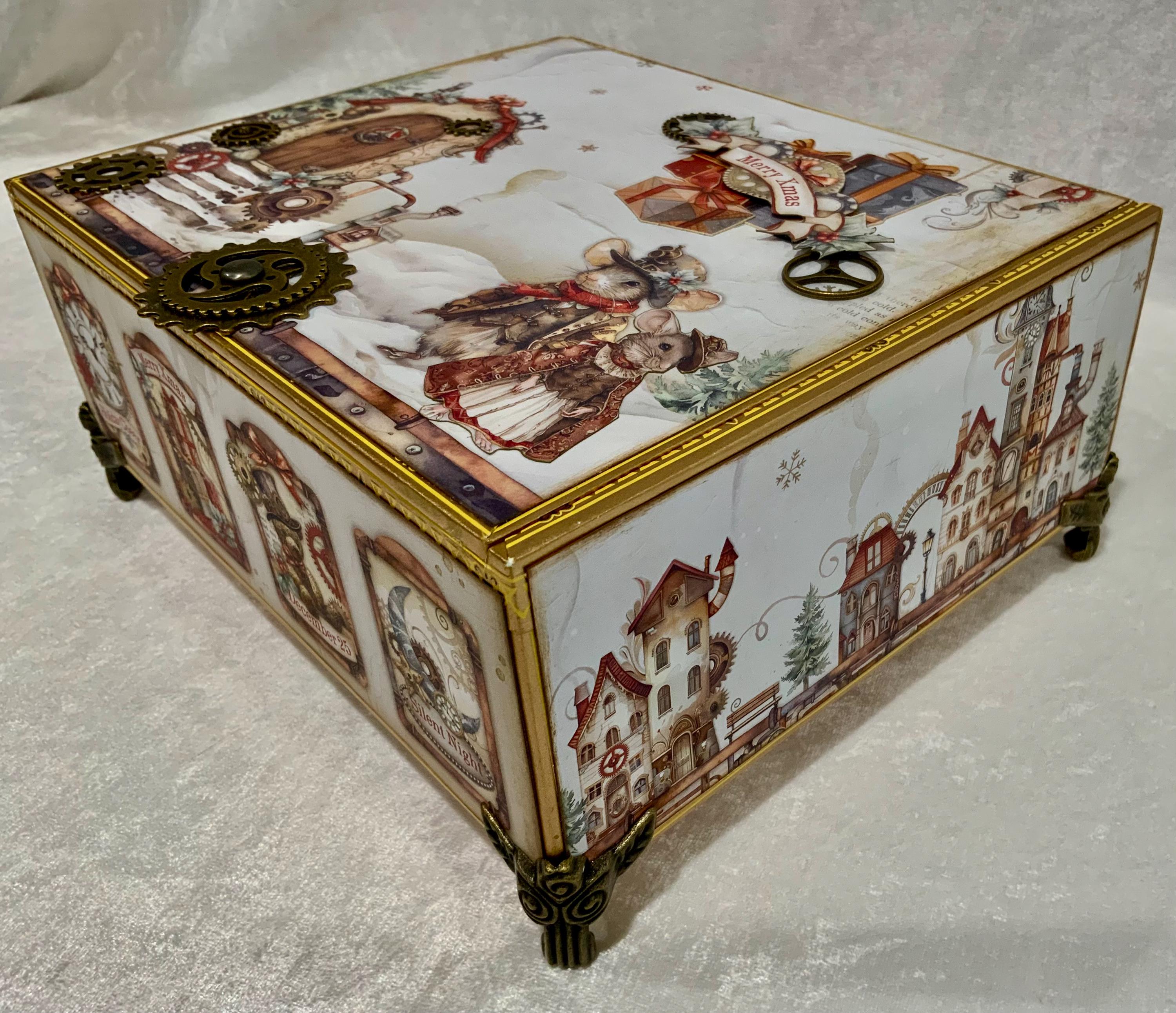 The box size will be apx 8x7x3”. I used metal feet and for the handle, I used 2 gears stacked together. I also used metal gears to decorate the lid, plus other adornments and embellishments.
