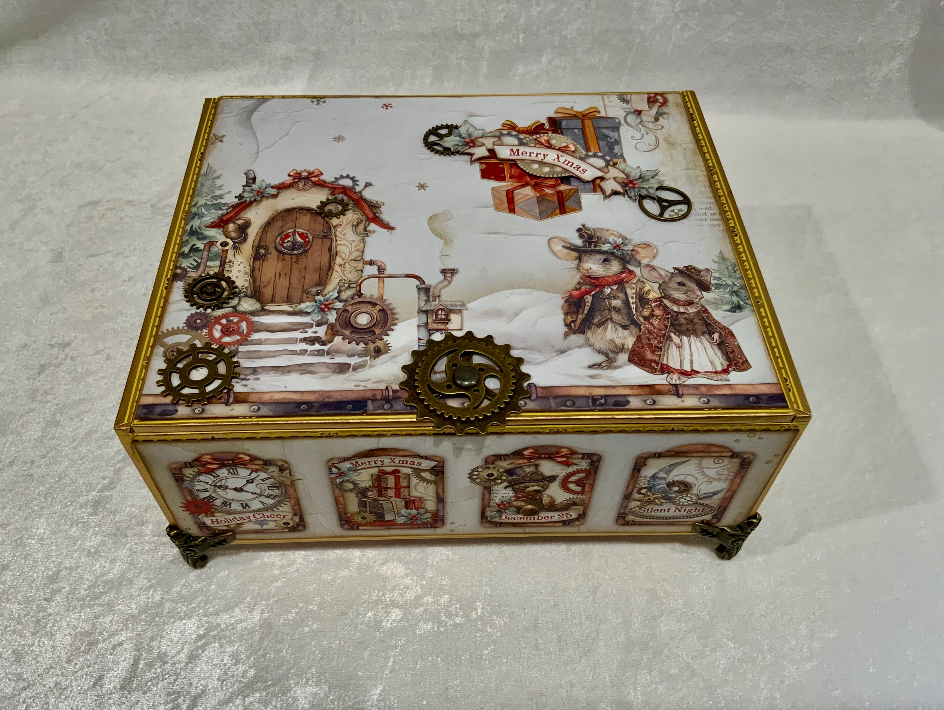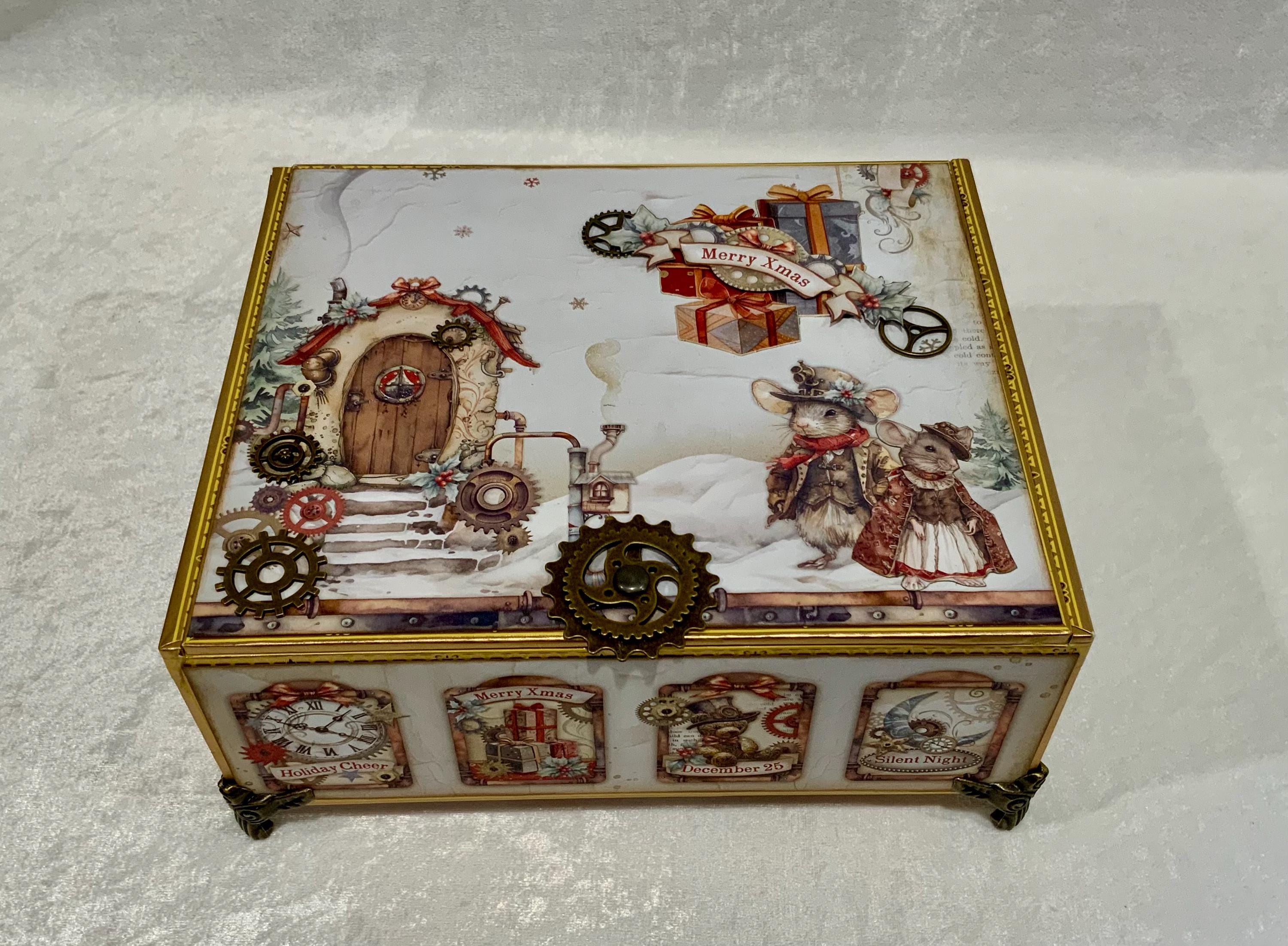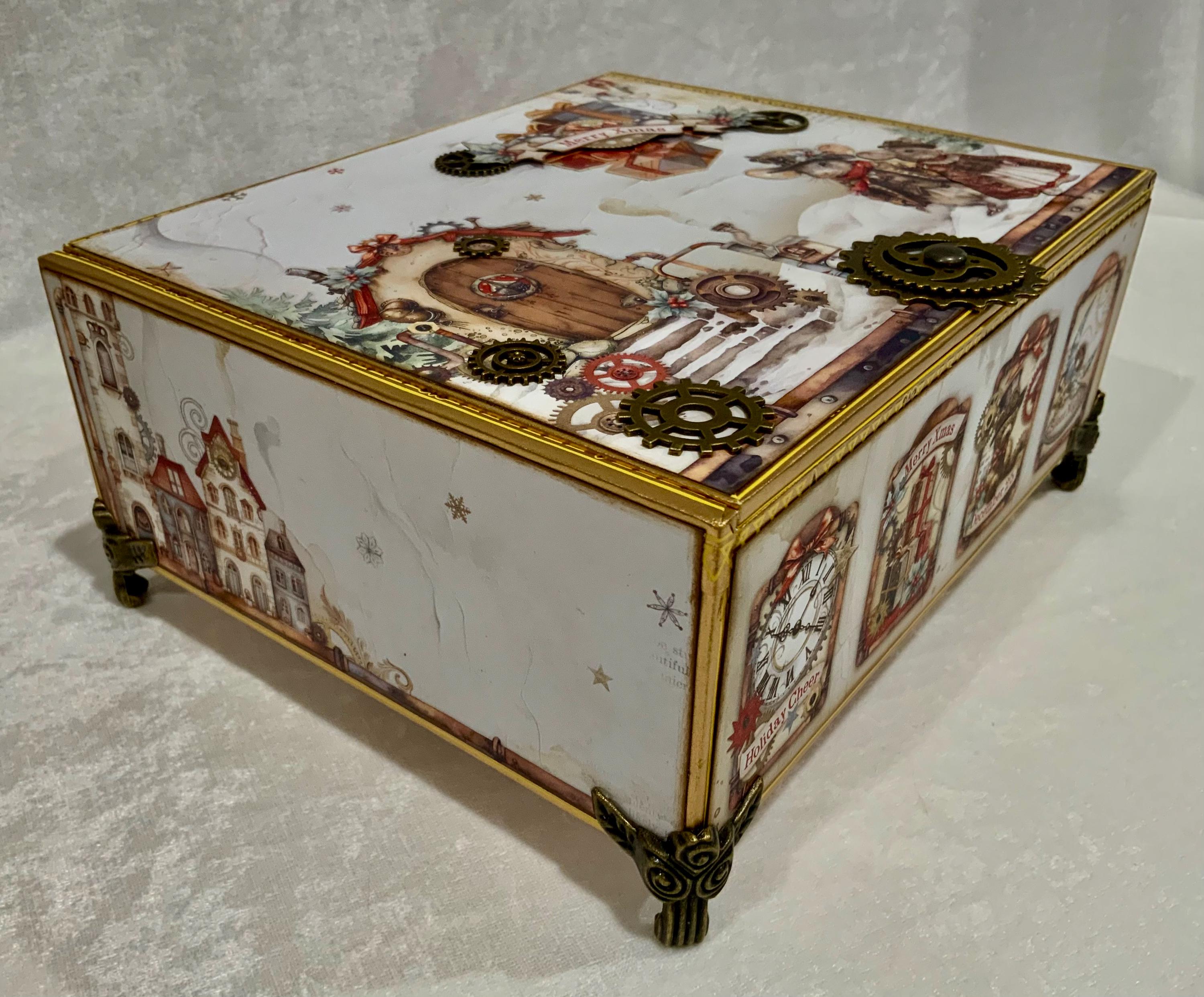 Celebrate the holidays with a twist! This one-of-a-kind decorated cigar box features a whimsical steampunk Christmas theme with Santa, gears, and vintage-style details. Inside, a festive advent calendar design and gear-trimmed tree make this box perfect for holiday storage, seasonal decor, or gifting. Accents include metal embellishments, intricate paper layering, and vintage-inspired characters – all handcrafted in a sturdy upcycled cigar box with elegant metal feet.