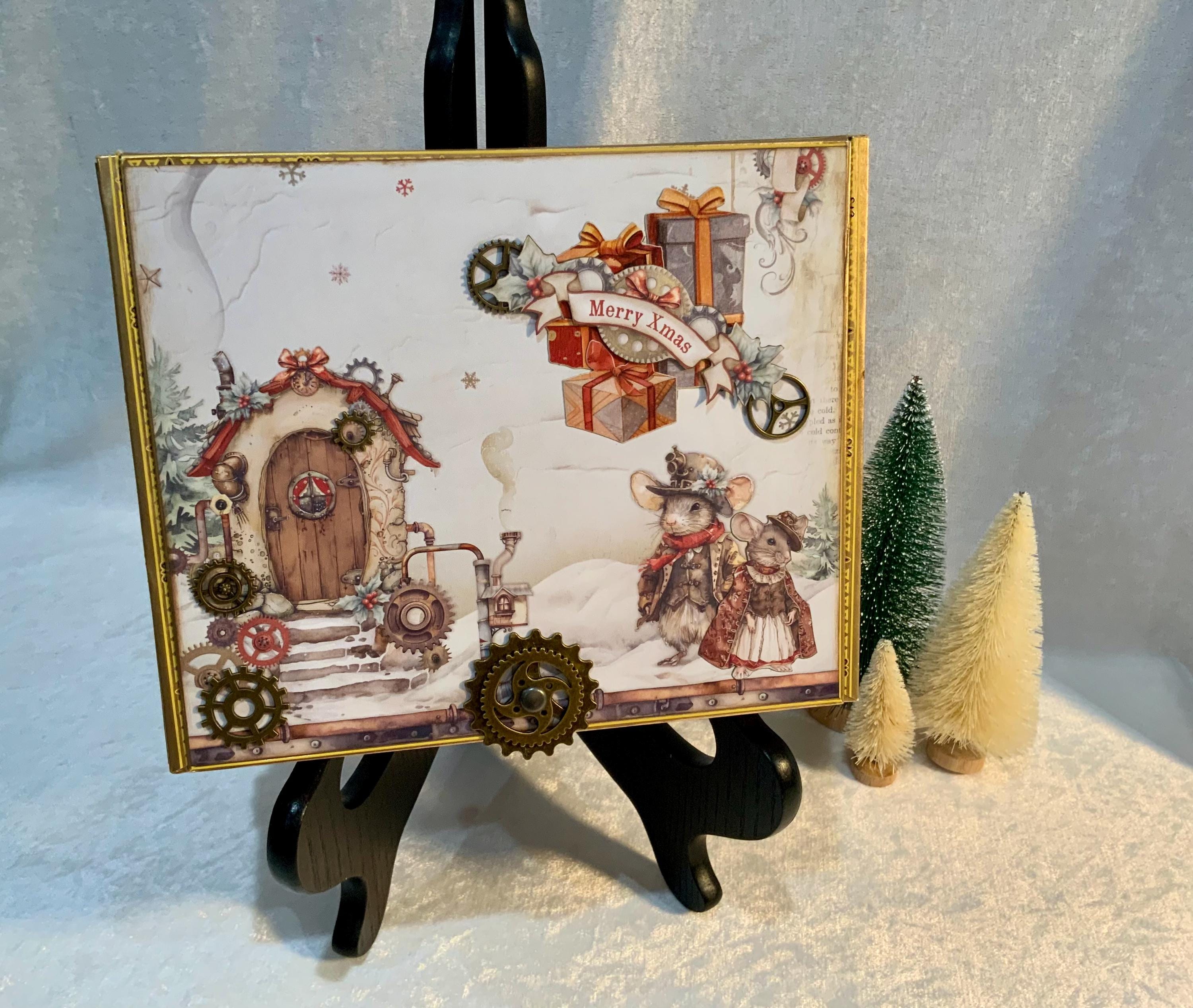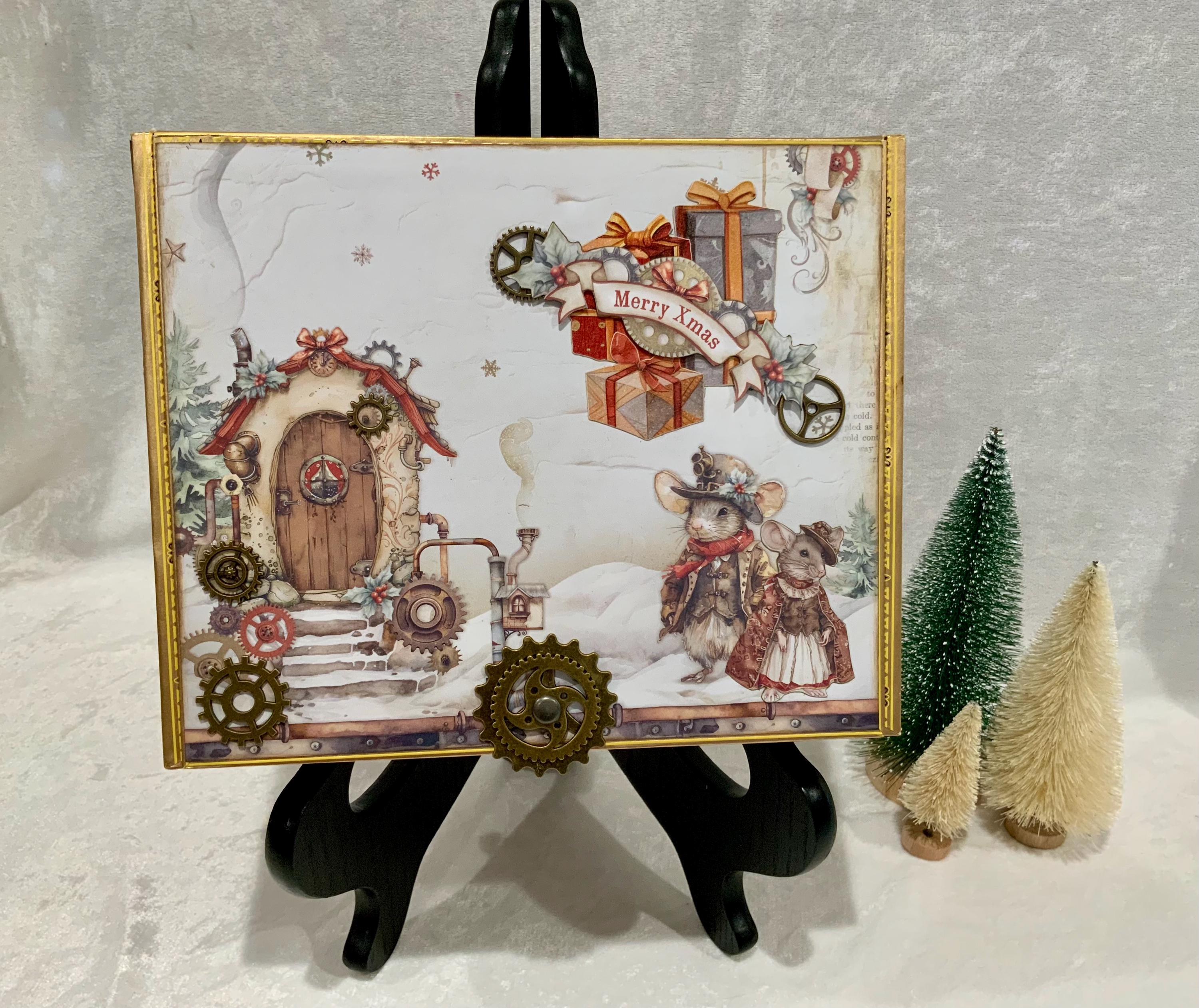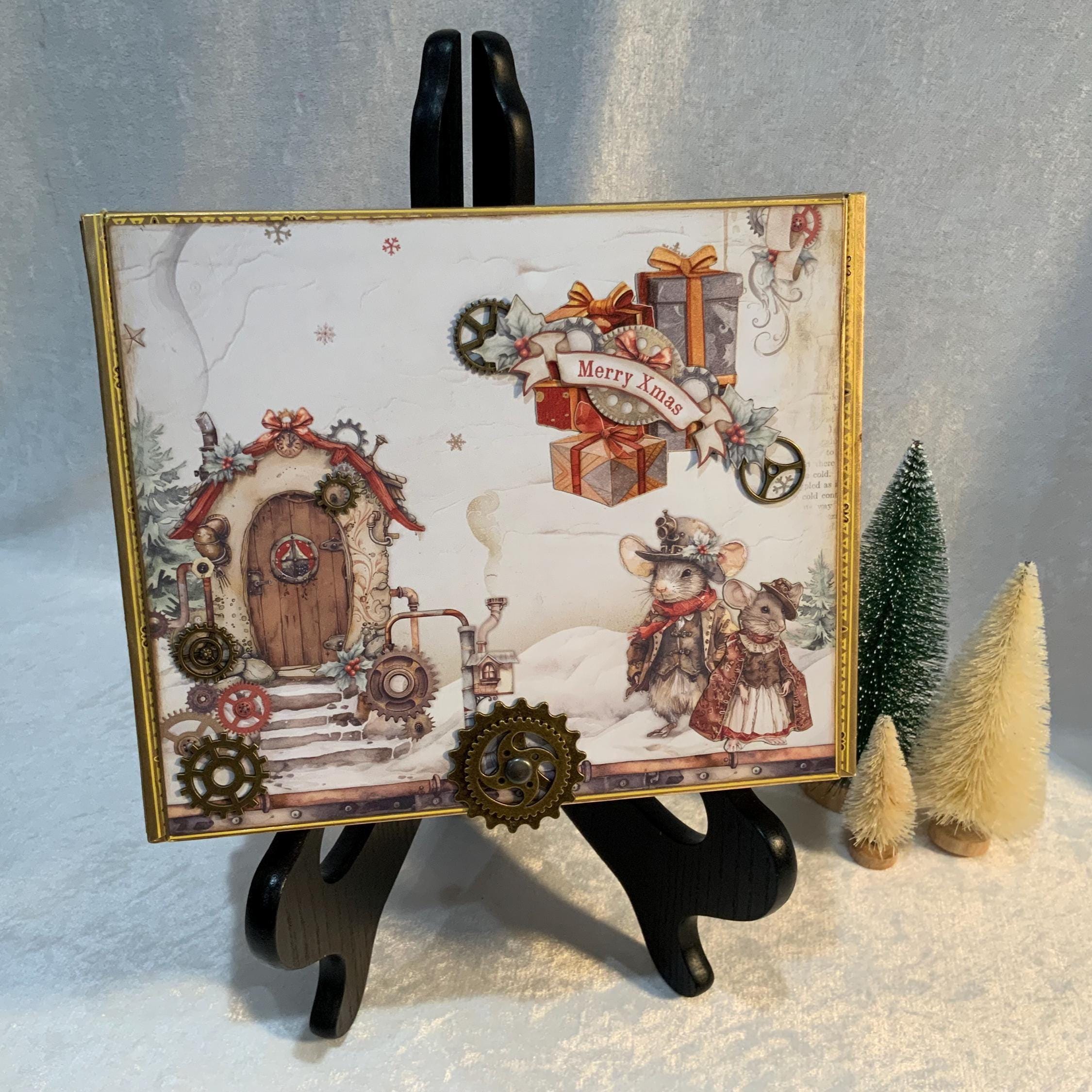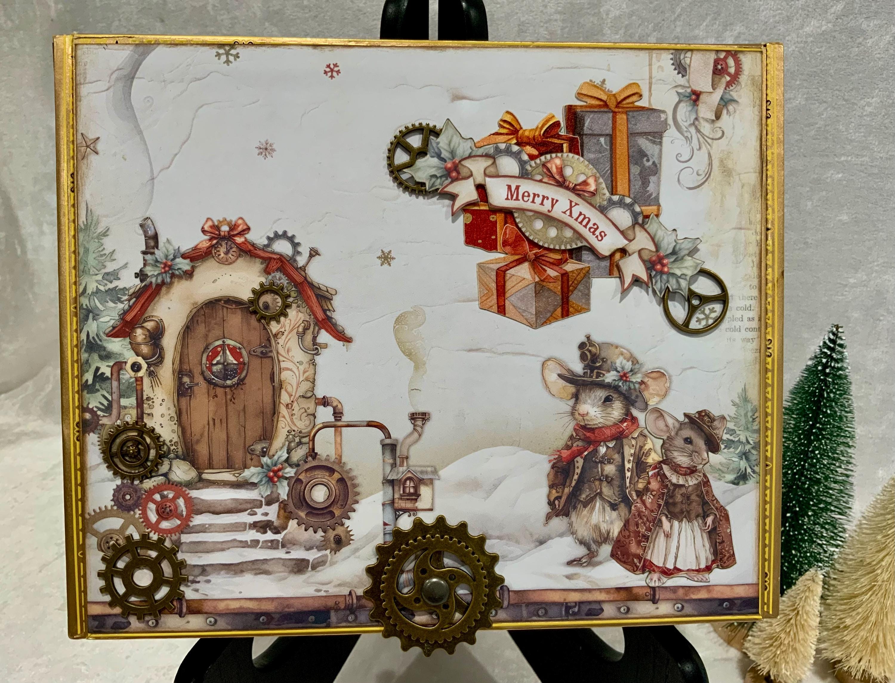 Celebrate the holidays with a twist! This one-of-a-kind decorated cigar box features a whimsical steampunk Christmas theme with Santa, gears, and vintage-style details. Inside, a festive advent calendar design and gear-trimmed tree make this box perfect for holiday storage, seasonal decor, or gifting. Accents include metal embellishments, intricate paper layering, and vintage-inspired characters – all handcrafted in a sturdy upcycled cigar box with elegant metal feet.