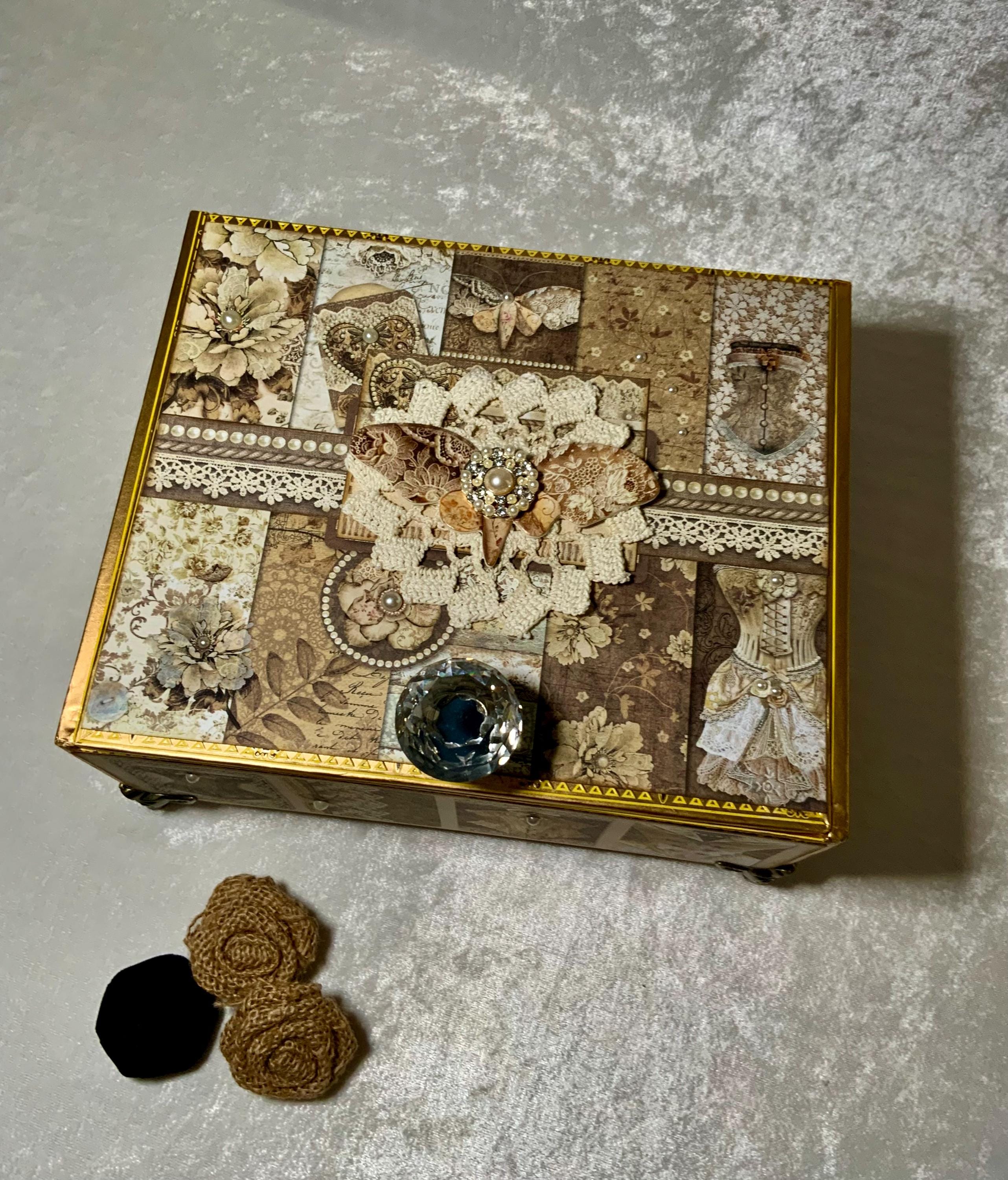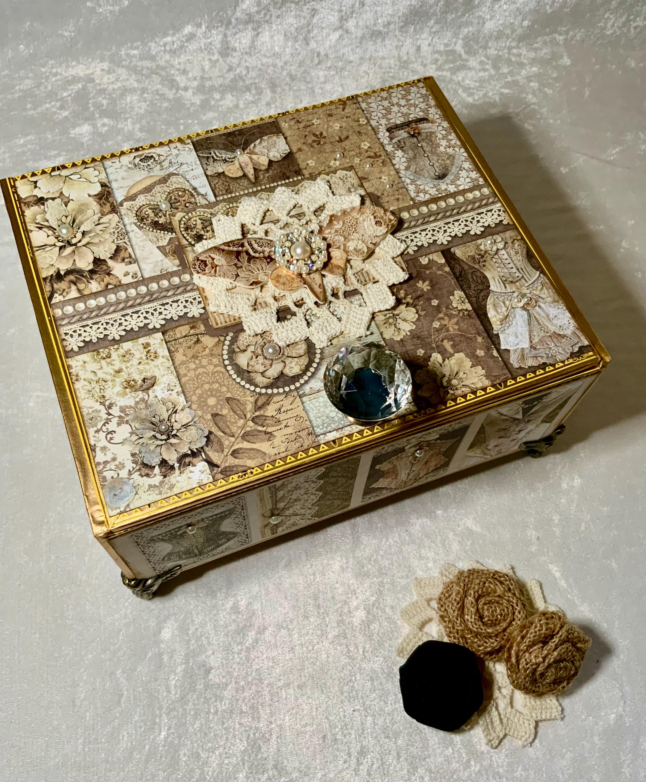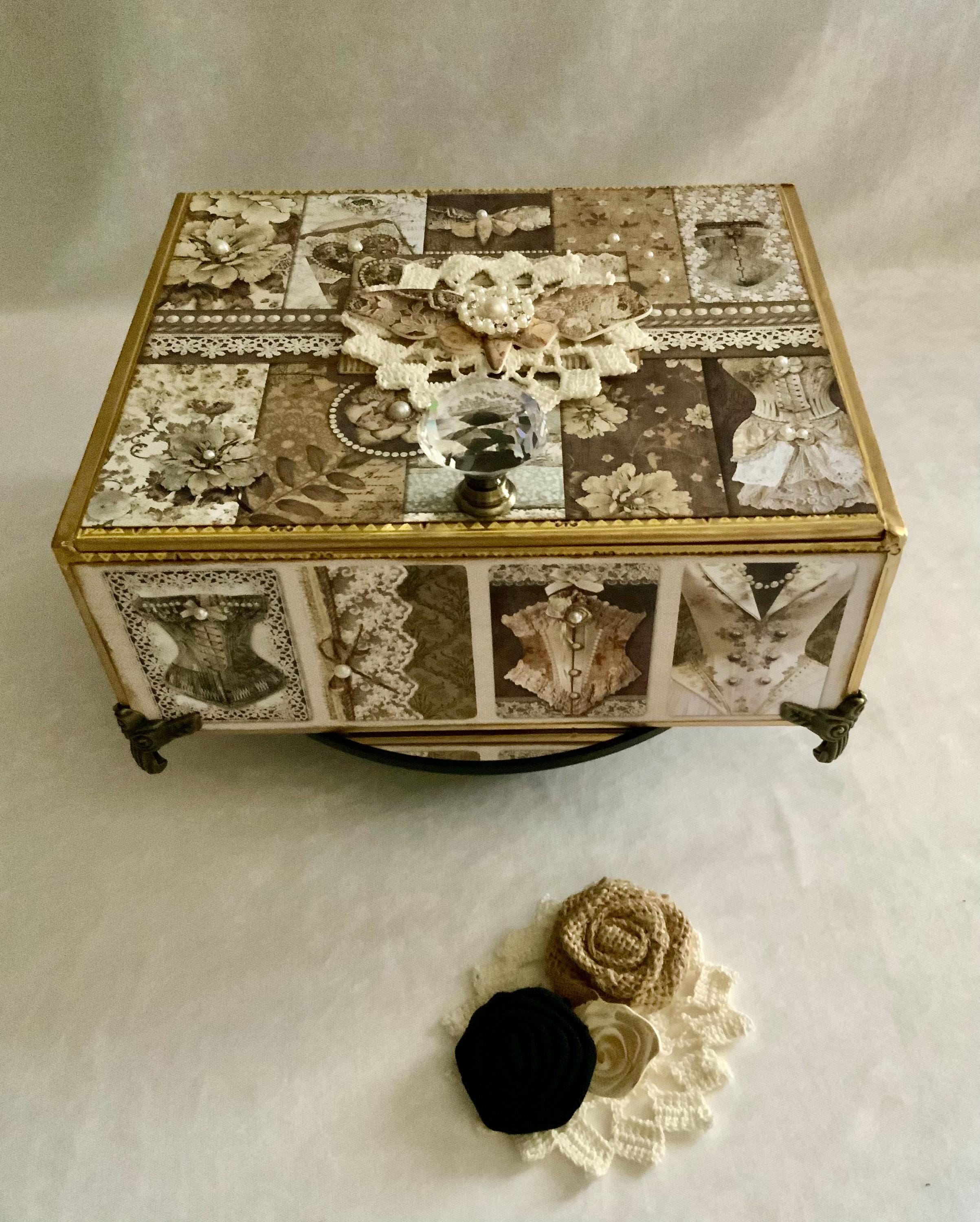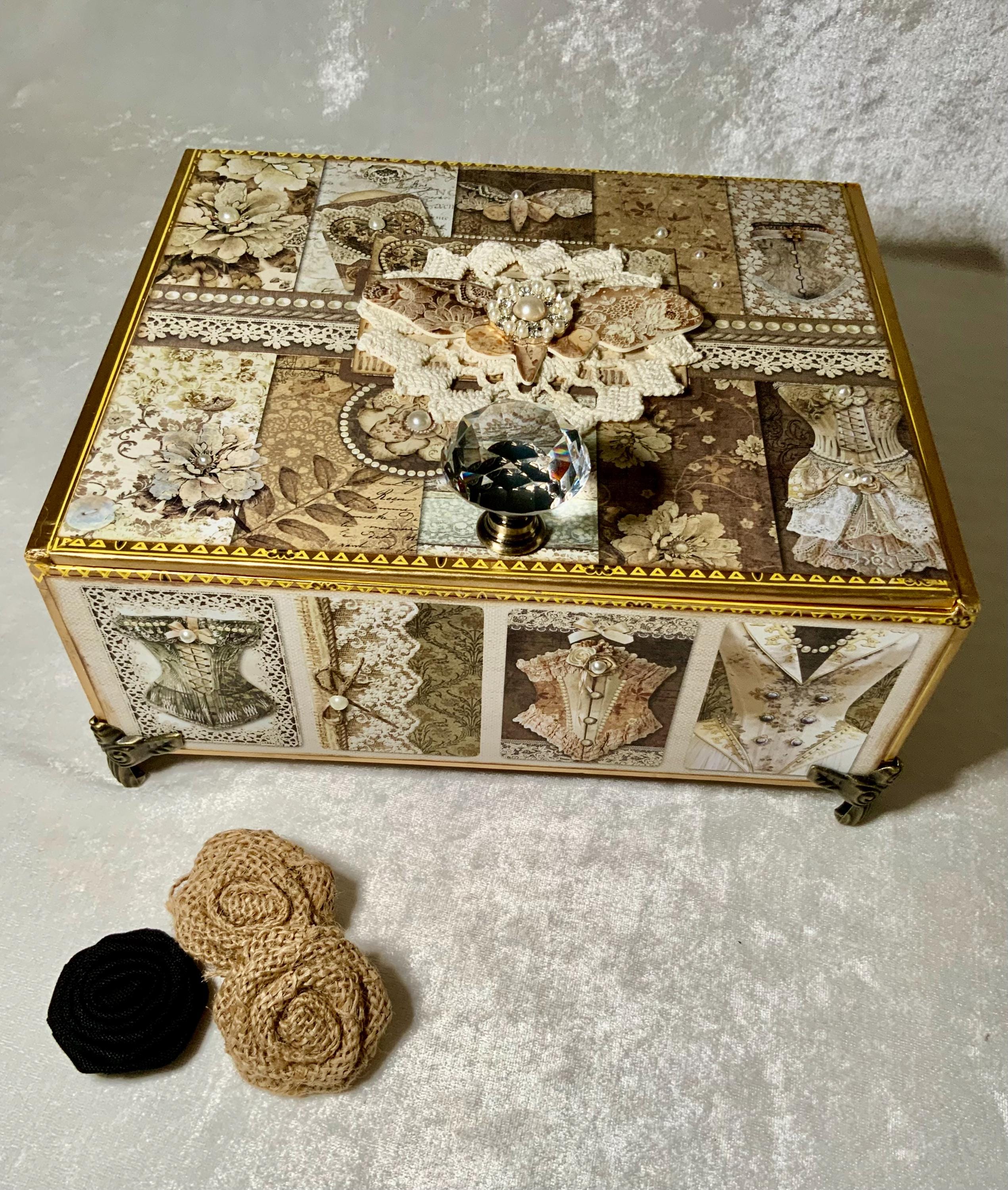 This one-of-a-kind decorated cigar box is transformed into a romantic Victorian keepsake with exquisite vintage flair. The lid and interior feature rich antique-style collage art with lace, florals, and corset motifs. Dimensional embellishments like a crystal knob, faux pearls, crochet appliqué, and delicate lace add depth and charm.