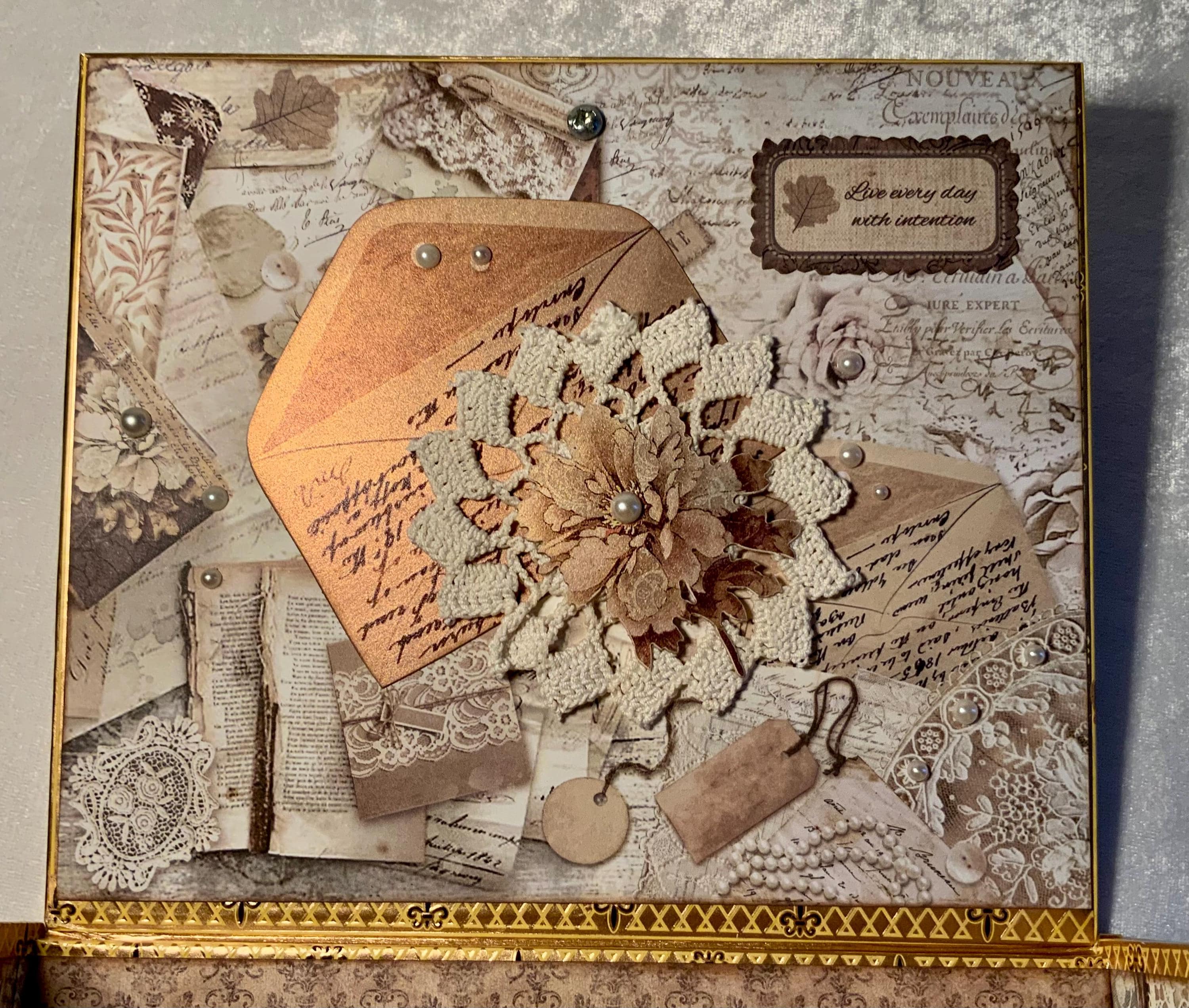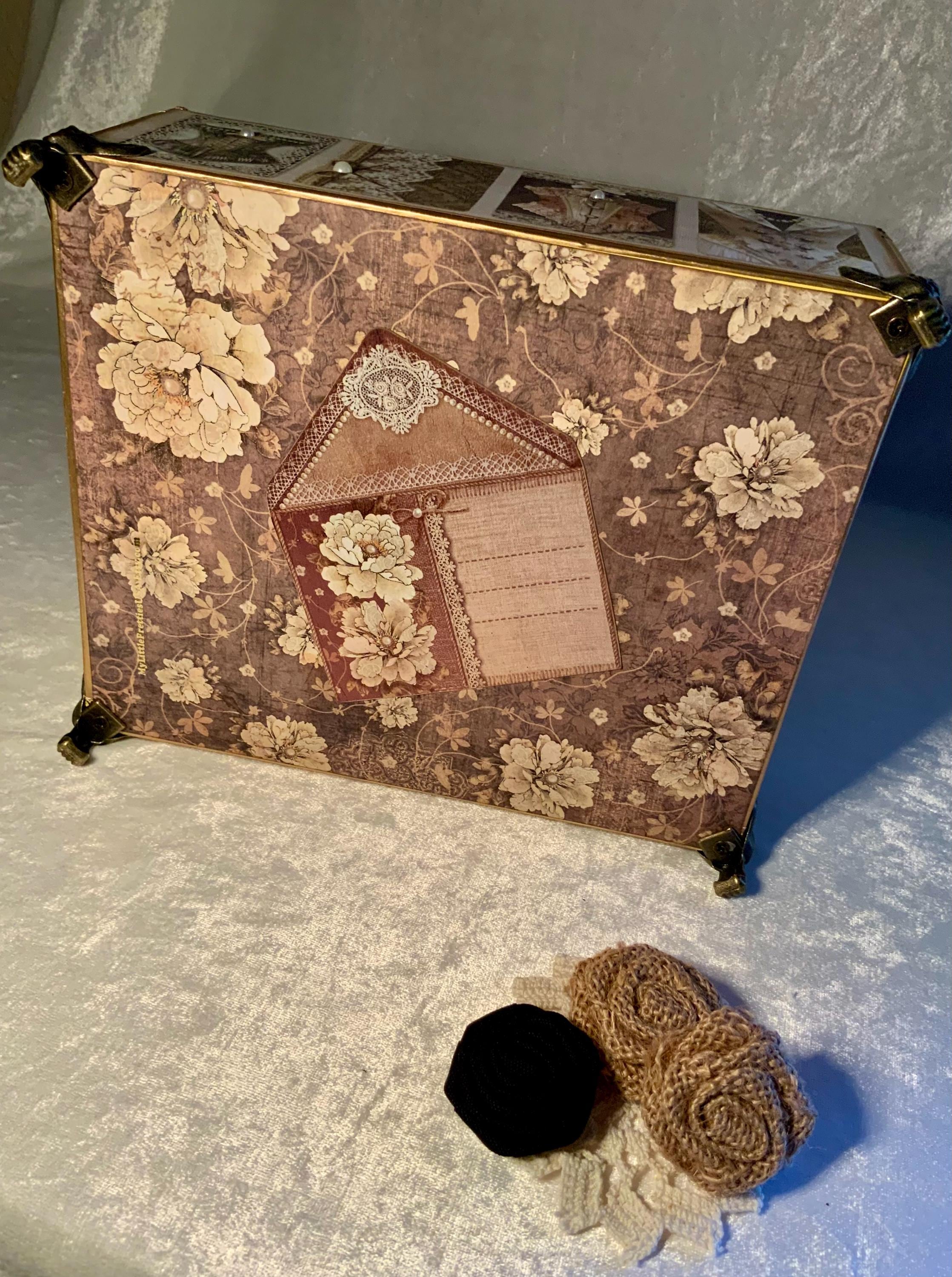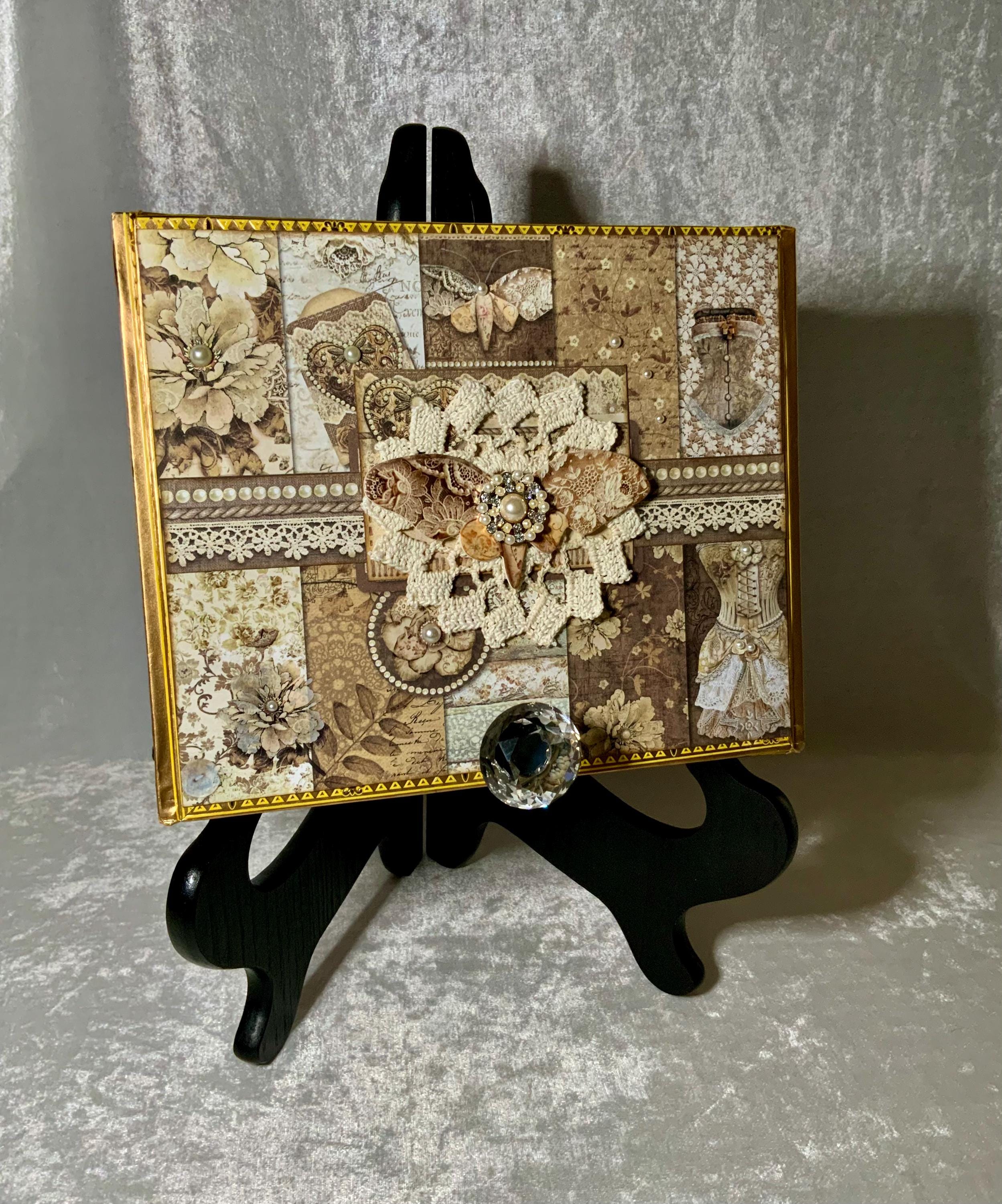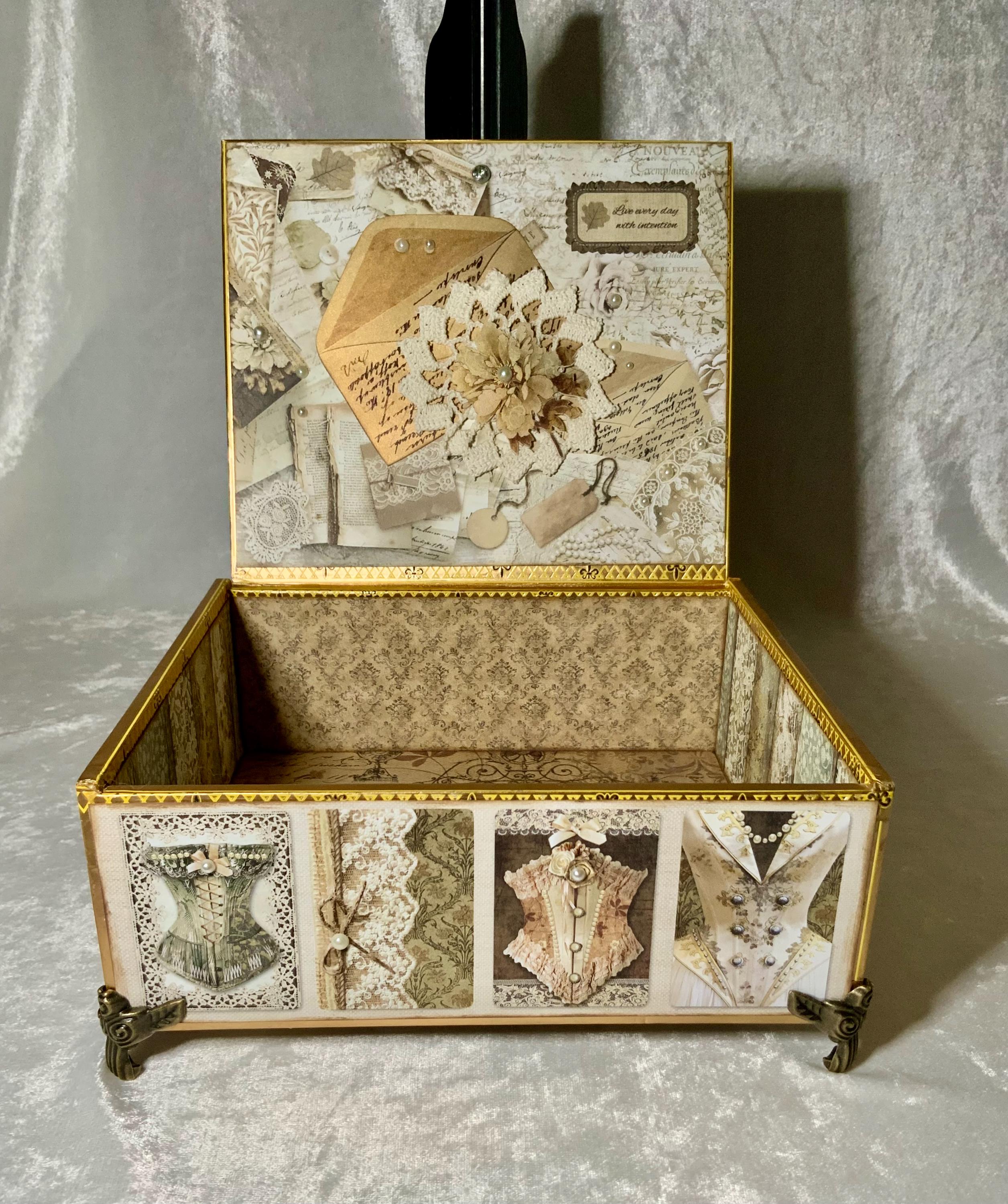This one-of-a-kind decorated cigar box is transformed into a romantic Victorian keepsake with exquisite vintage flair. The lid and interior feature rich antique-style collage art with lace, florals, and corset motifs. Dimensional embellishments like a crystal knob, faux pearls, crochet appliqué, and delicate lace add depth and charm.