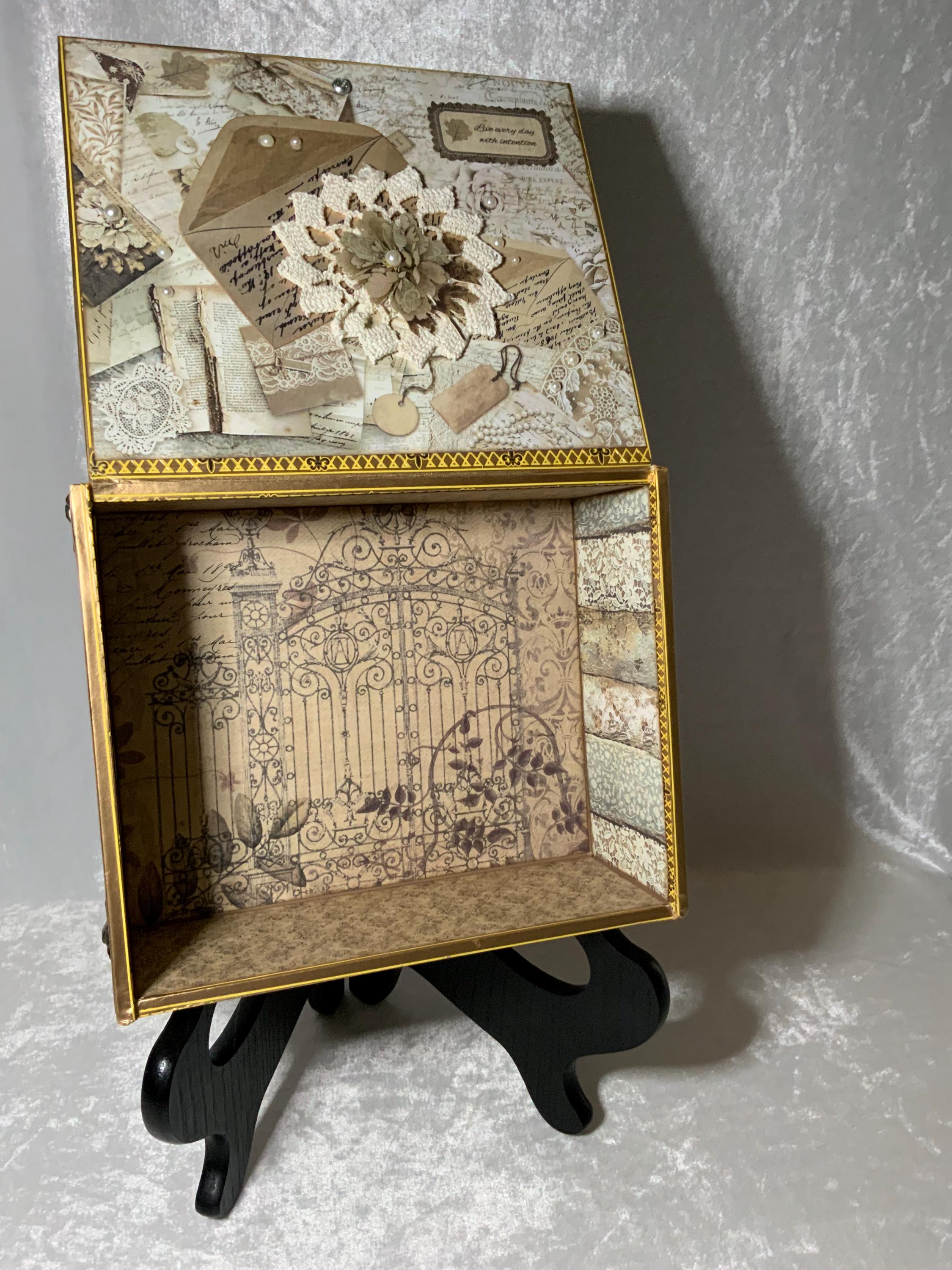 All of my keepsake boxes are authentic upcycled cigar boxes. I carefully select the best ones to decorate, and most surfaces are covered with premium papers, trims, and embellishments. For my Camacho “piano finish” boxes, the glossy black lids may show faint surface scratches from their original life — these are minor and add to the authentic character of the box.