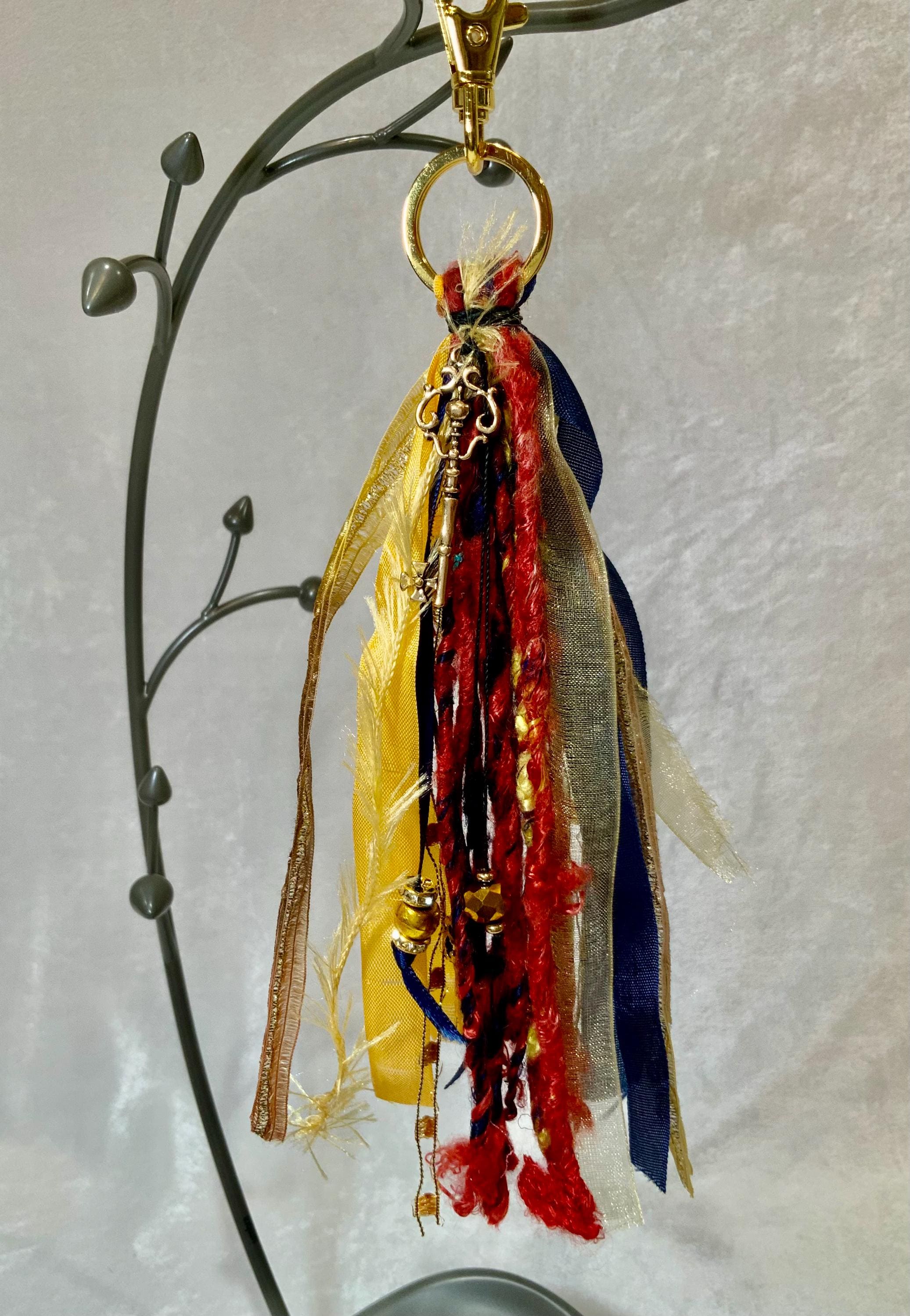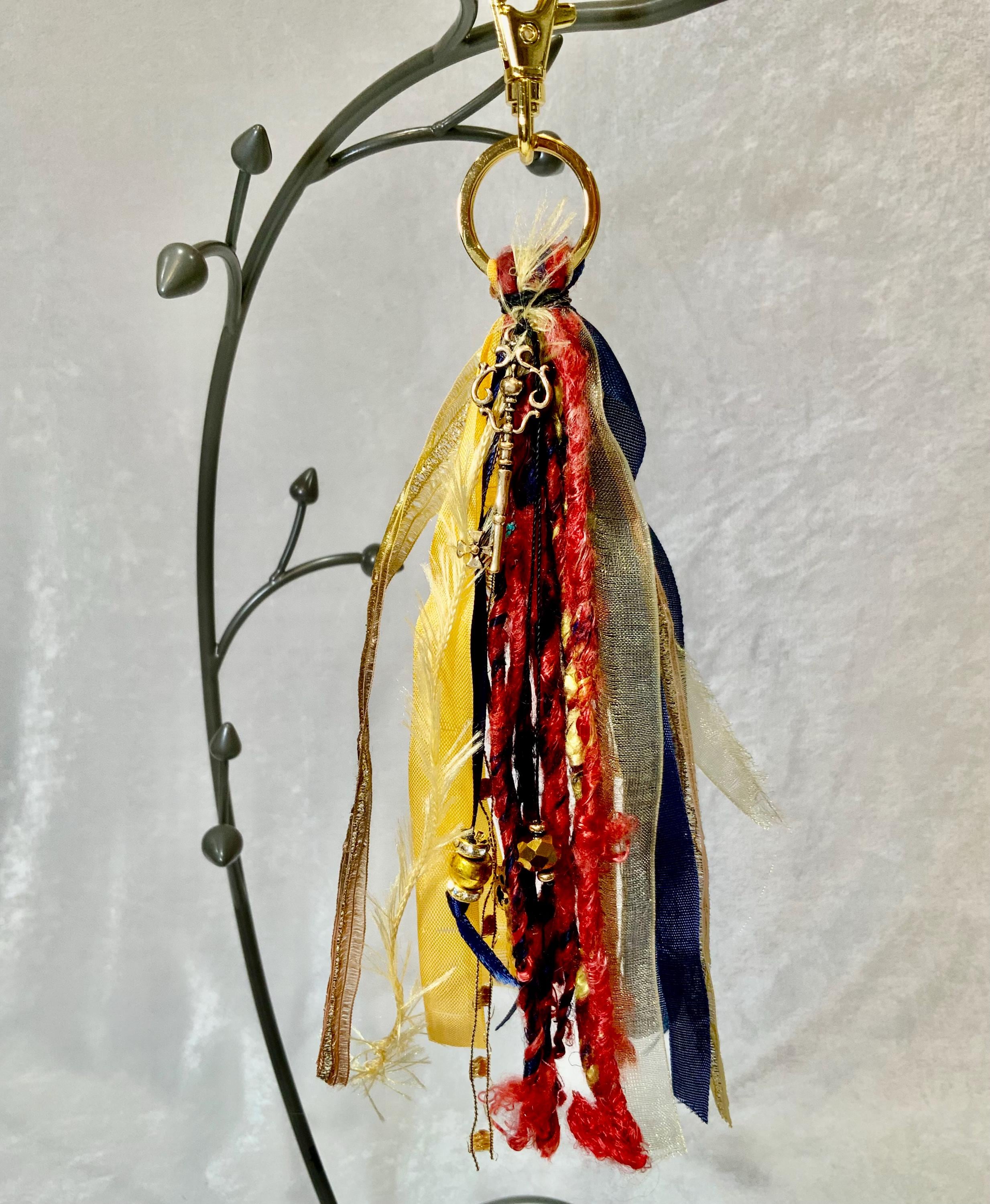 Step into a world of royal elegance with this mixed-fiber tassel bag charm, handcrafted in a striking palette of red, gold, and navy. Finished with antique-style keys and shimmering gold beads, this tassel is layered with satin ribbons, textured yarns, and specialty trims that add both movement and richness.