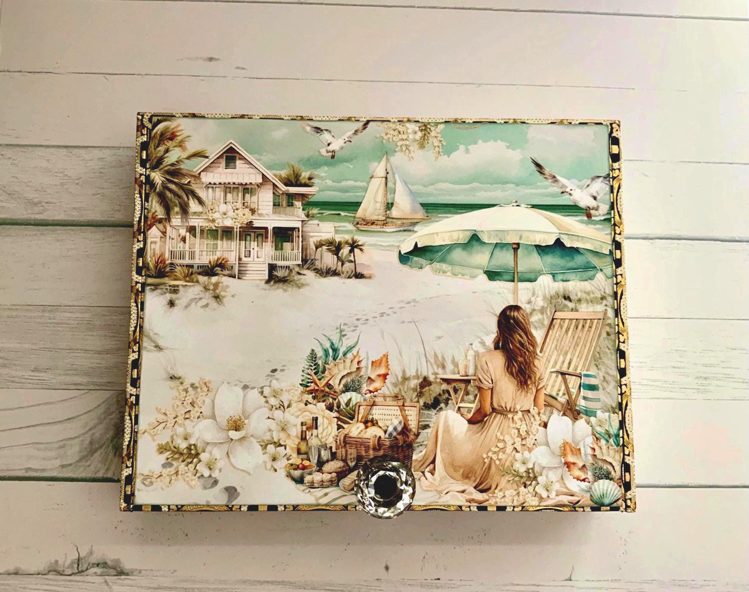 This serene beach scene features soft aqua waters, sandy neutrals, and peaceful coastal imagery, creating a refined beach house accent that is both decorative and functional. The box is perfect for storing treasured keepsakes, jewelry, photos, or small mementos.