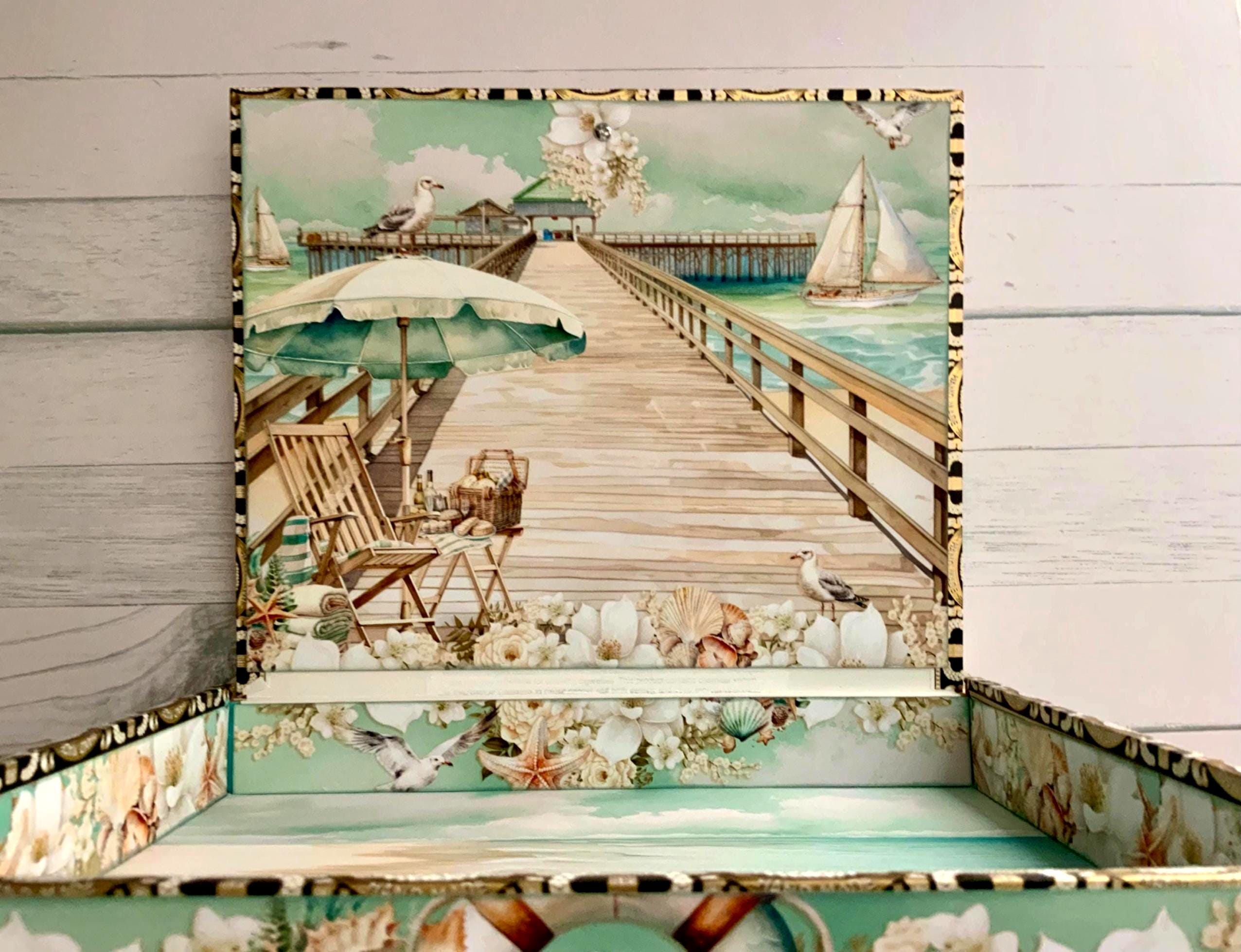 Bring the calm beauty of the seaside into your home with this elegant coastal decorated cigar box, thoughtfully handcrafted using the beautiful Mintay Coastal Memories paper collection.