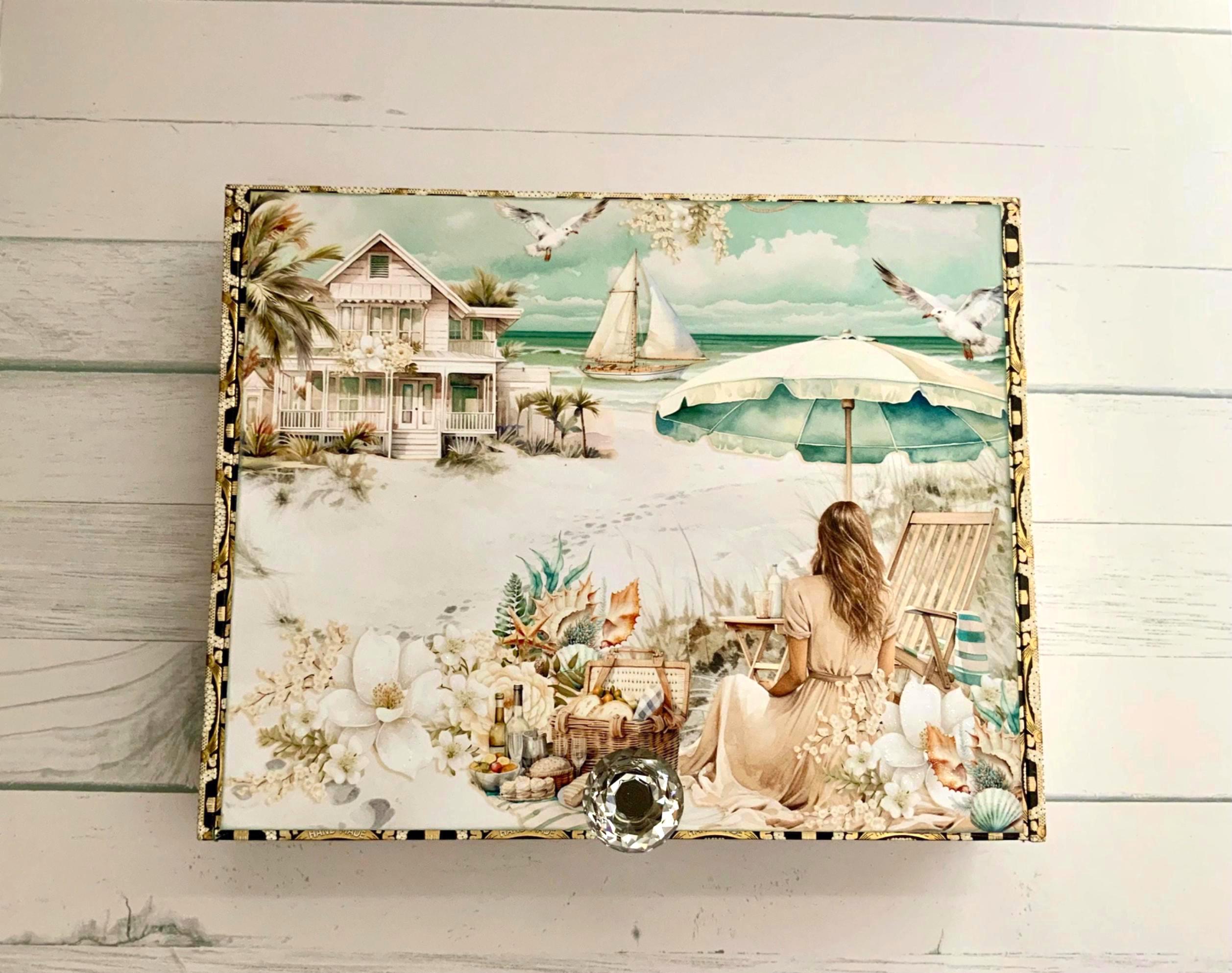 Bring a touch of the seaside into your home with this beautifully altered, upcycled cigar box featuring a vintage-inspired beach scene. Perfect as a coastal jewelry box, keepsake holder, or one-of-a-kind gift box, this handmade piece evokes breezy beach cottages and nautical charm. Feminine and timeless, it makes a lovely accent for a bedroom, living room, or beach house. The sturdy wooden box has been carefully decorated with high-quality papers and embellishments and lined to protect your treasures.