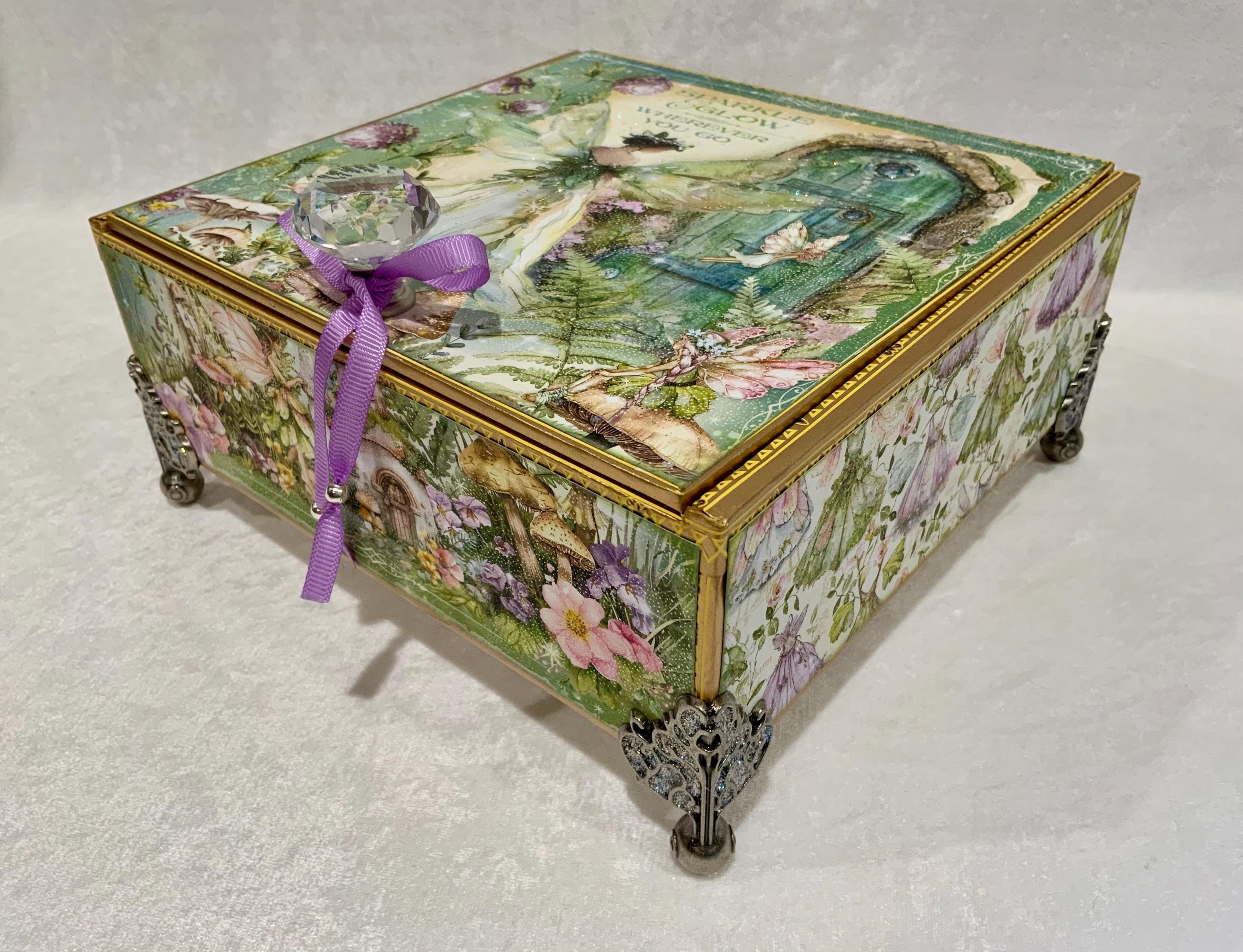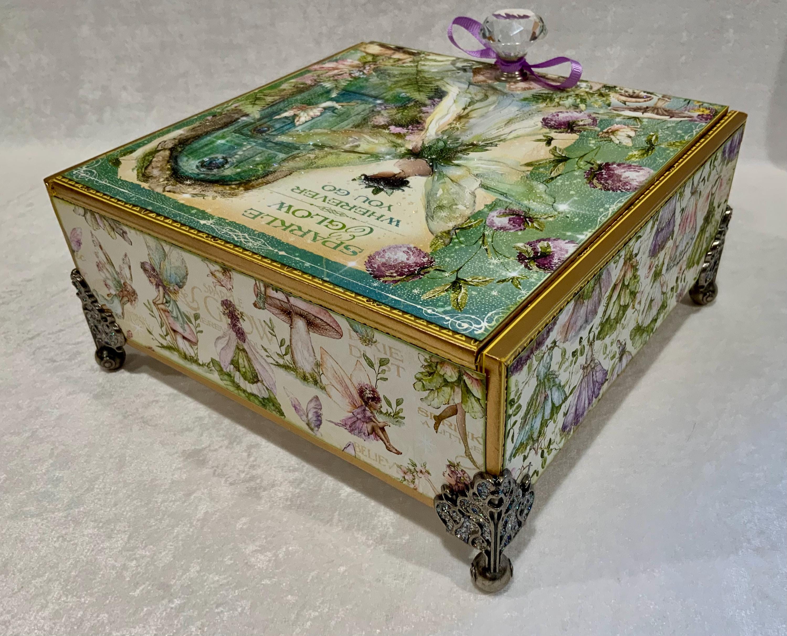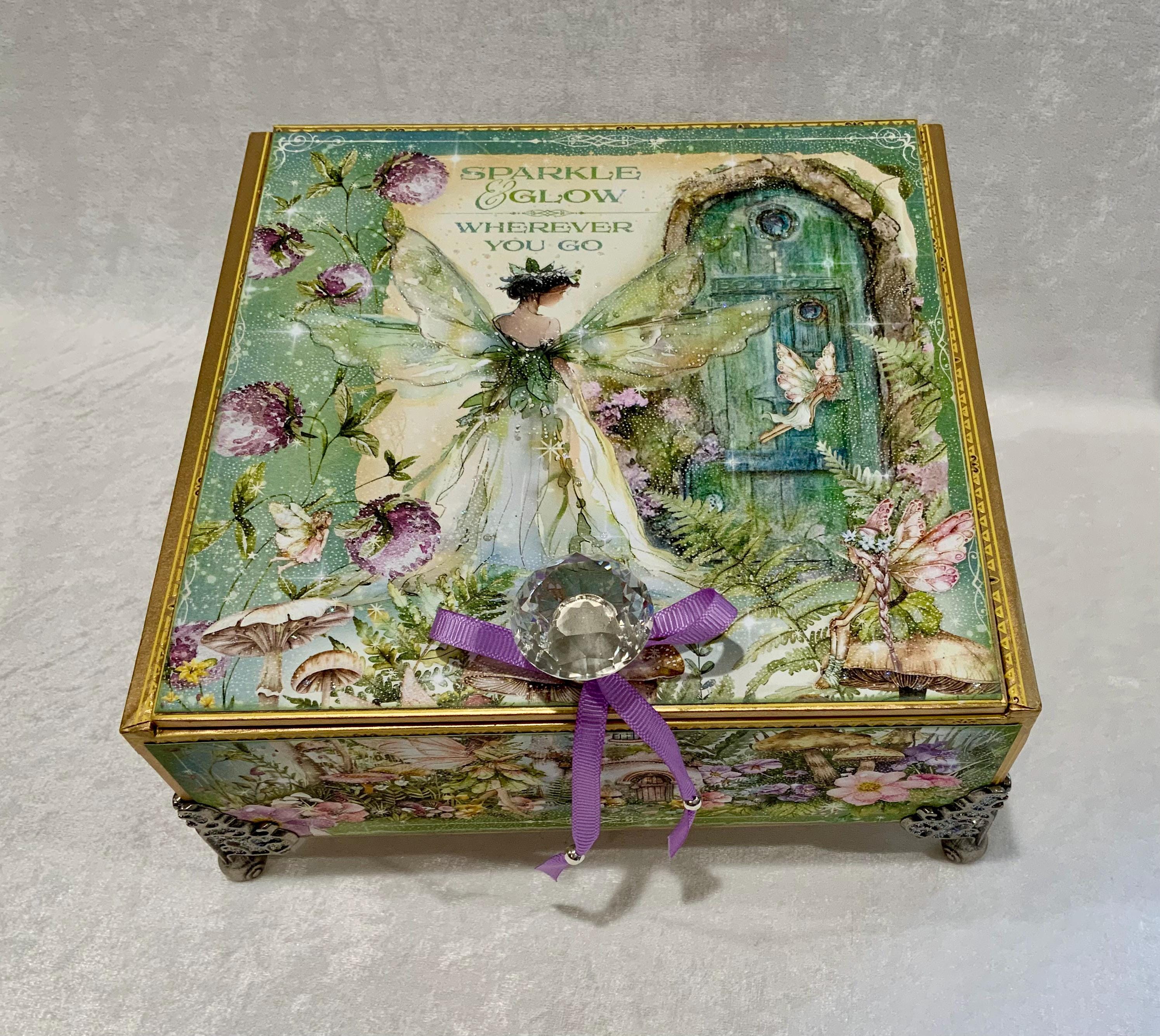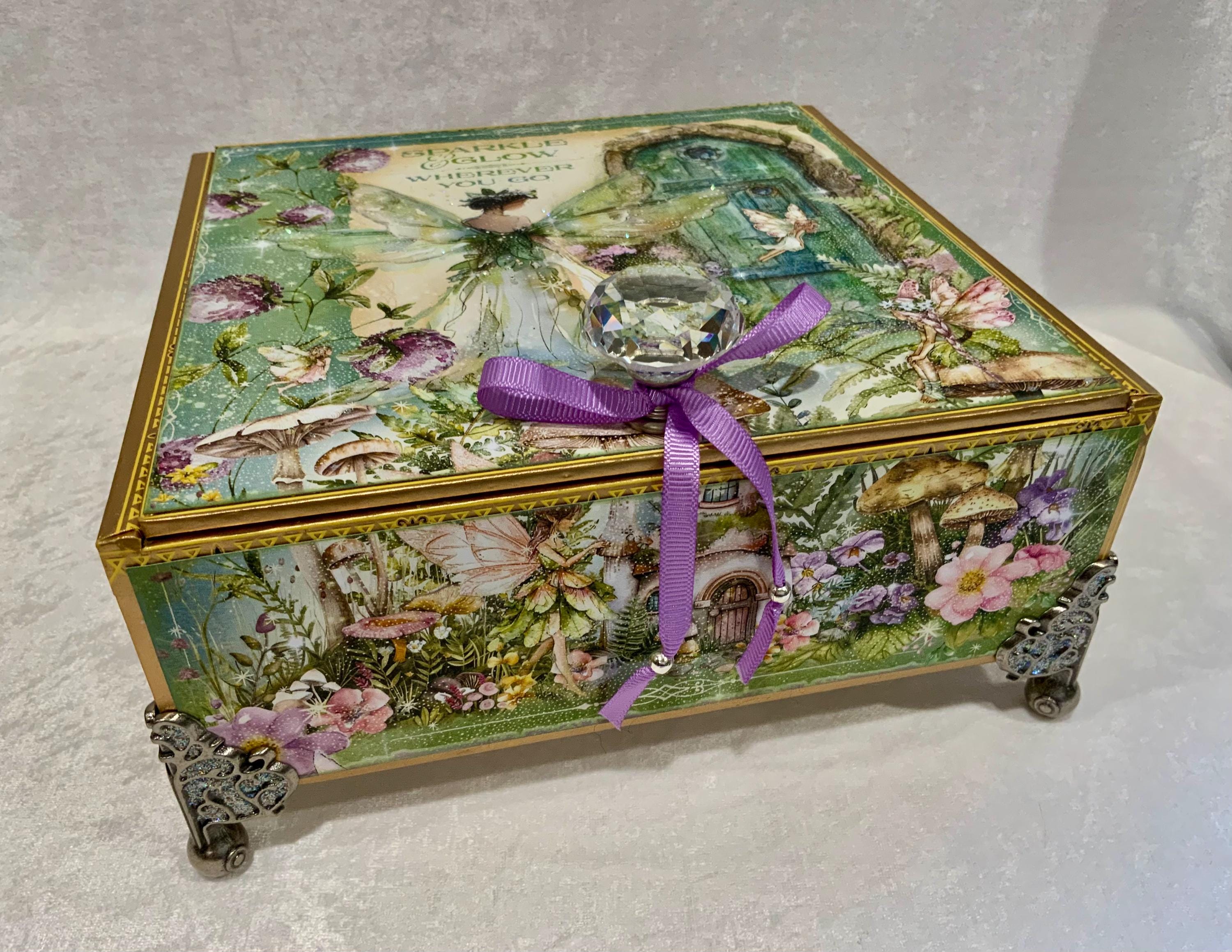 Step into a whimsical fairy tale with this enchanting altered cigar box featuring vintage fairies, mushrooms, and a touch of sparkle. This handmade cottage-style keepsake box is perfect for holding jewelry, small treasures, or simply for displaying as a magical accent. The sturdy wood box has been carefully transformed with premium papers and embellishments, and lined inside to protect your trinkets. Feminine, imaginative, and full of charm, this fairy cottage box is a delightful gift for anyone who loves woodland or cottagecore decor.
