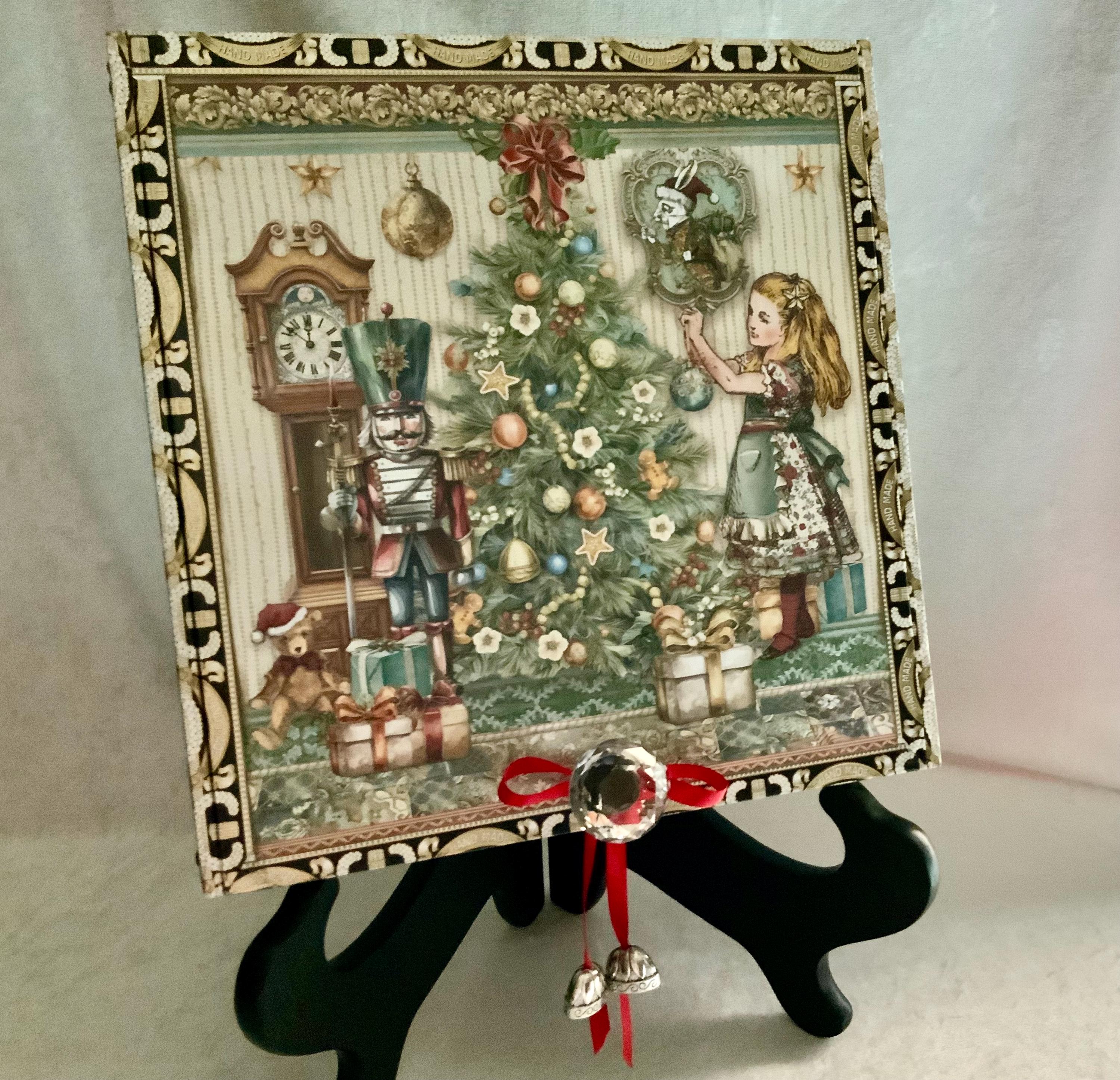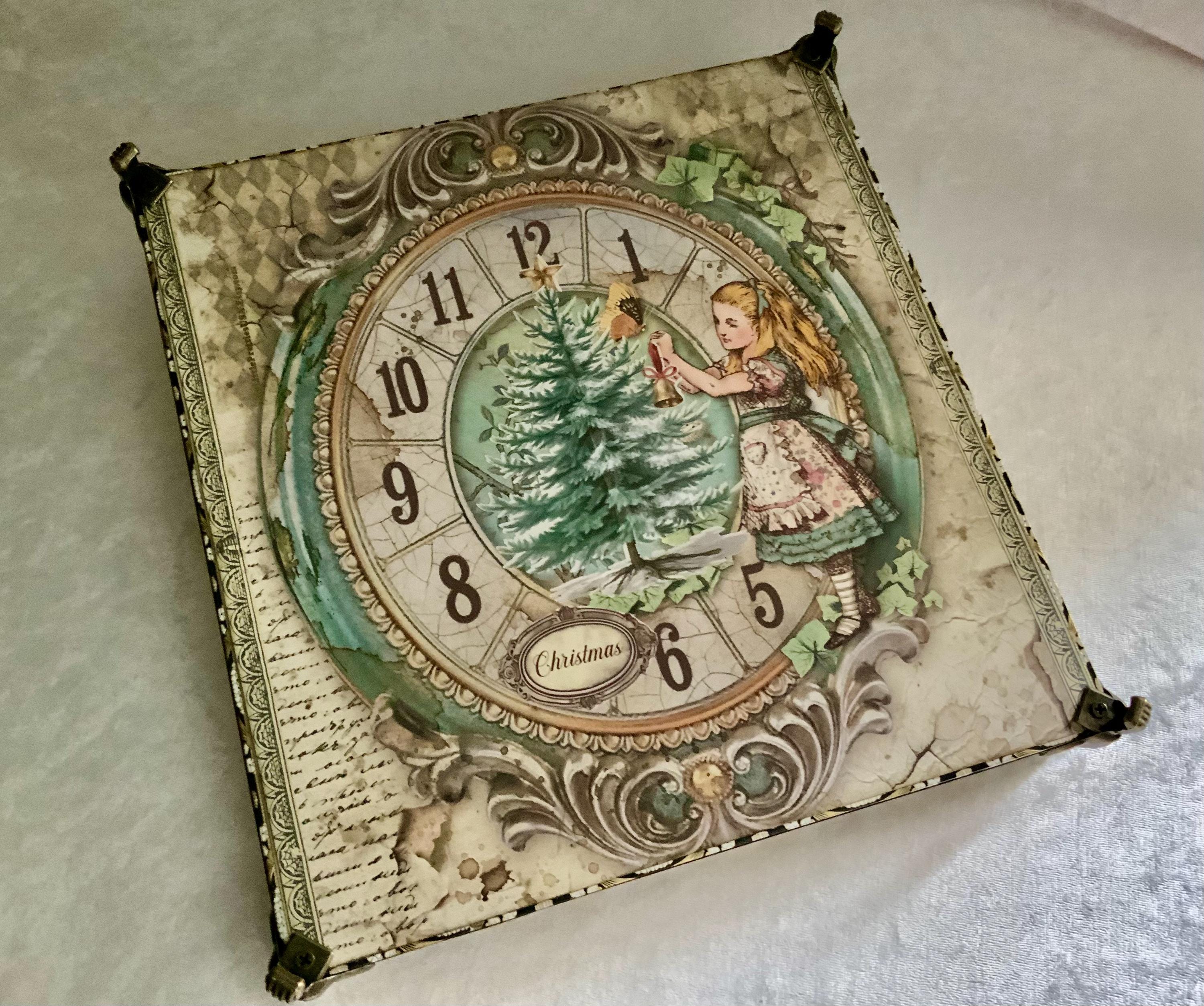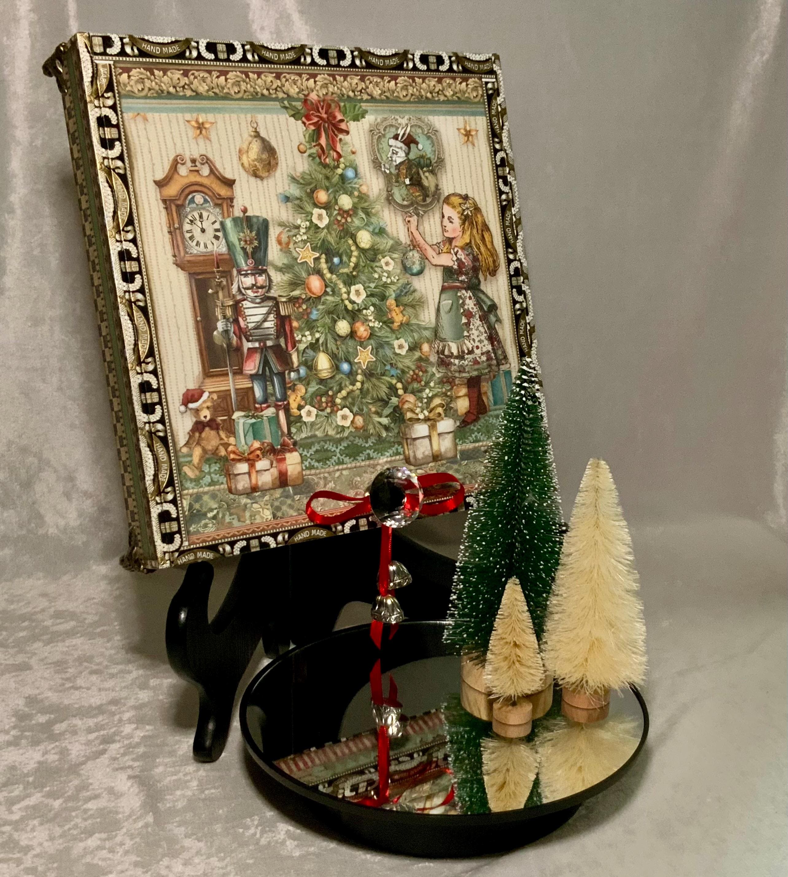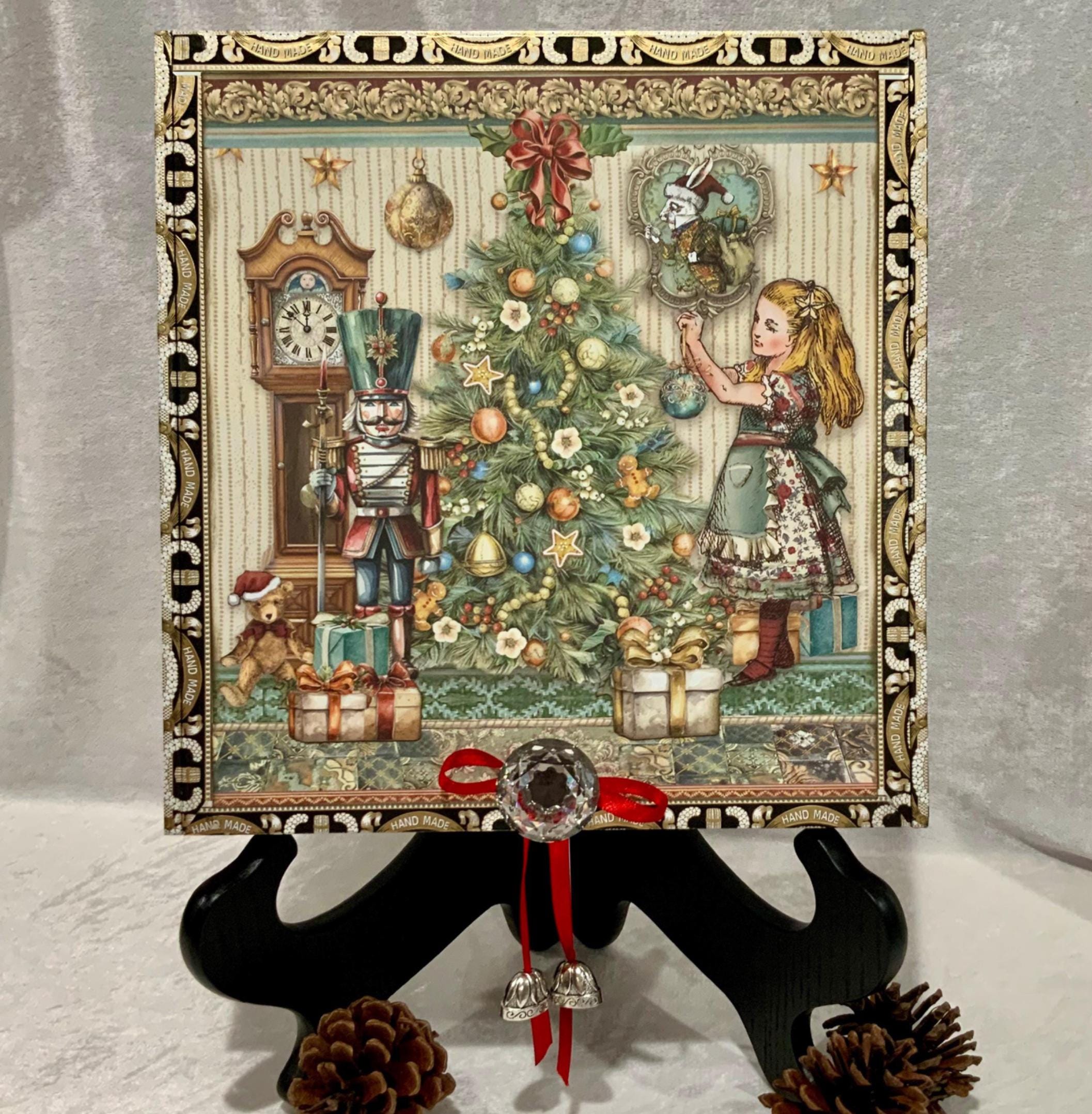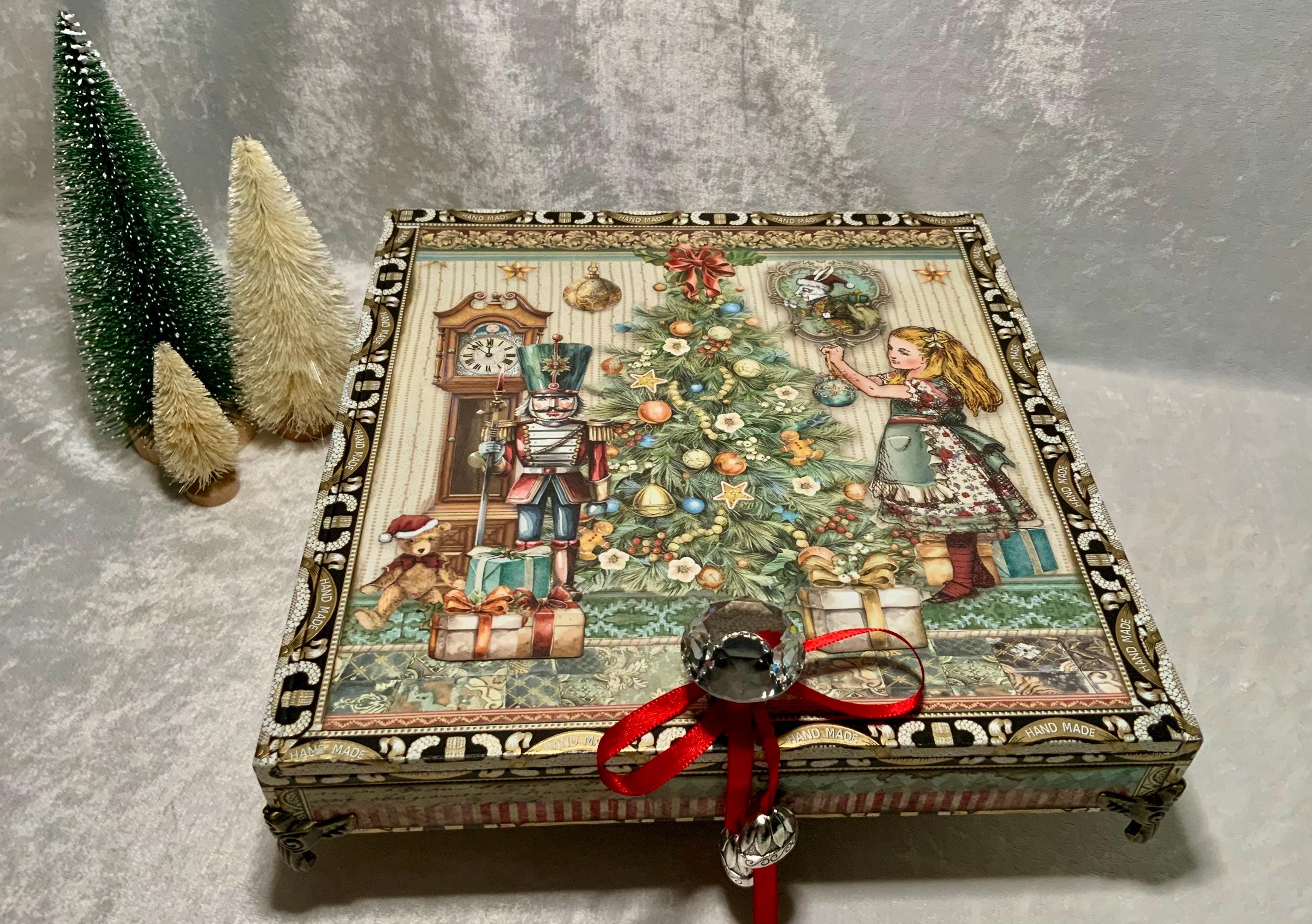 Step into a magical holiday scene with this one-of-a-kind keepsake box, featuring a festive reinterpretation of Alice in Wonderland. The decorated lid includes whimsical Christmas elements like a nutcracker, tree, toys, and Alice herself, styled in vintage storybook fashion. I will add whimsical and holiday phrases in coordination with the design.