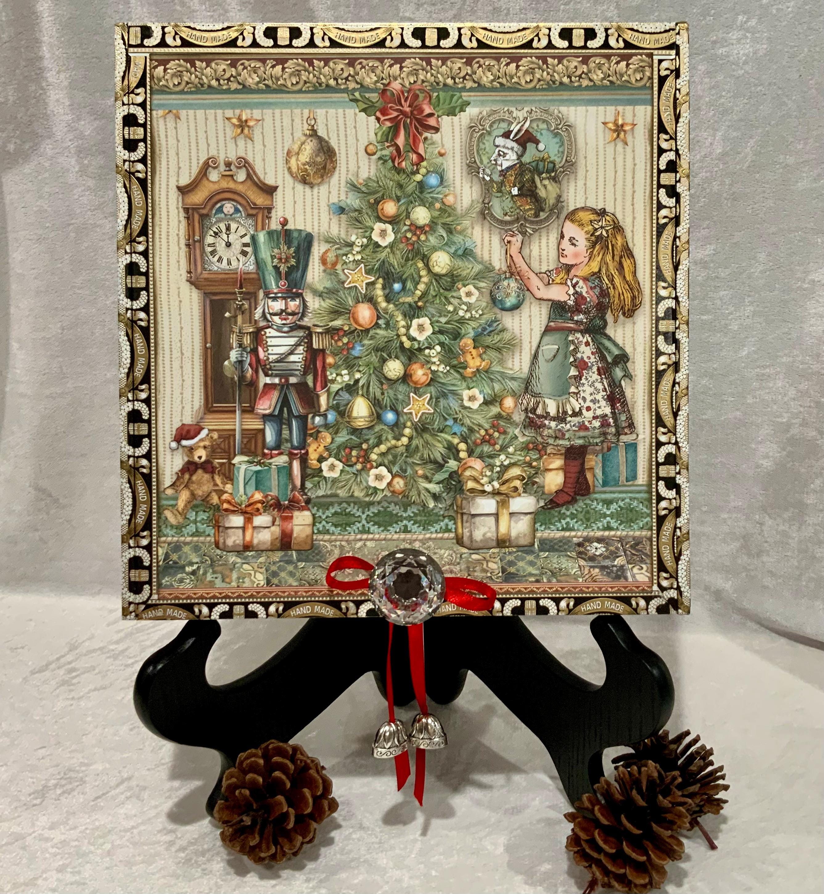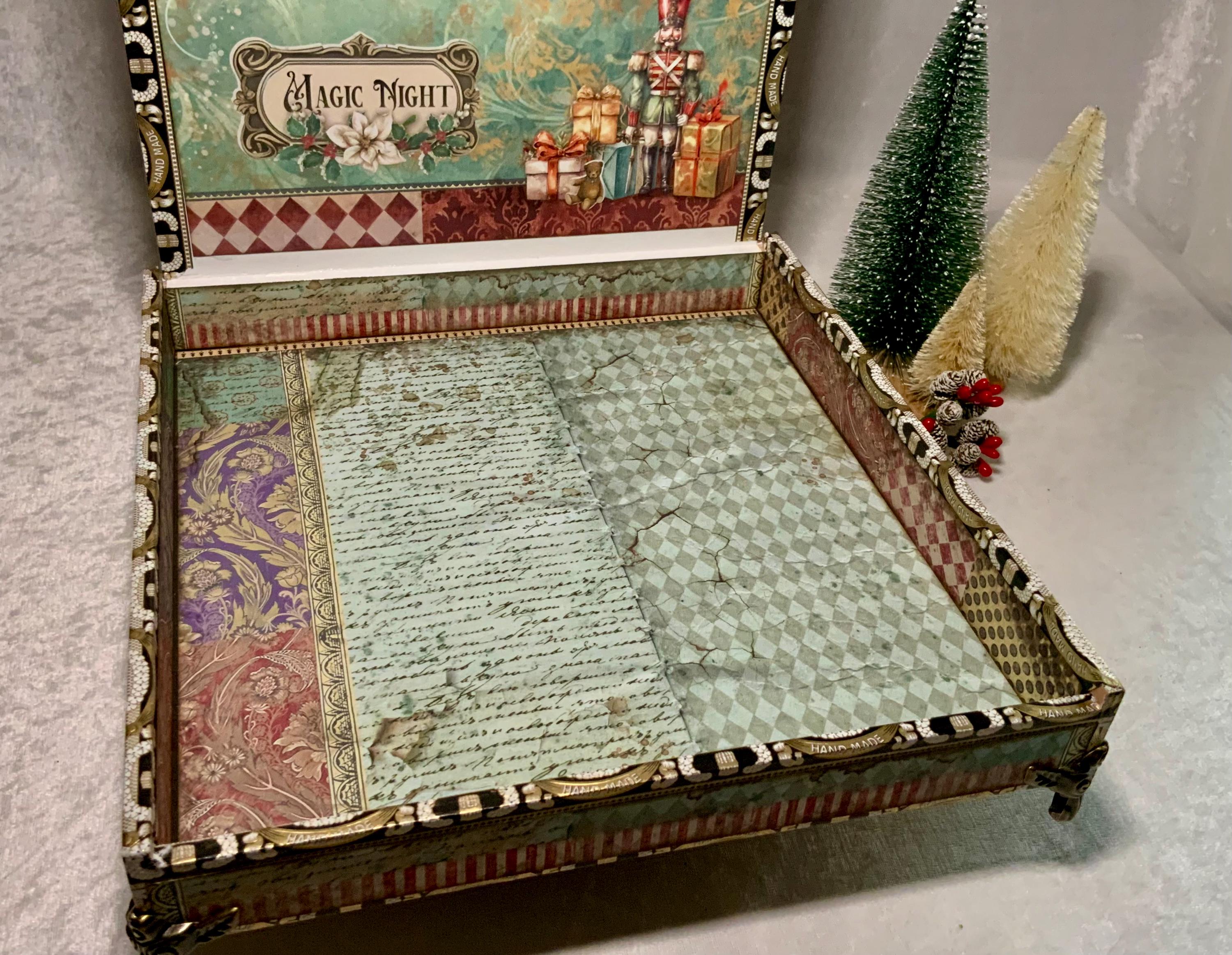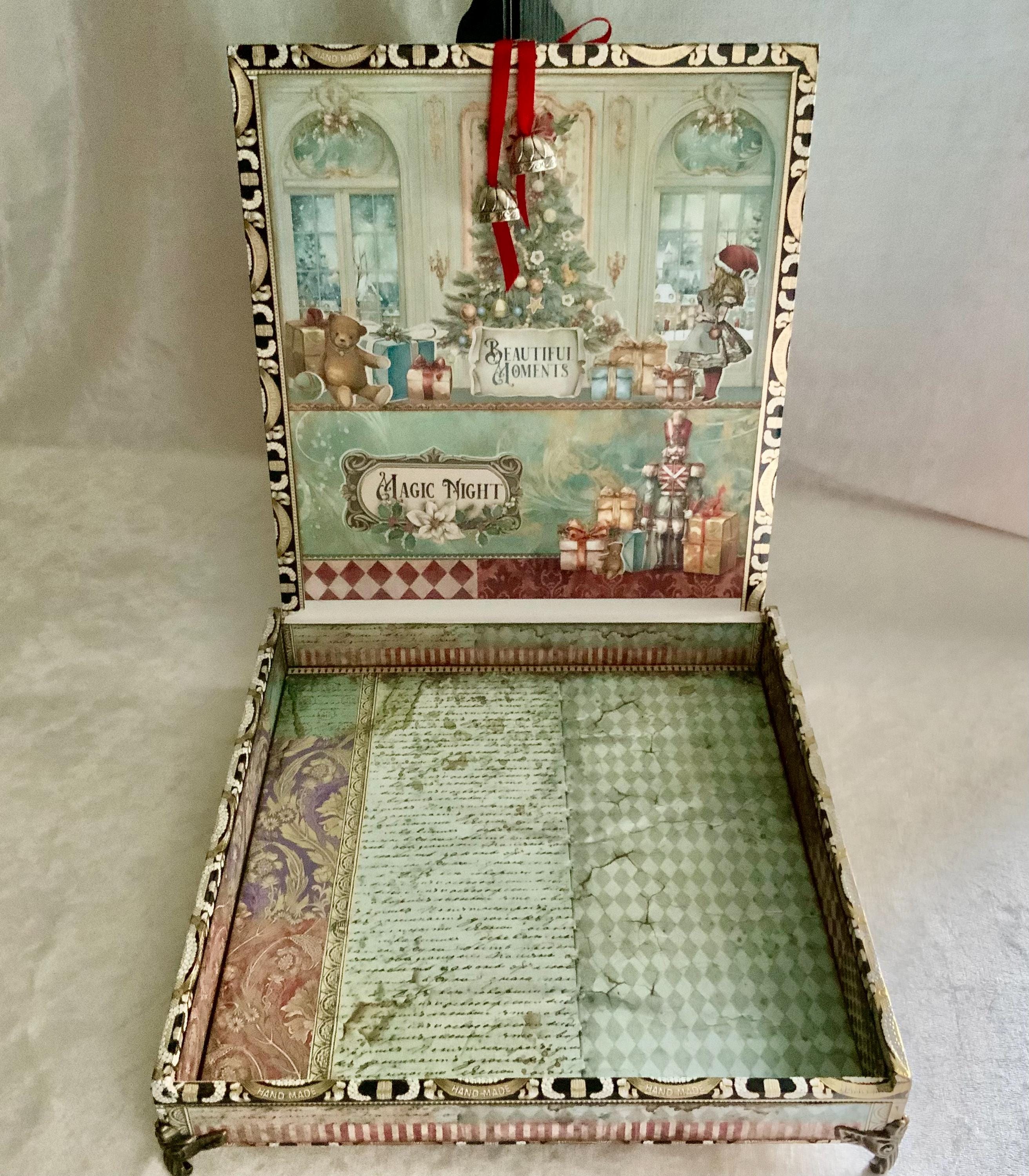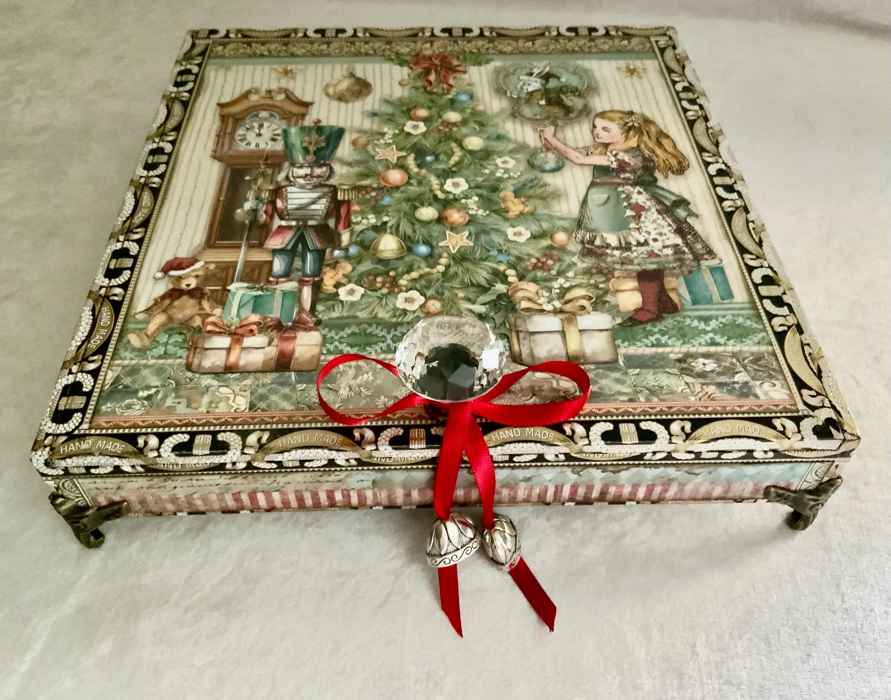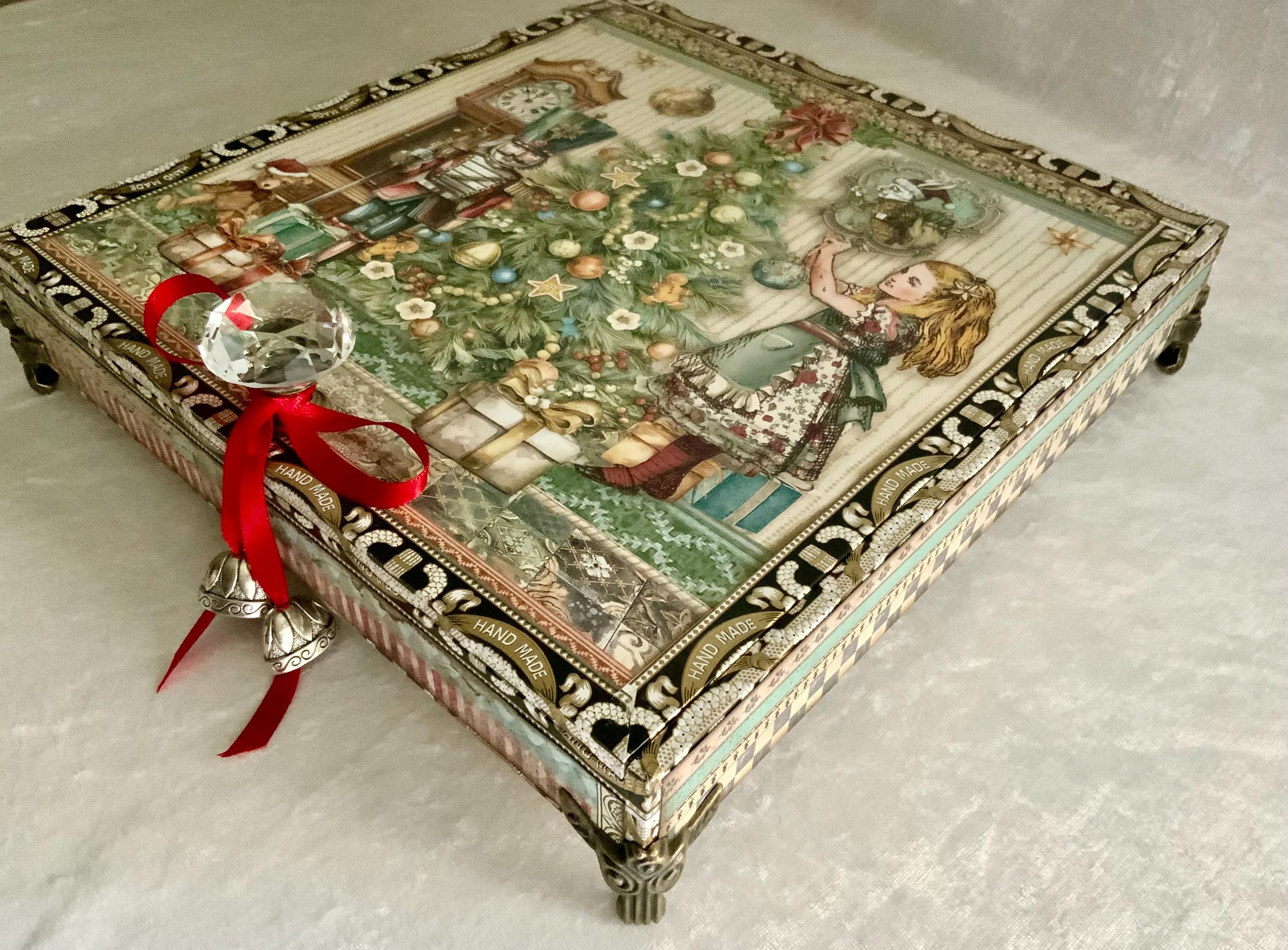 Step into a magical holiday scene with this one-of-a-kind keepsake box, featuring a festive reinterpretation of Alice in Wonderland. The decorated lid includes whimsical Christmas elements like a nutcracker, tree, toys, and Alice herself, styled in vintage storybook fashion. I will add whimsical and holiday phrases in coordination with the design.