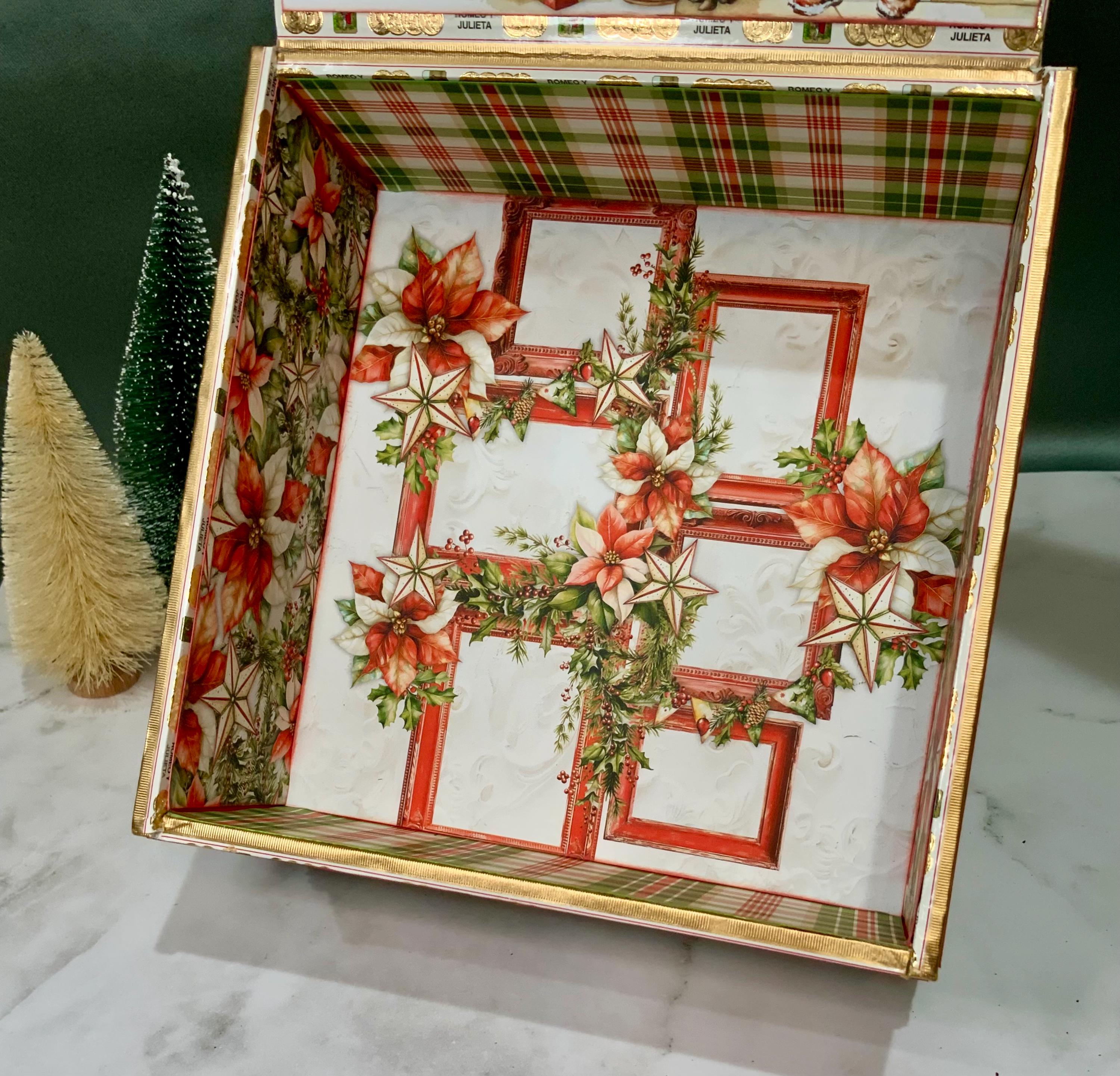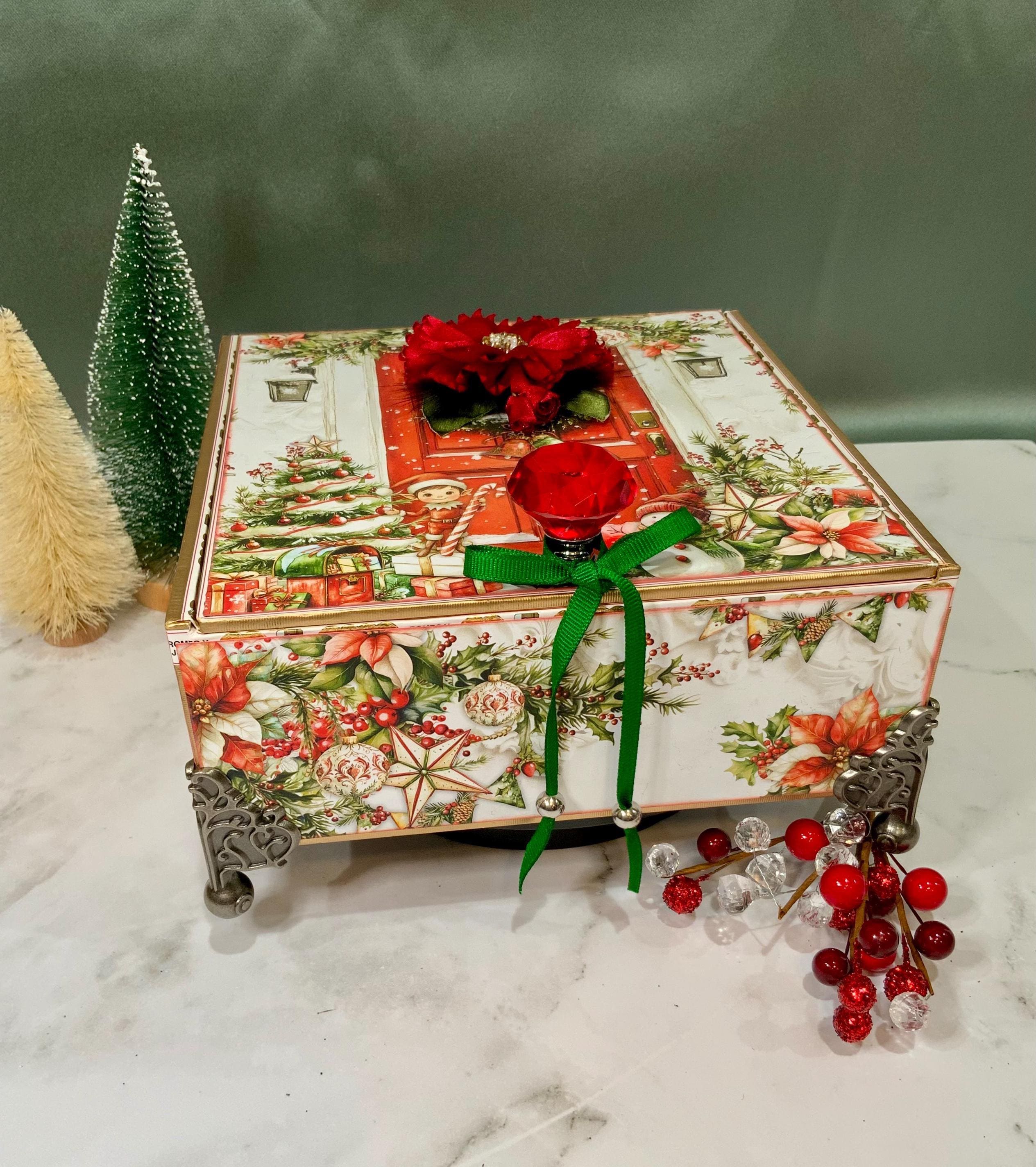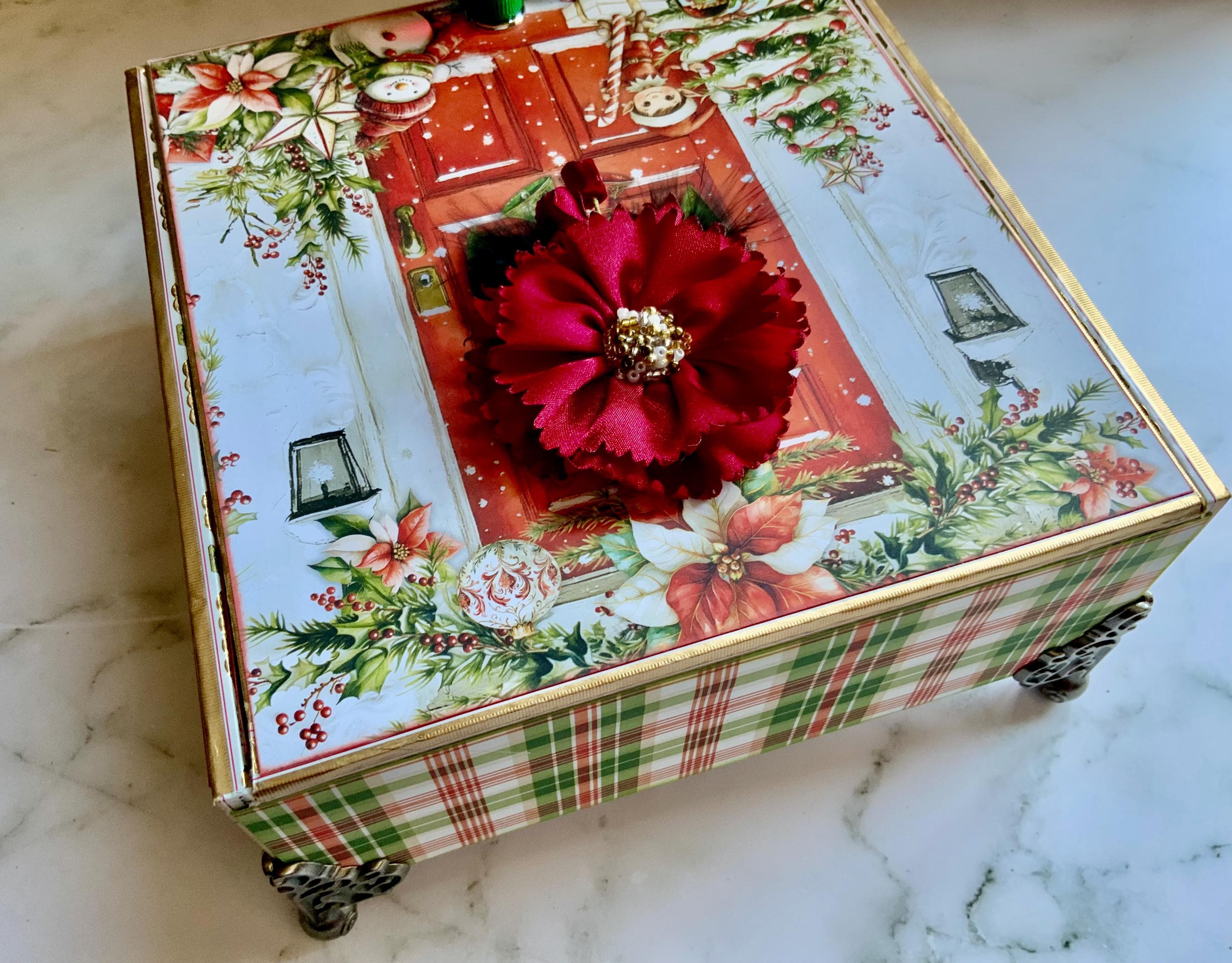 This upcycled Romeo y Julieta cigar box has been carefully transformed into a Christmas heirloom using the Mintay “Holly Jolly” paper collection. The lid showcases a bold red front door design, accented with a 3-D red satin poinsettia flower and sparkling center. A faceted red crystal knob with a green ribbon adds elegance, while the box rests on sturdy ornate brass feet with antique finish (unpainted for a classic look).