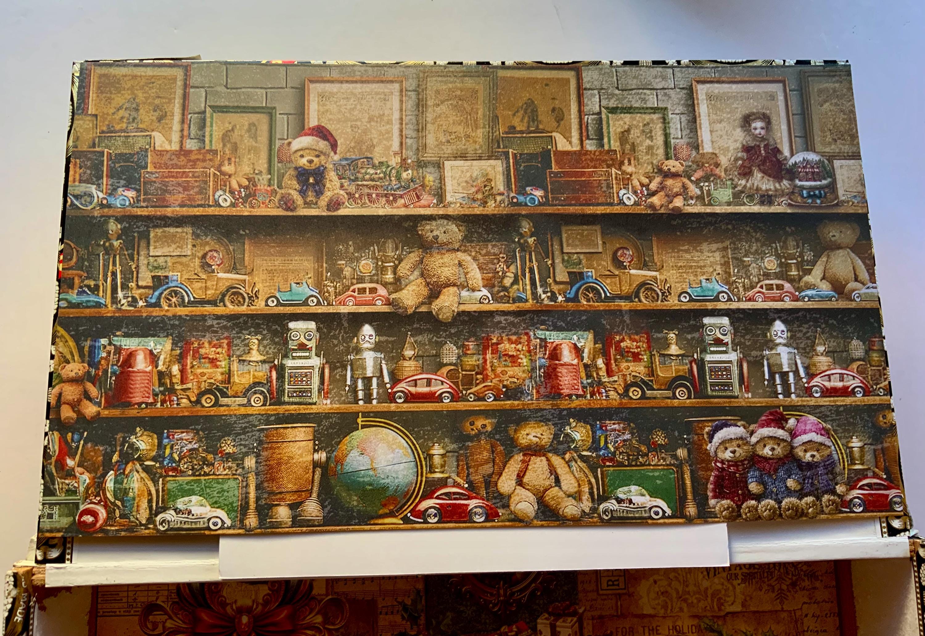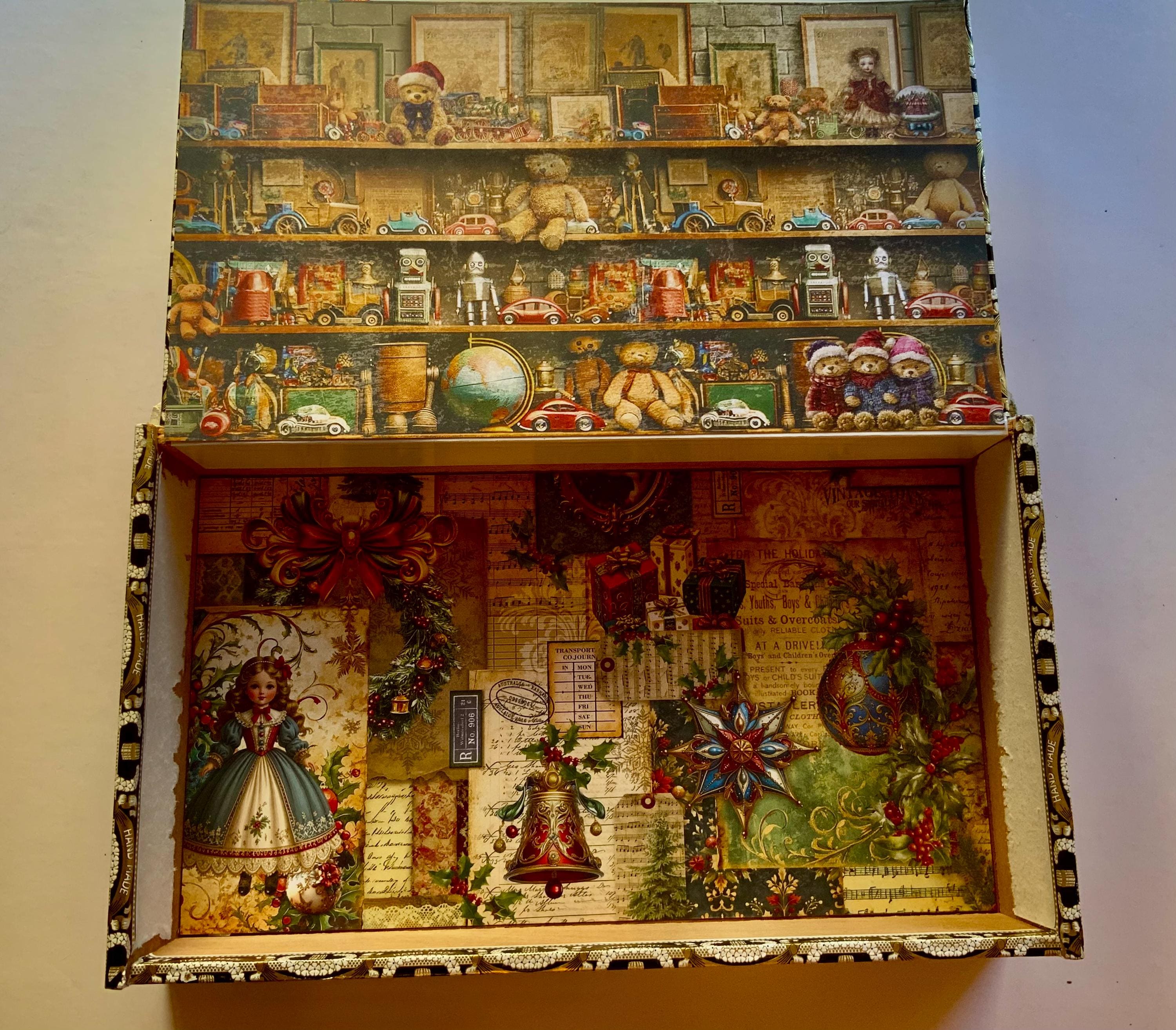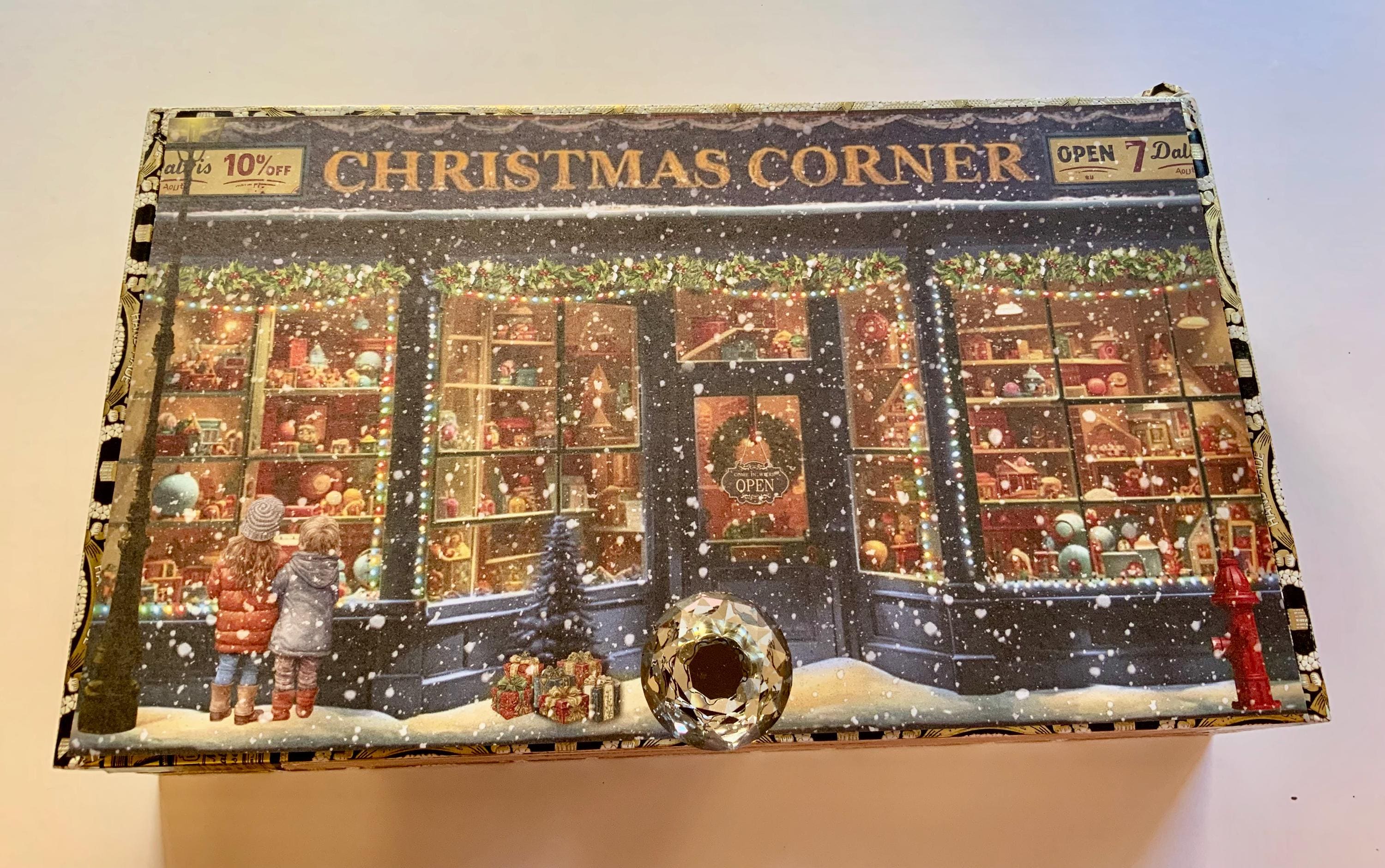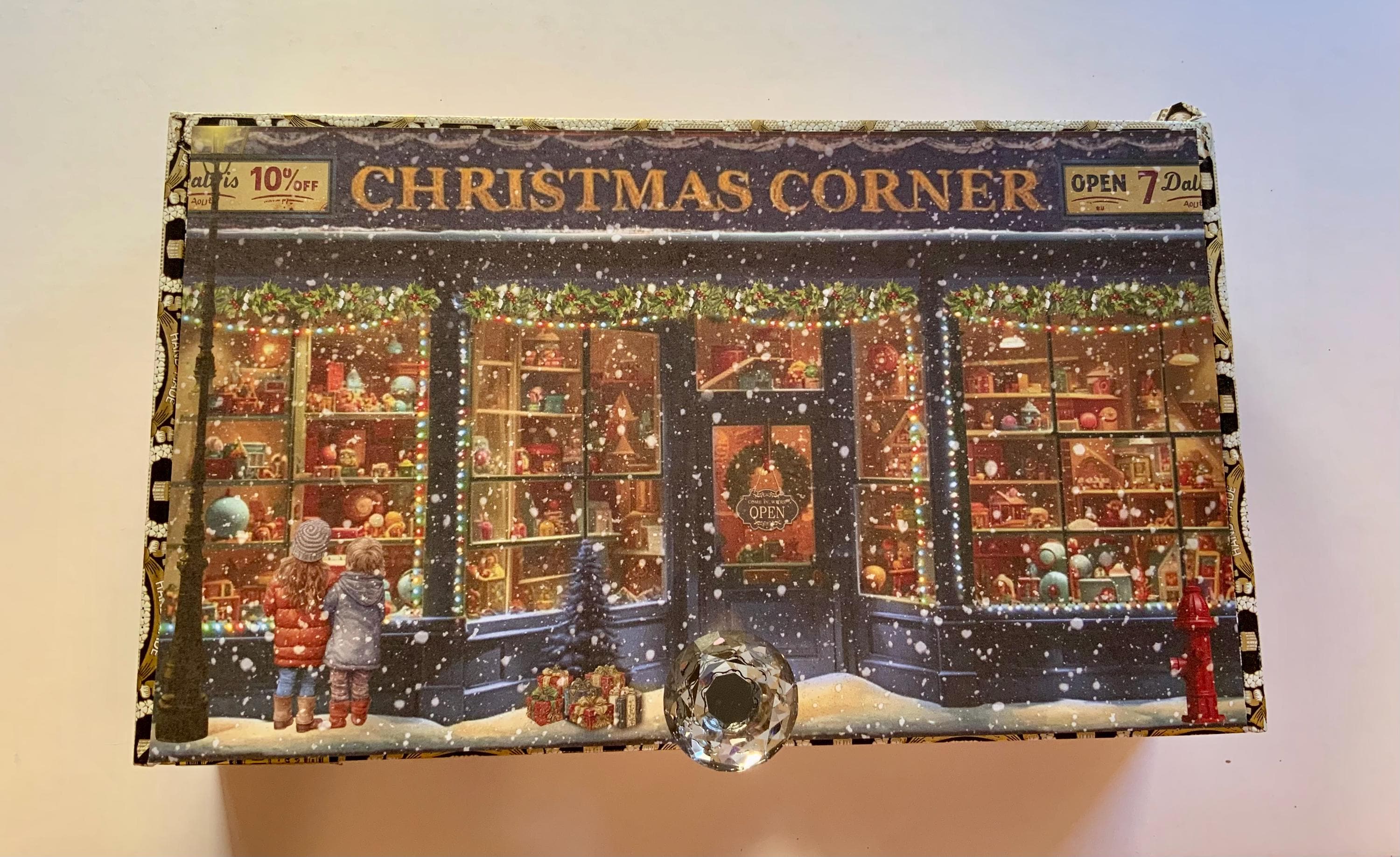 Christmas Corner Toy Shop Decorated Cigar Box – 10x6x2” Vintage Storefront with Glitter Snow Accents