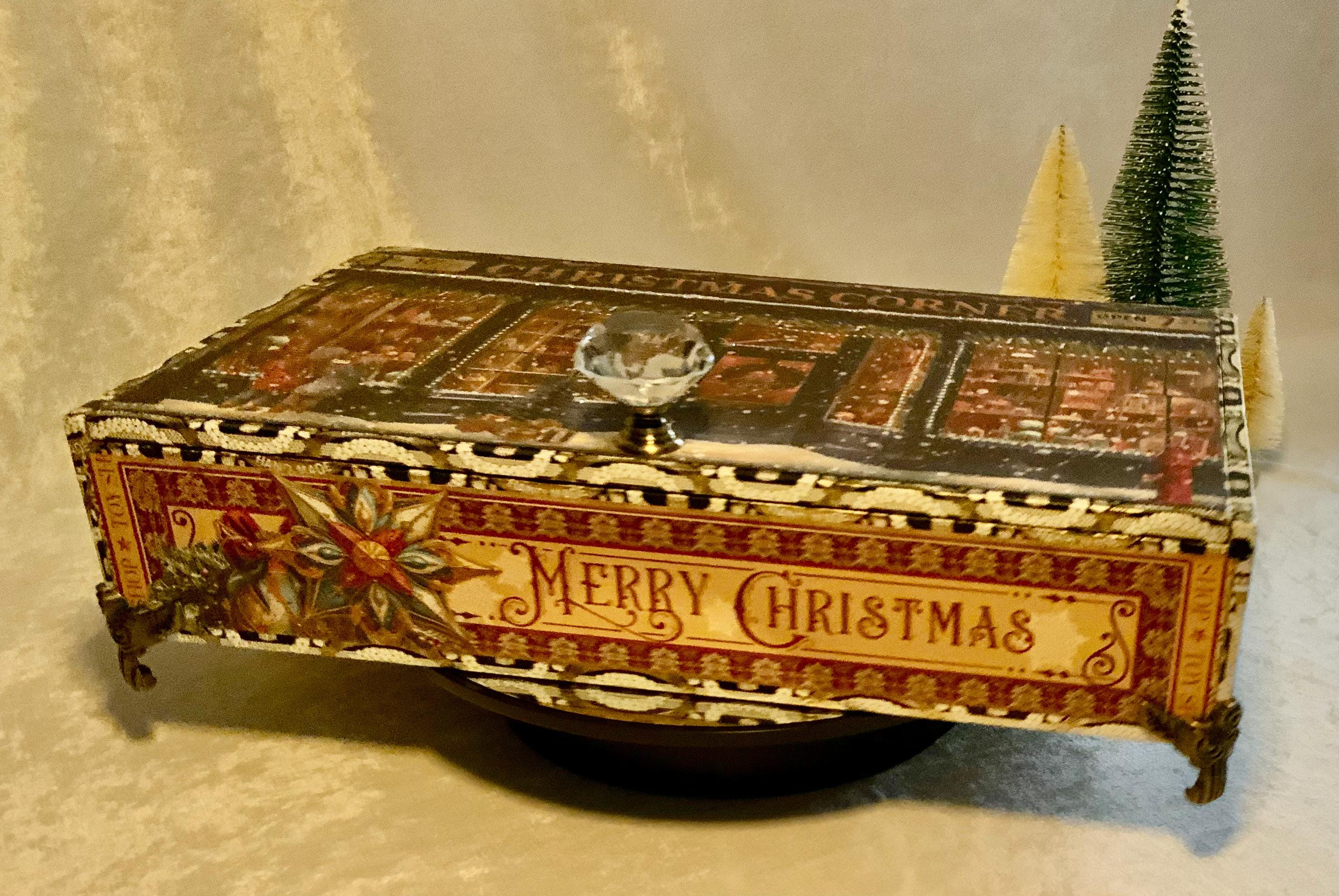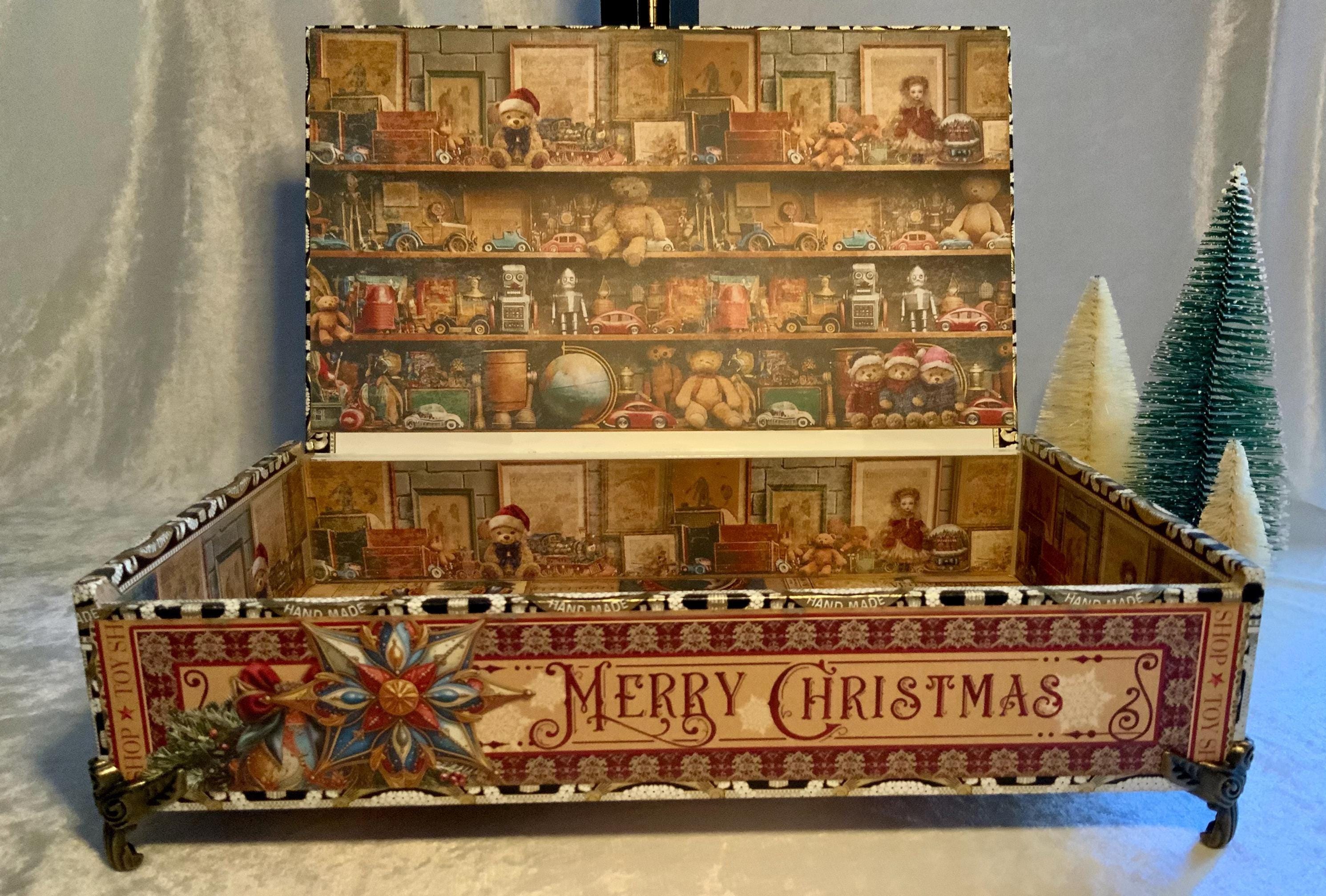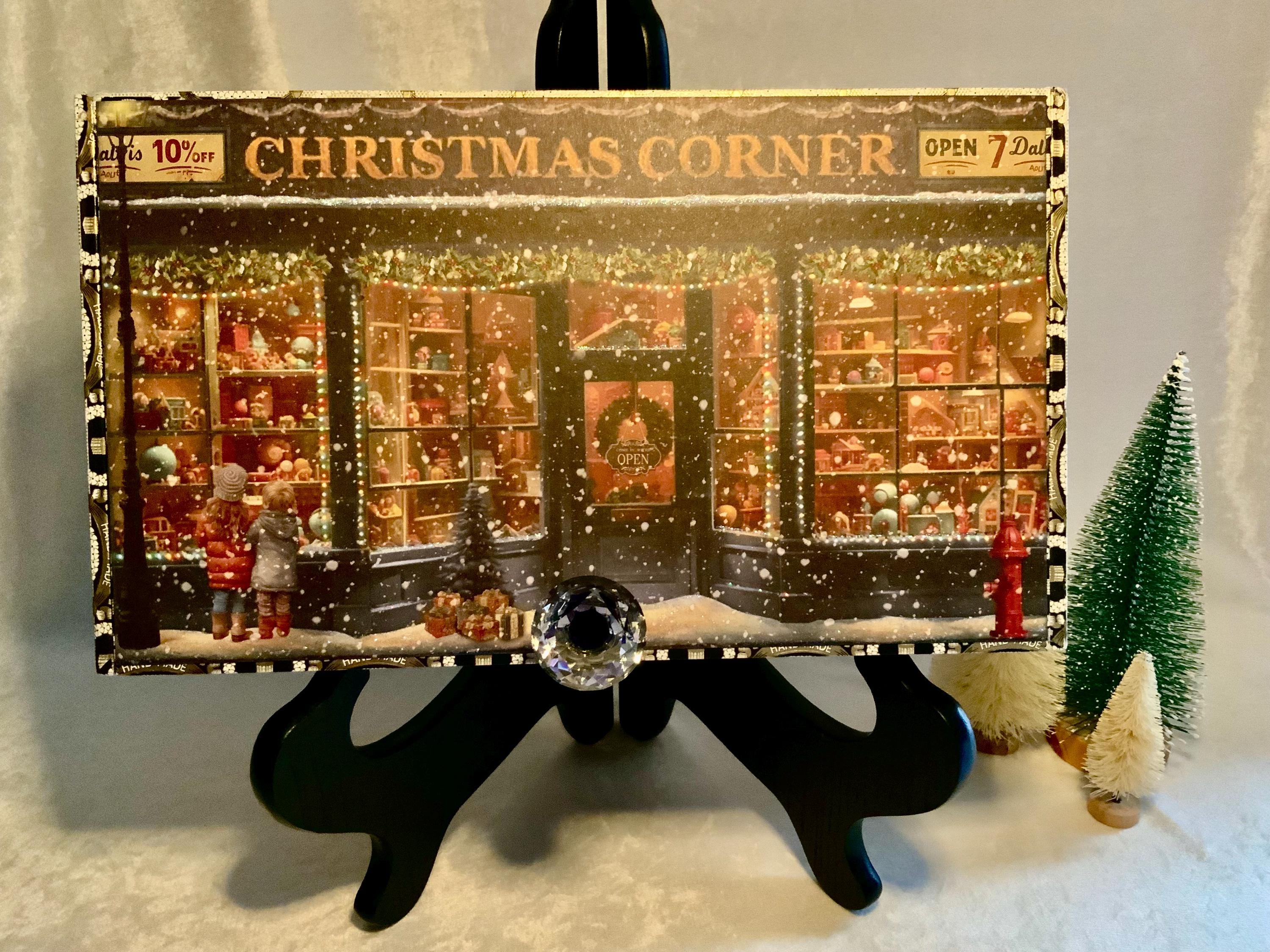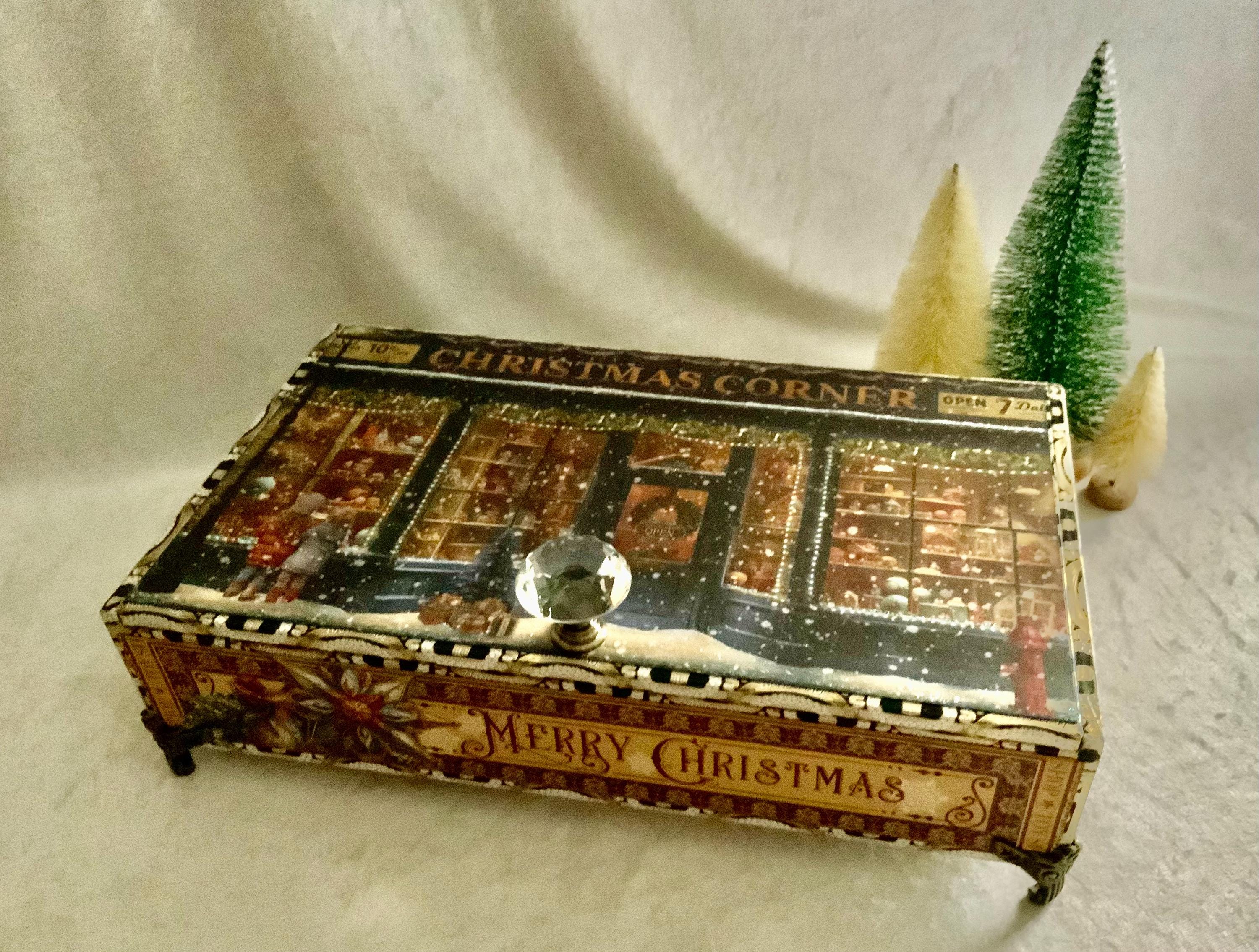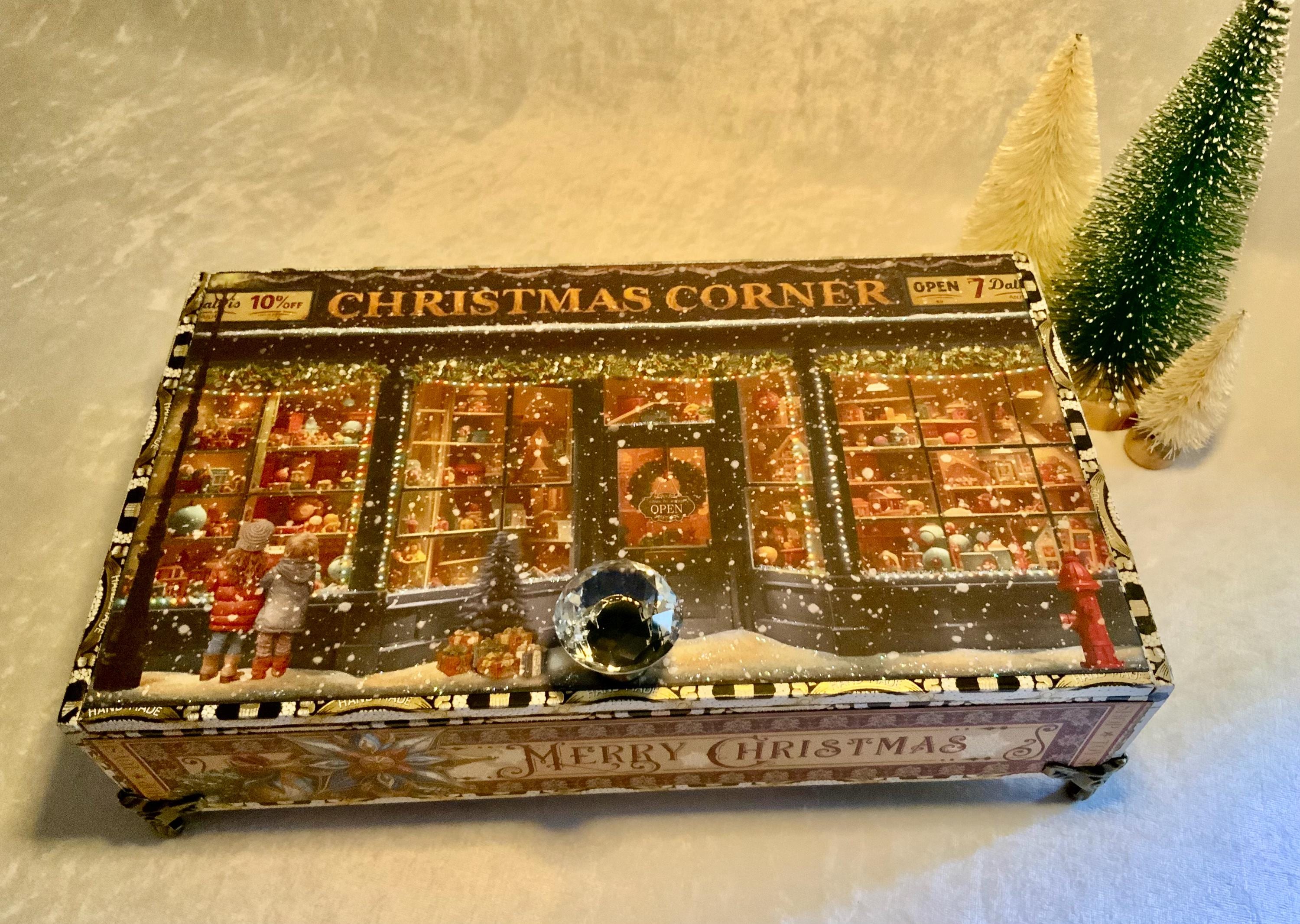 Step into a magical winter wonderland with this handcrafted Christmas Corner Toy Shop decorated cigar box. 🎄