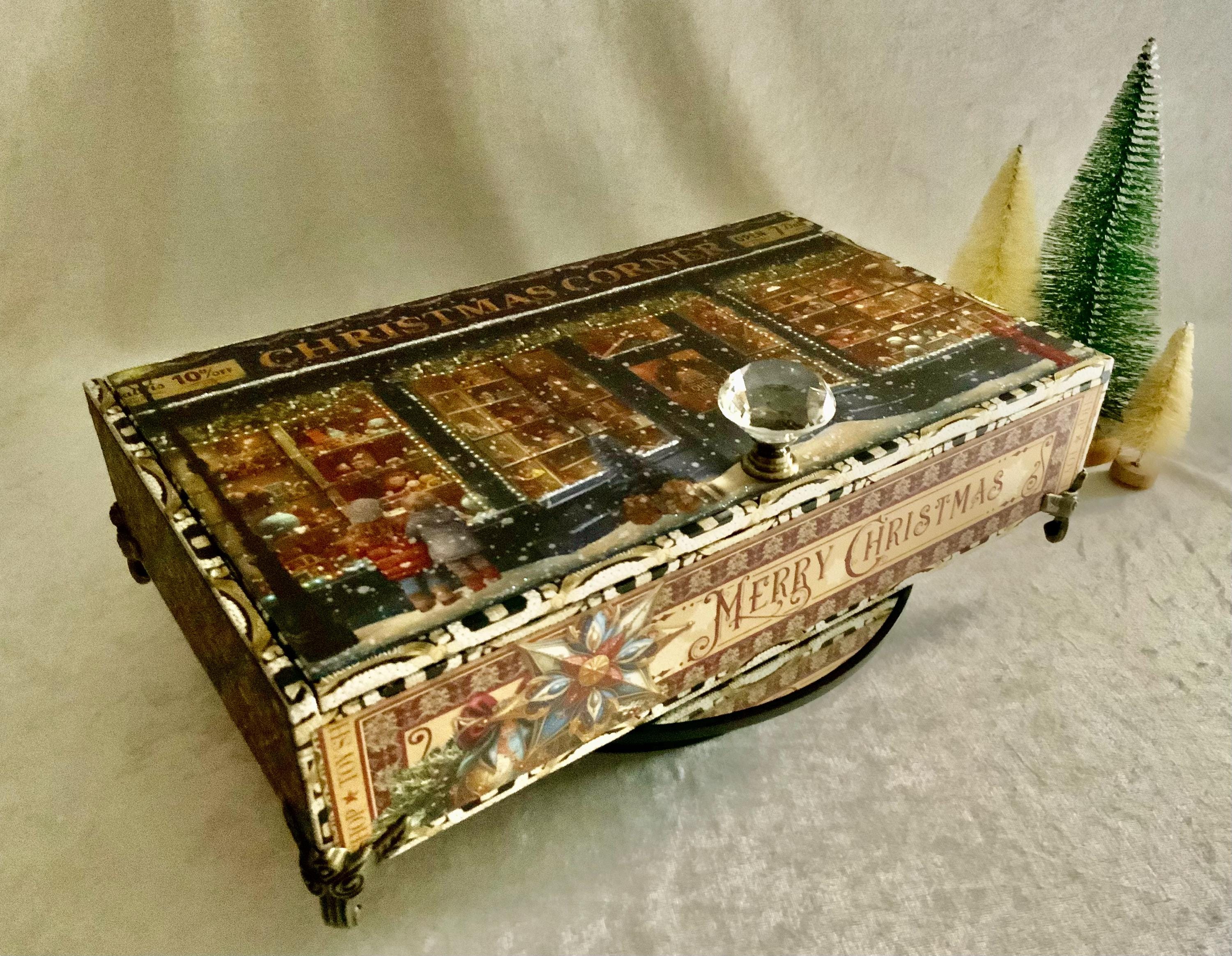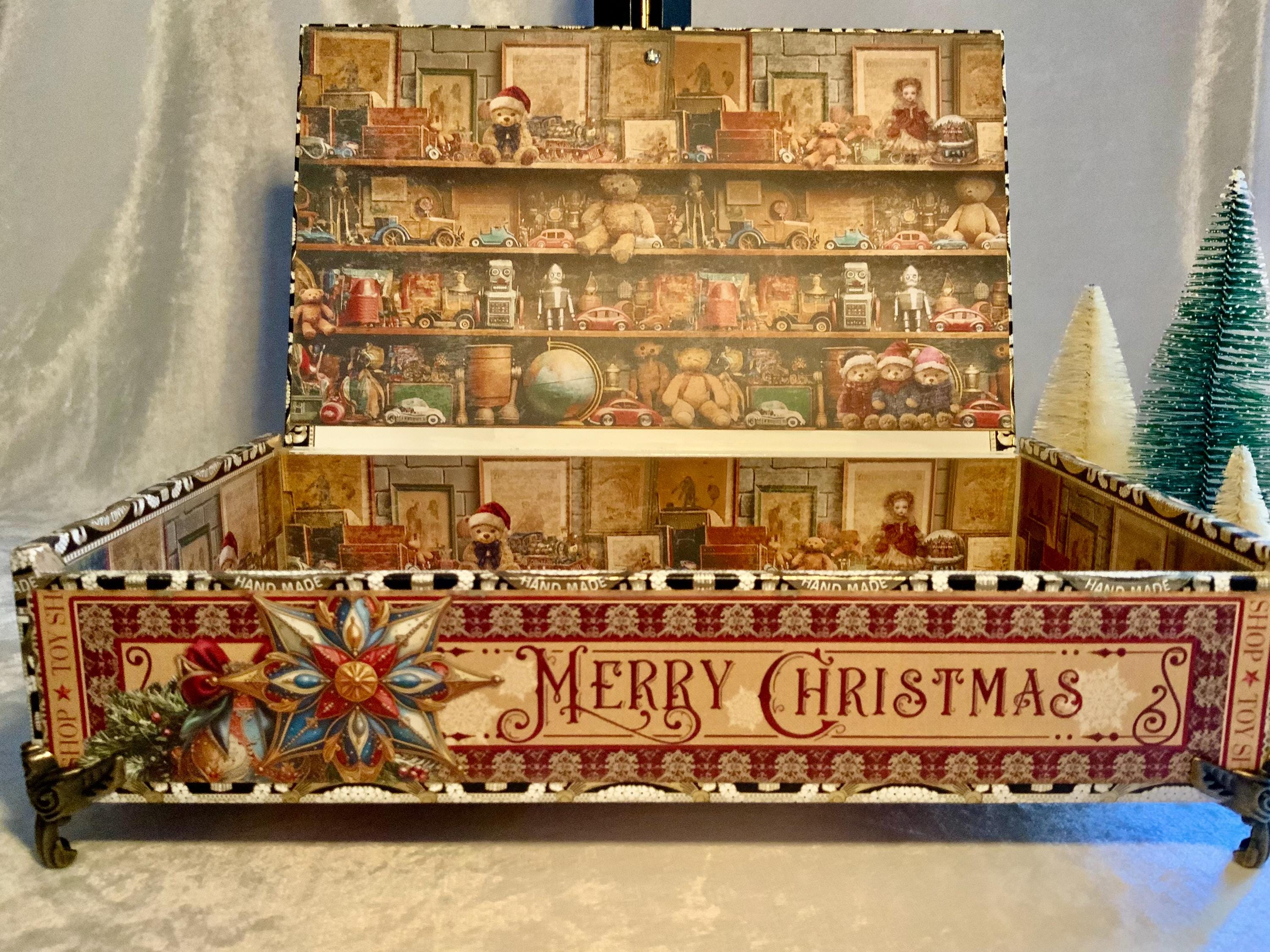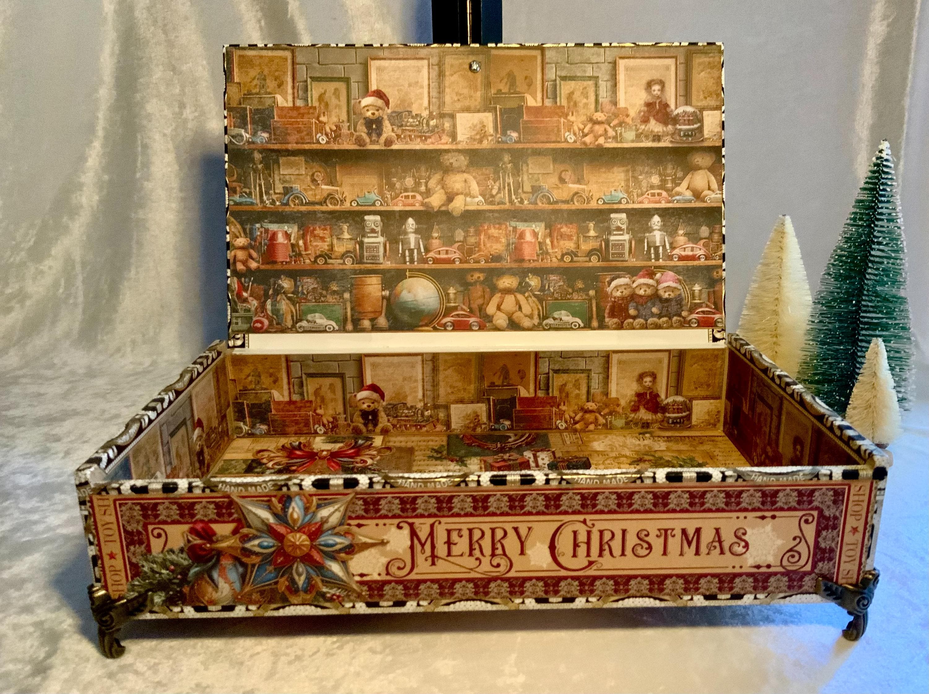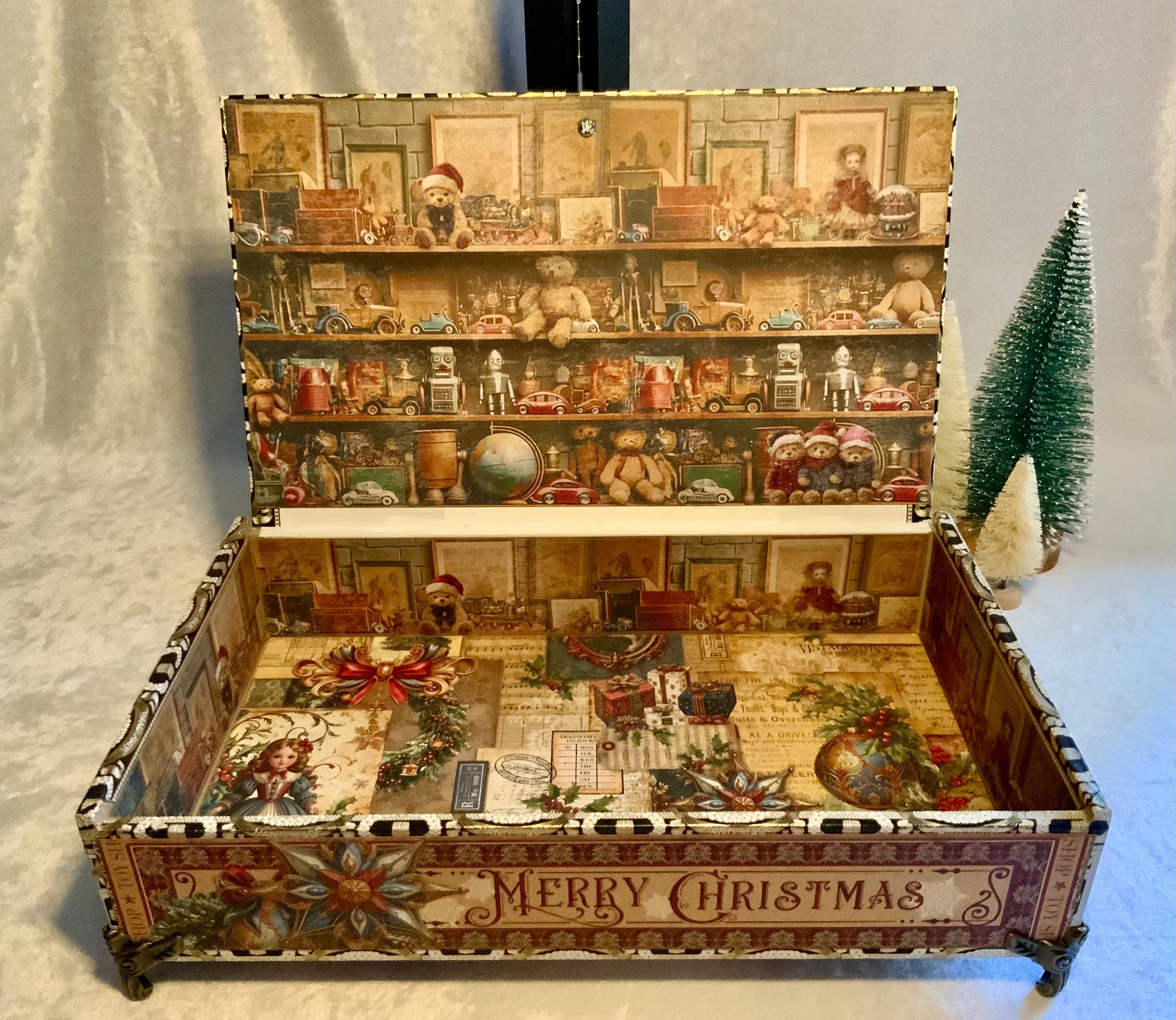 Step into a magical winter wonderland with this handcrafted Christmas Corner Toy Shop decorated cigar box. 🎄