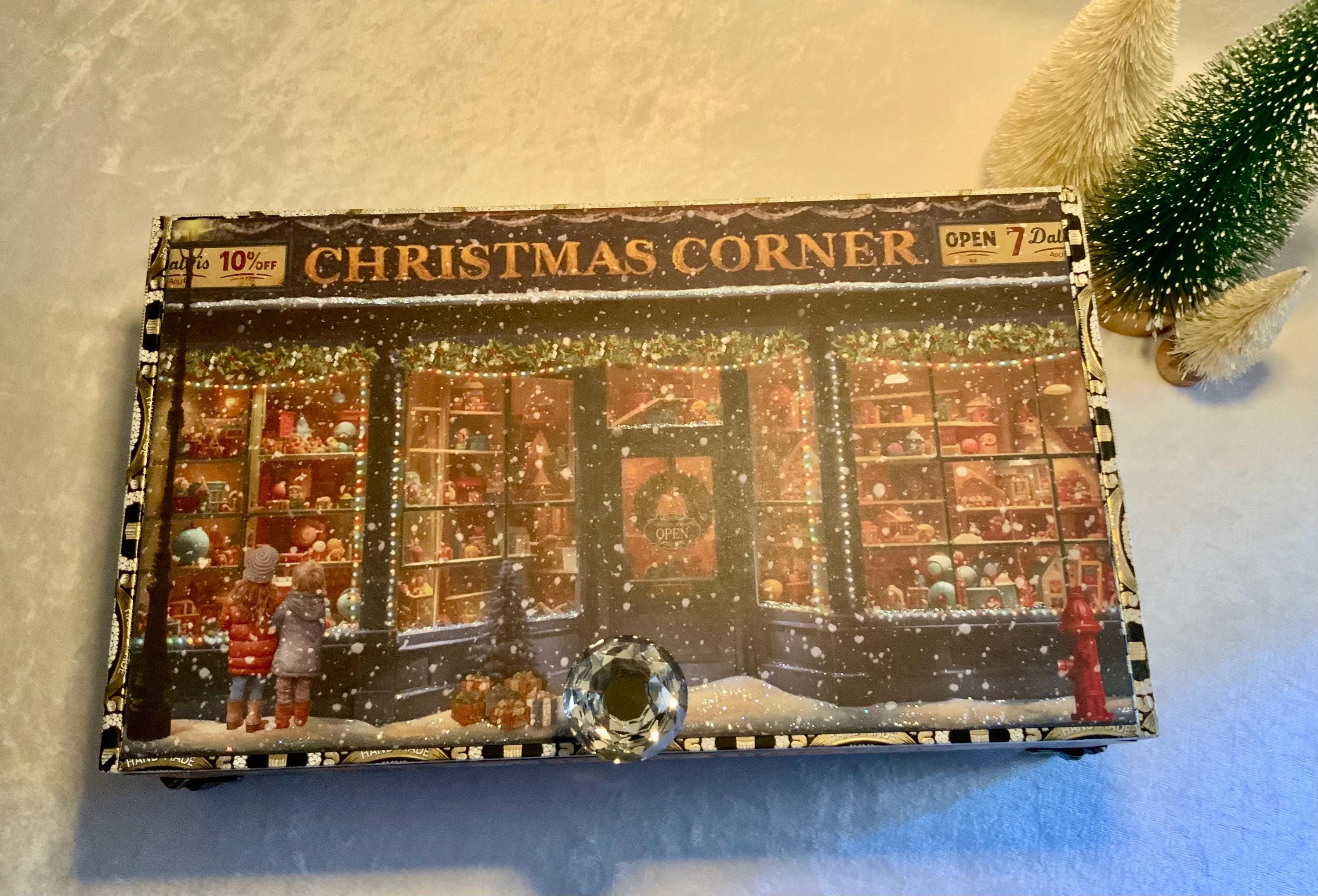 Christmas Corner Toy Shop Decorated Cigar Box – 10x6x2” Vintage Storefront with Glitter Snow Accents - Ships Free in US