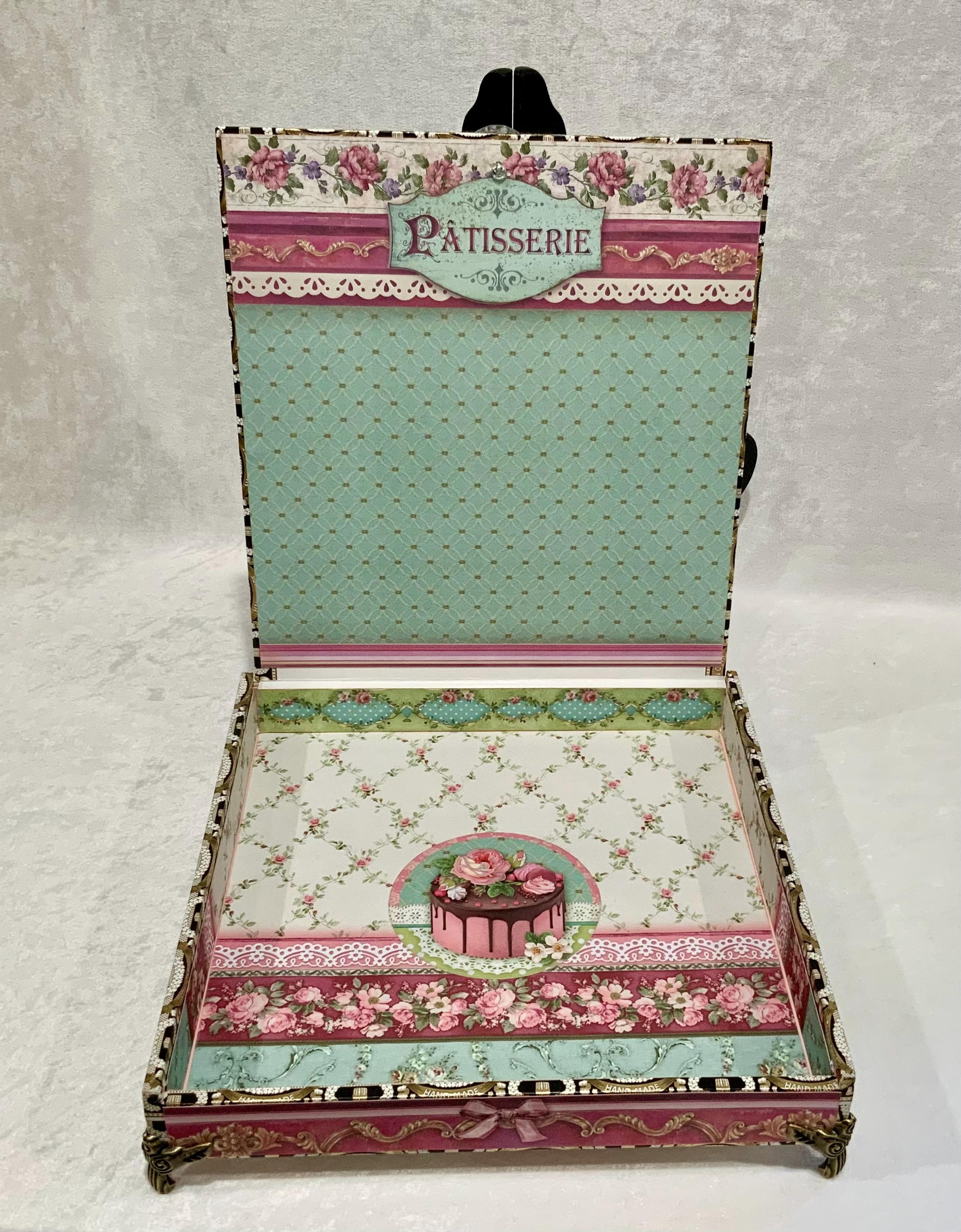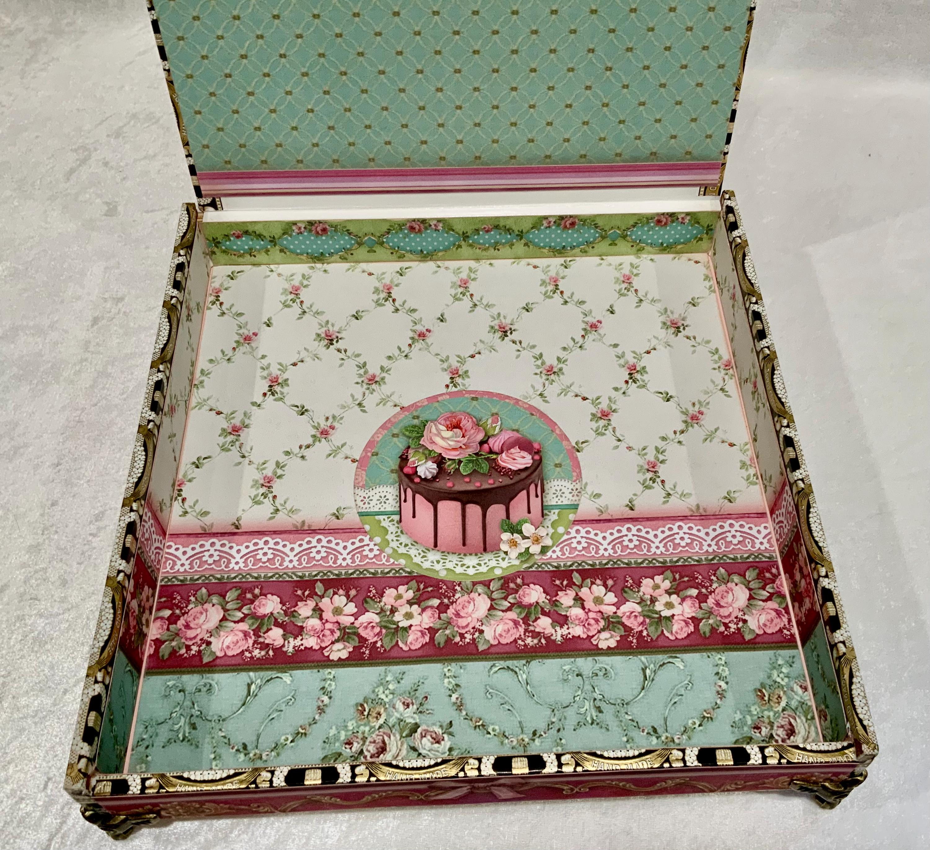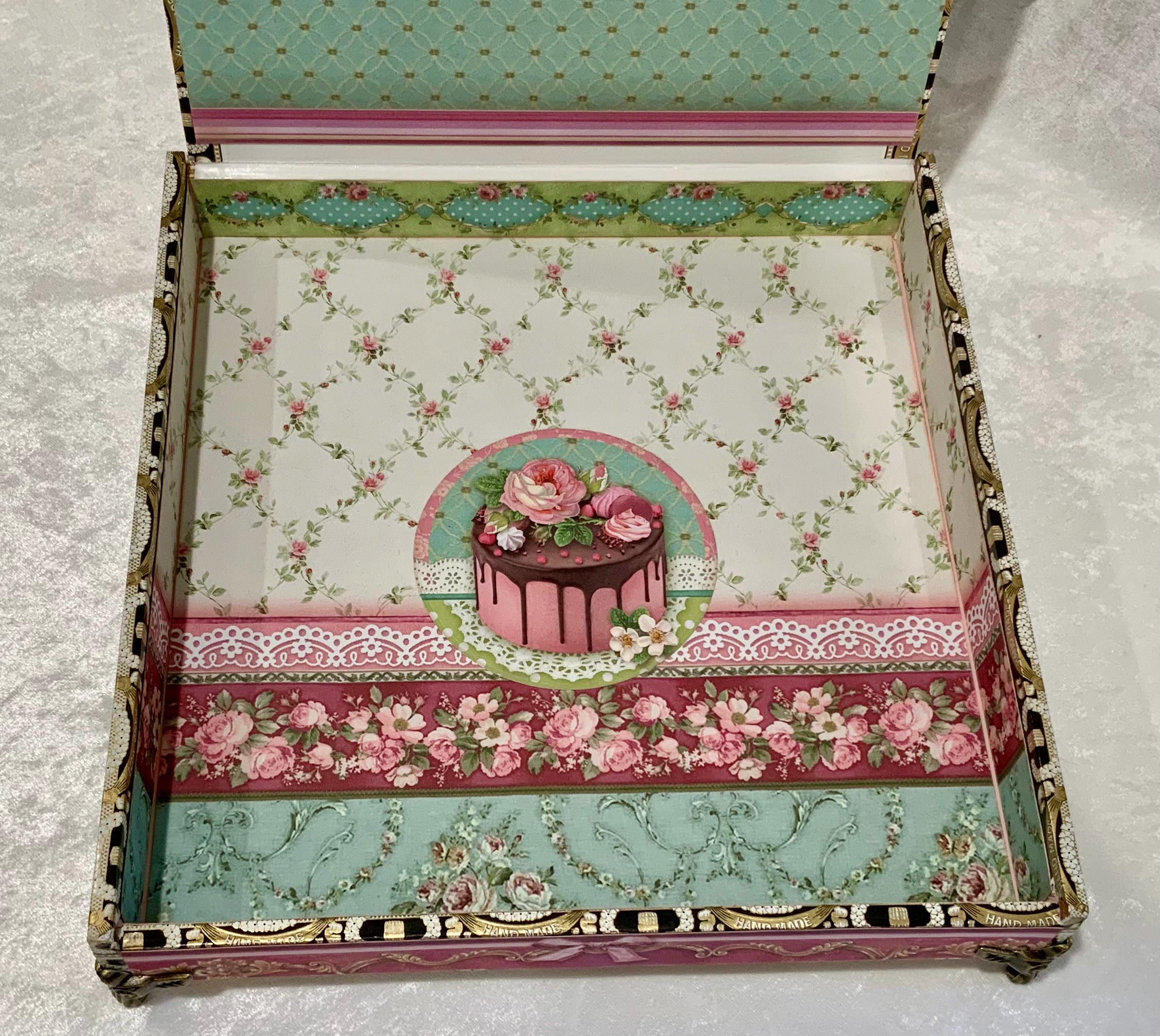 The inside features a coordinated floral base with a centered cake accent and a clean, open layout for storing jewelry, letters, small keepsakes, sewing notions, or other treasured items. A faceted glass knob and bronze scroll feet give the box a refined finishing touch.