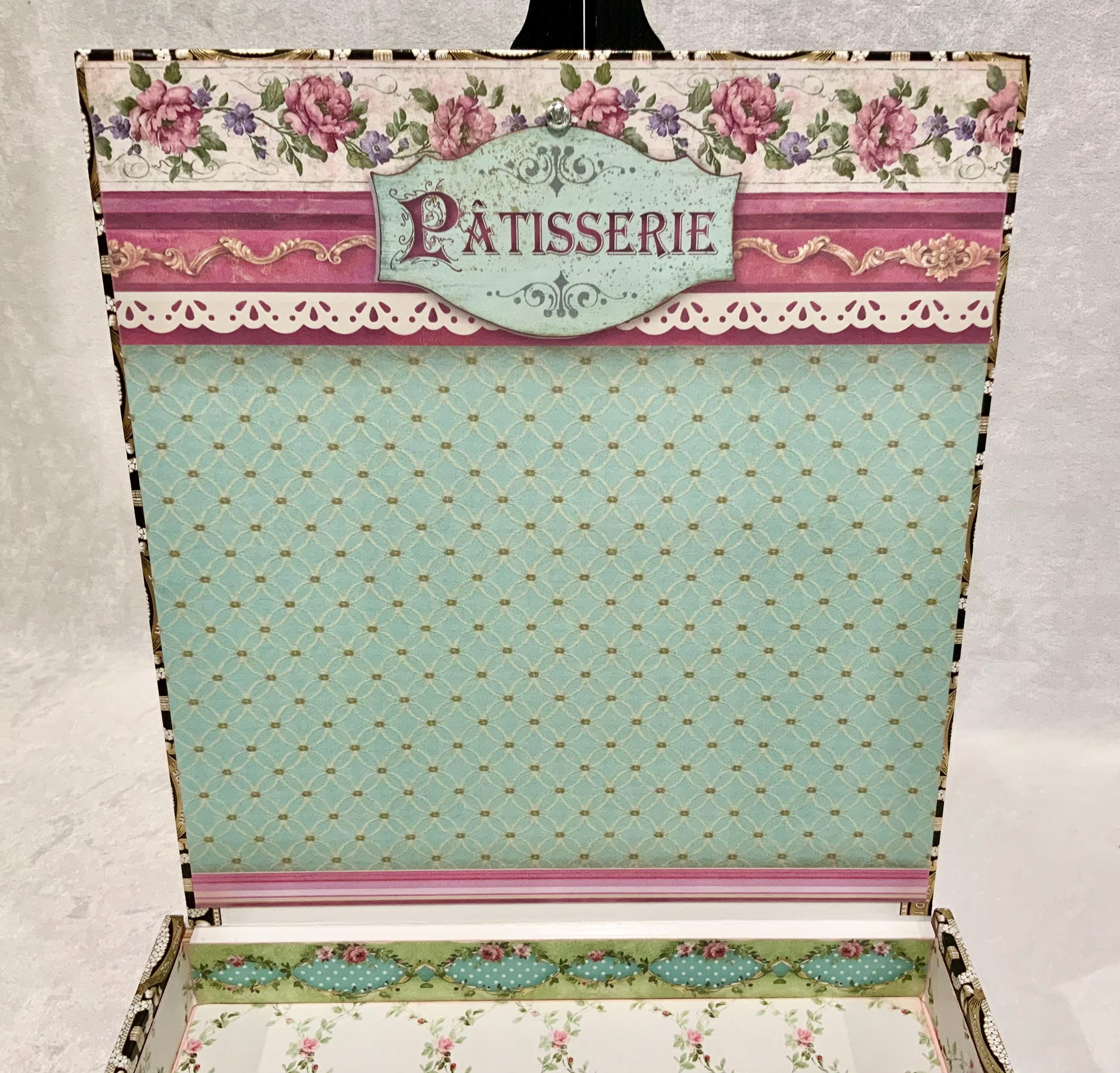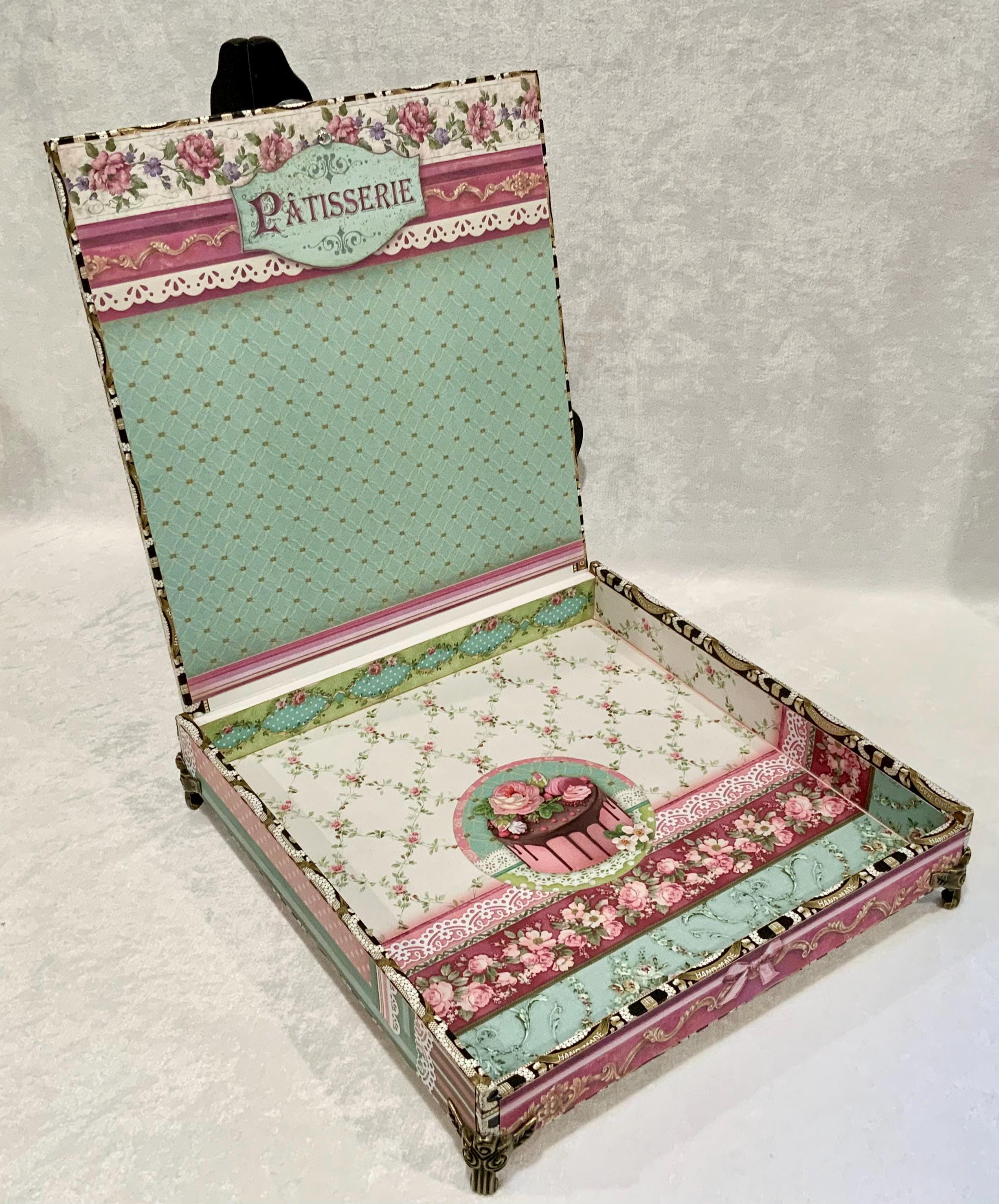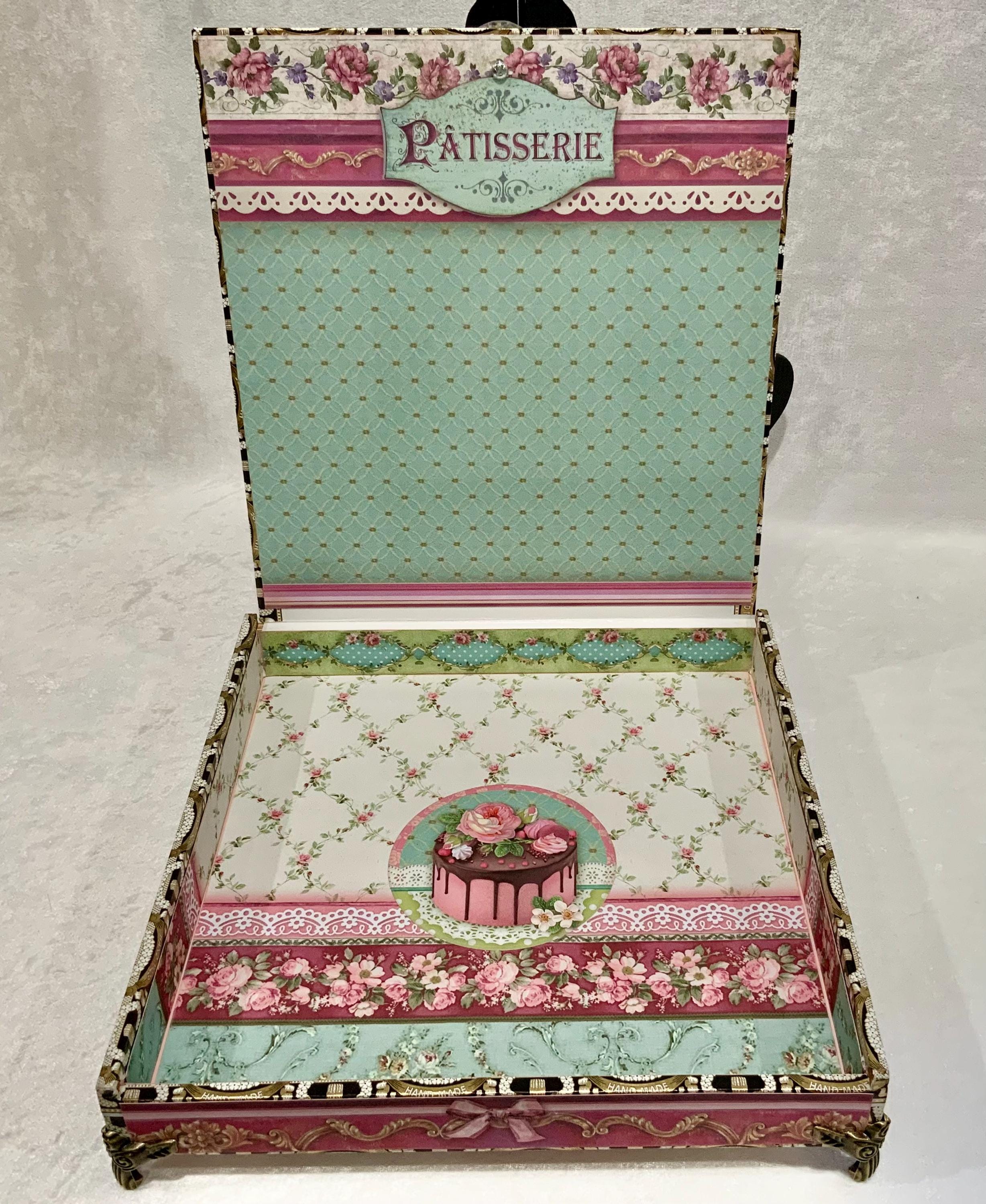 The inside features a coordinated floral base with a centered cake accent and a clean, open layout for storing jewelry, letters, small keepsakes, sewing notions, or other treasured items. A faceted glass knob and bronze scroll feet give the box a refined finishing touch.