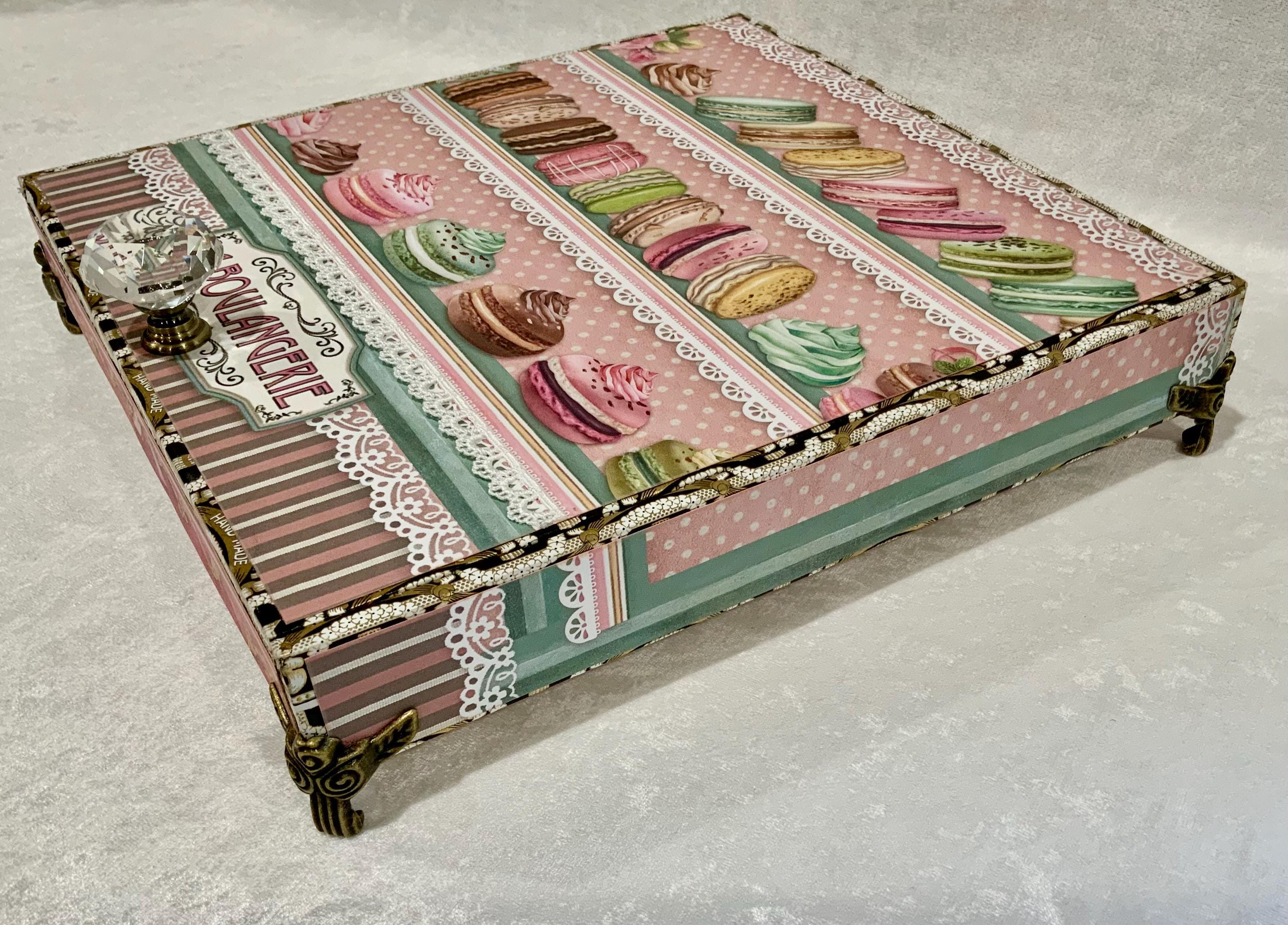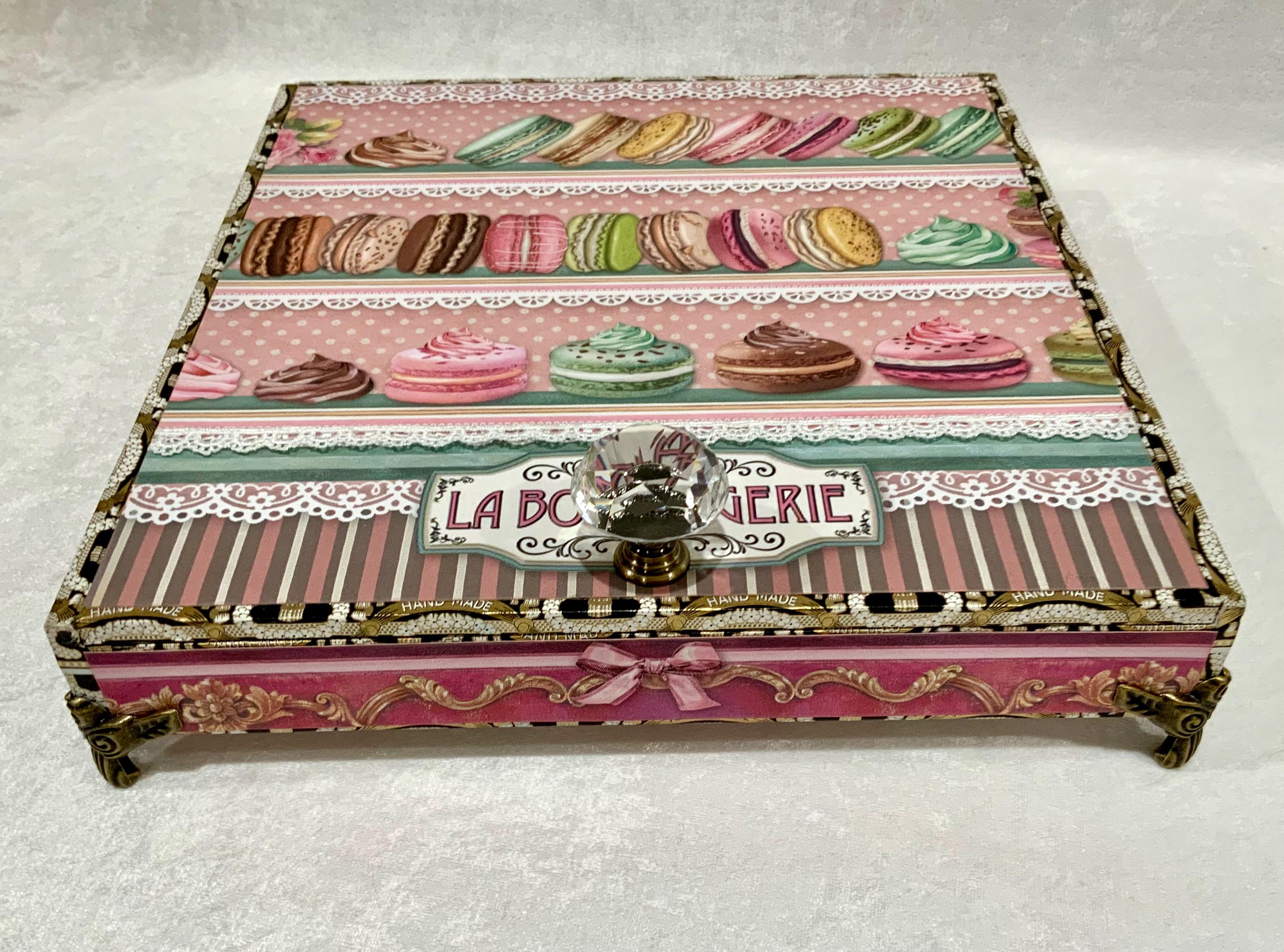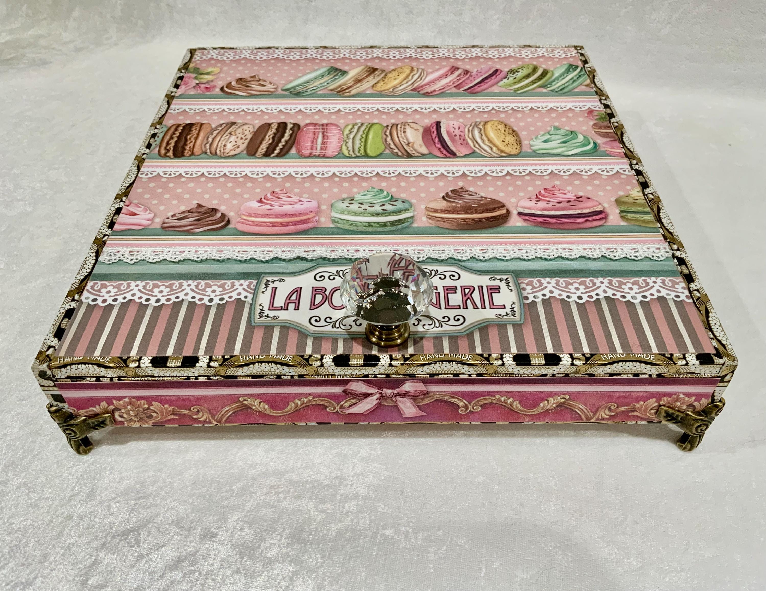 This romantic decorated cigar box is designed in soft shades of pink, aqua, cream, and chocolate, with rows of macarons, delicate lace detail, and a sweet bakery-inspired style. The larger 10x10 size gives this piece a more spacious feel, making it both beautiful to display and practical to use.