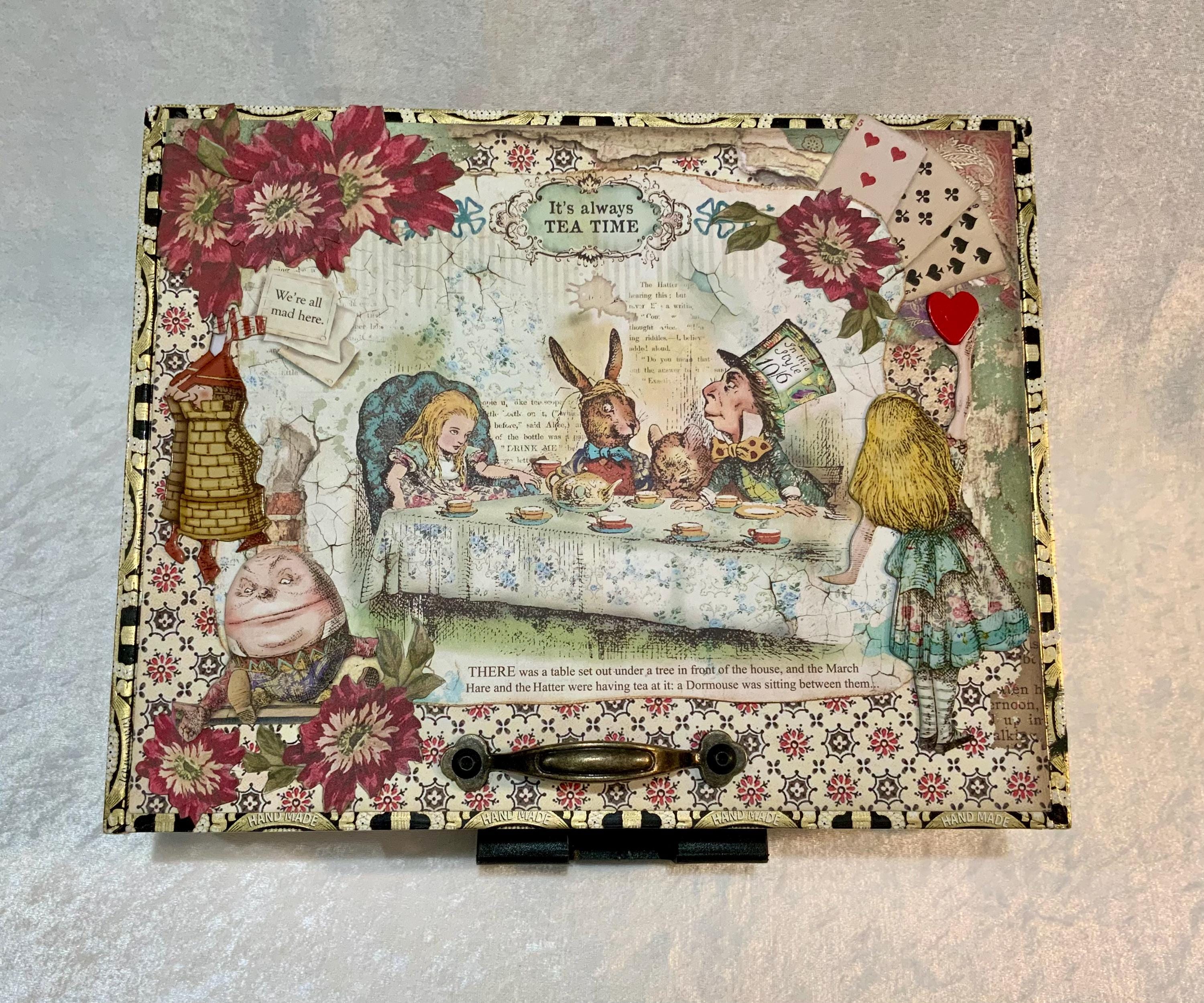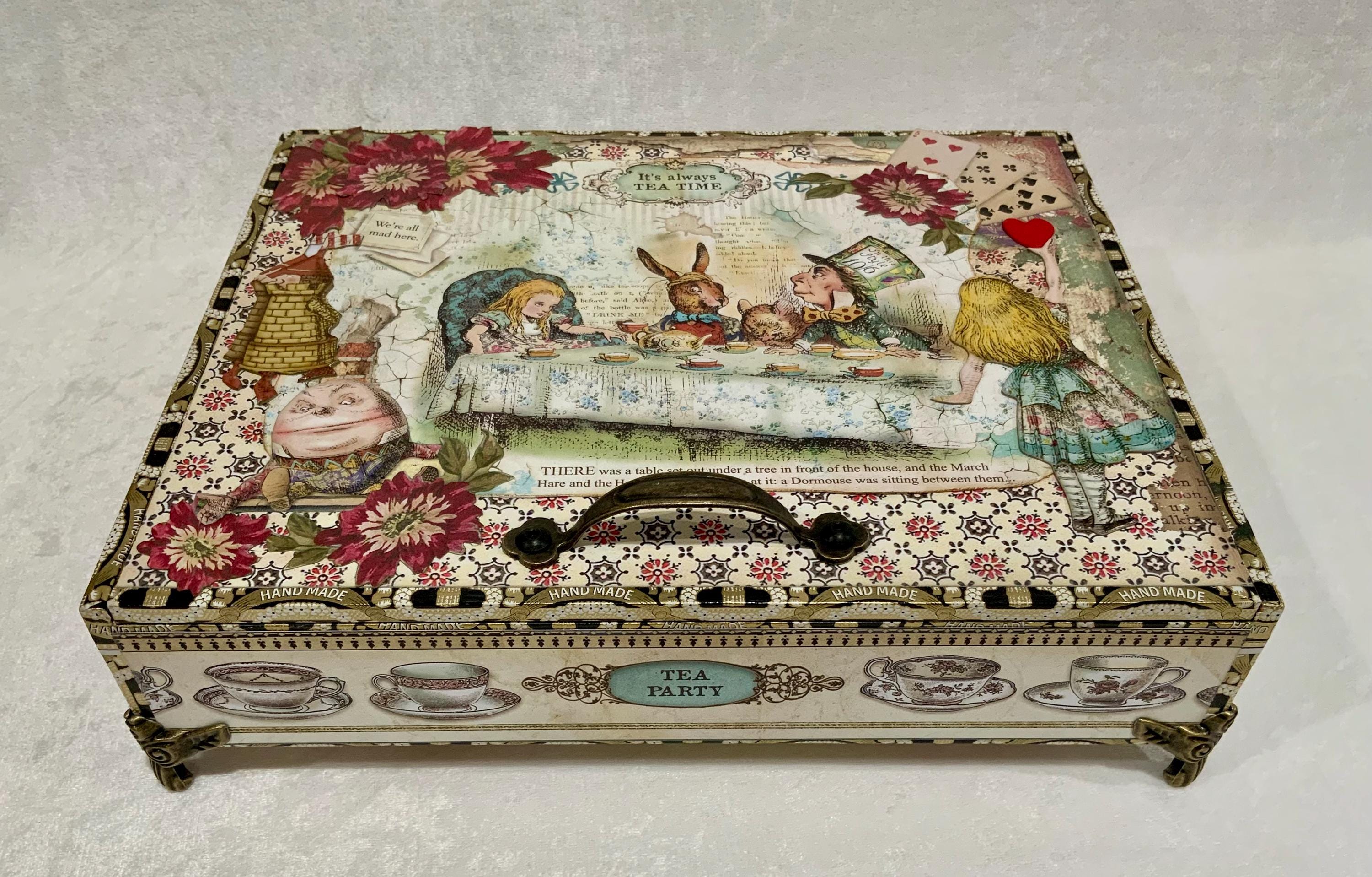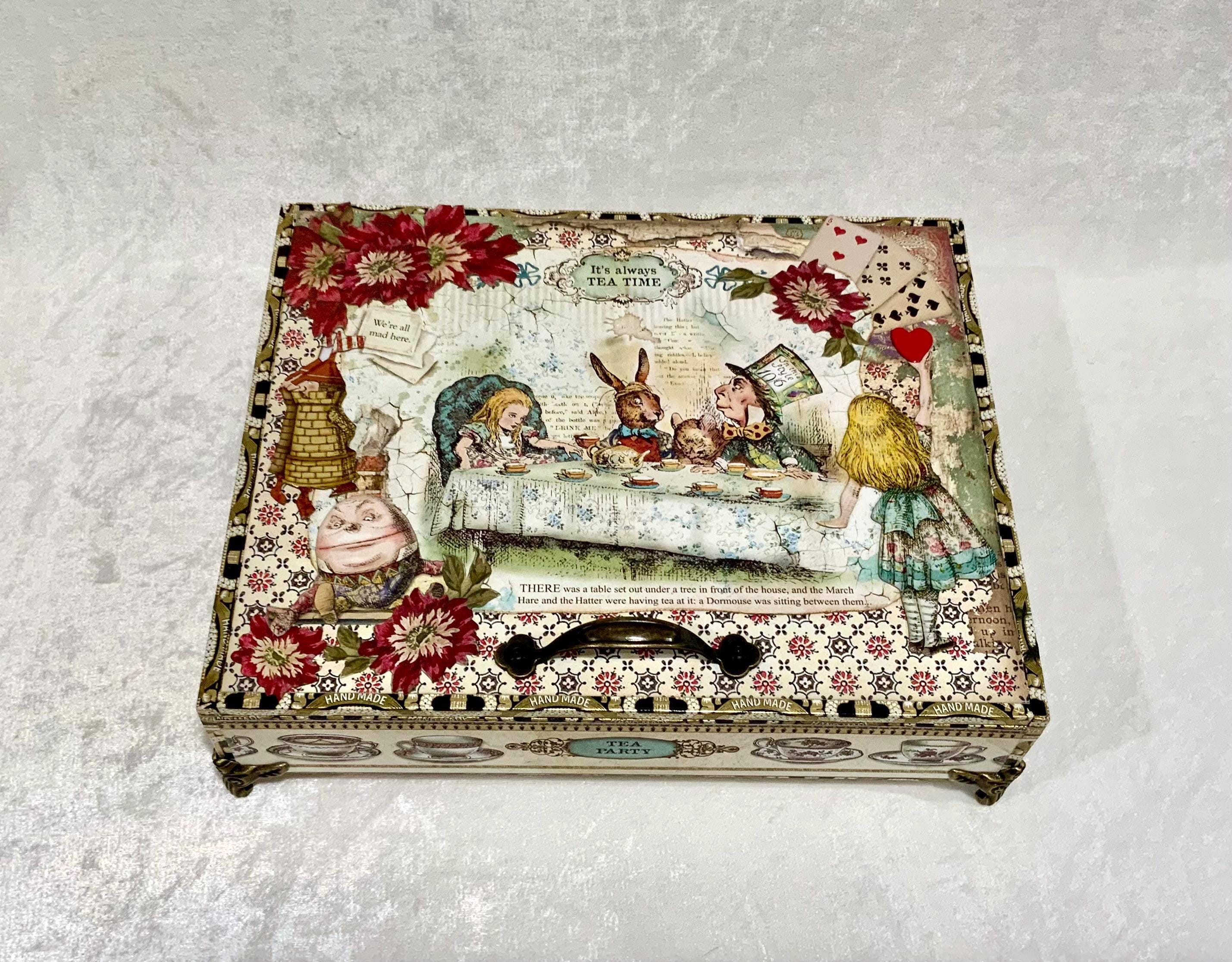 Alice in Wonderland Tea Party Keepsake Box, Handcrafted Memory Jewelry Storage (10x8x2)