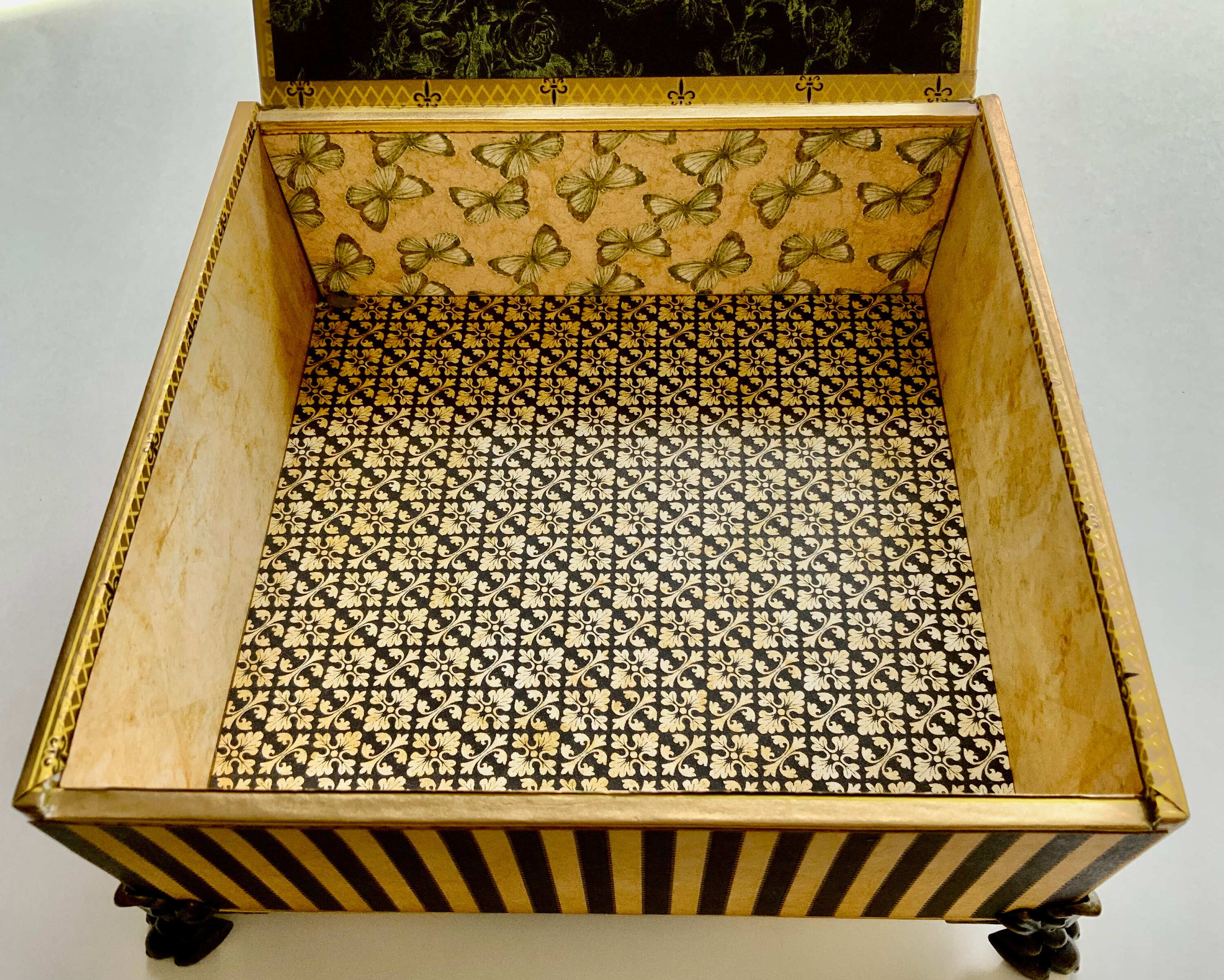 All boxes are thoroughly aired out before decorating to ensure there’s no residual odor. I also clean and line each one with care. All work is done in a smoke-free studio, and your box will arrive fresh and ready to enjoy.