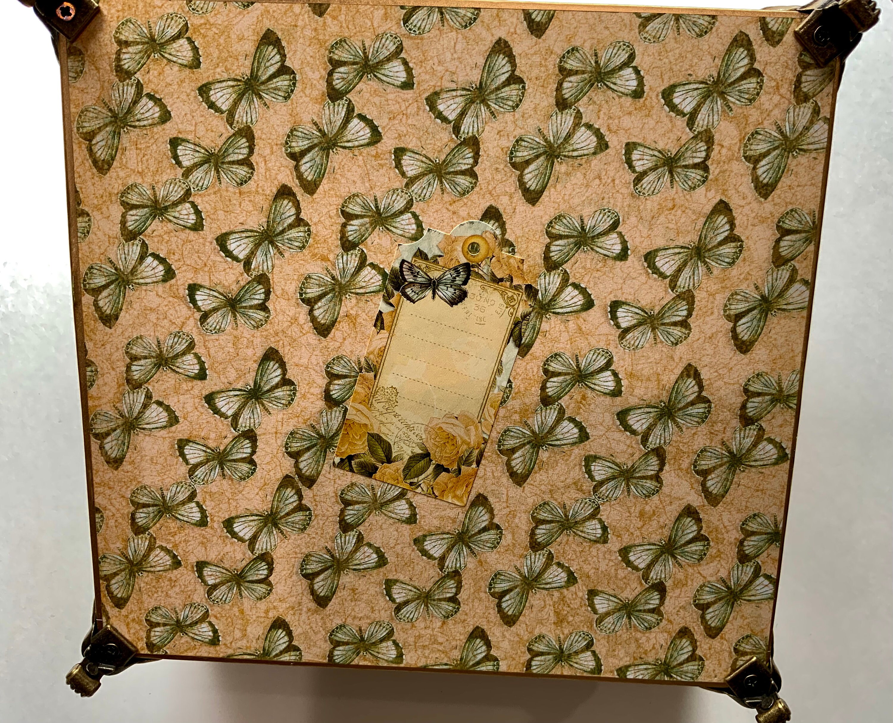 All of my keepsake boxes are authentic upcycled cigar boxes. I carefully select the best ones to decorate, and most surfaces are covered with premium papers, trims, and embellishments. For my Camacho “piano finish” boxes, the glossy black lids may show faint surface scratches from their original life — these are minor and add to the authentic character of the box.