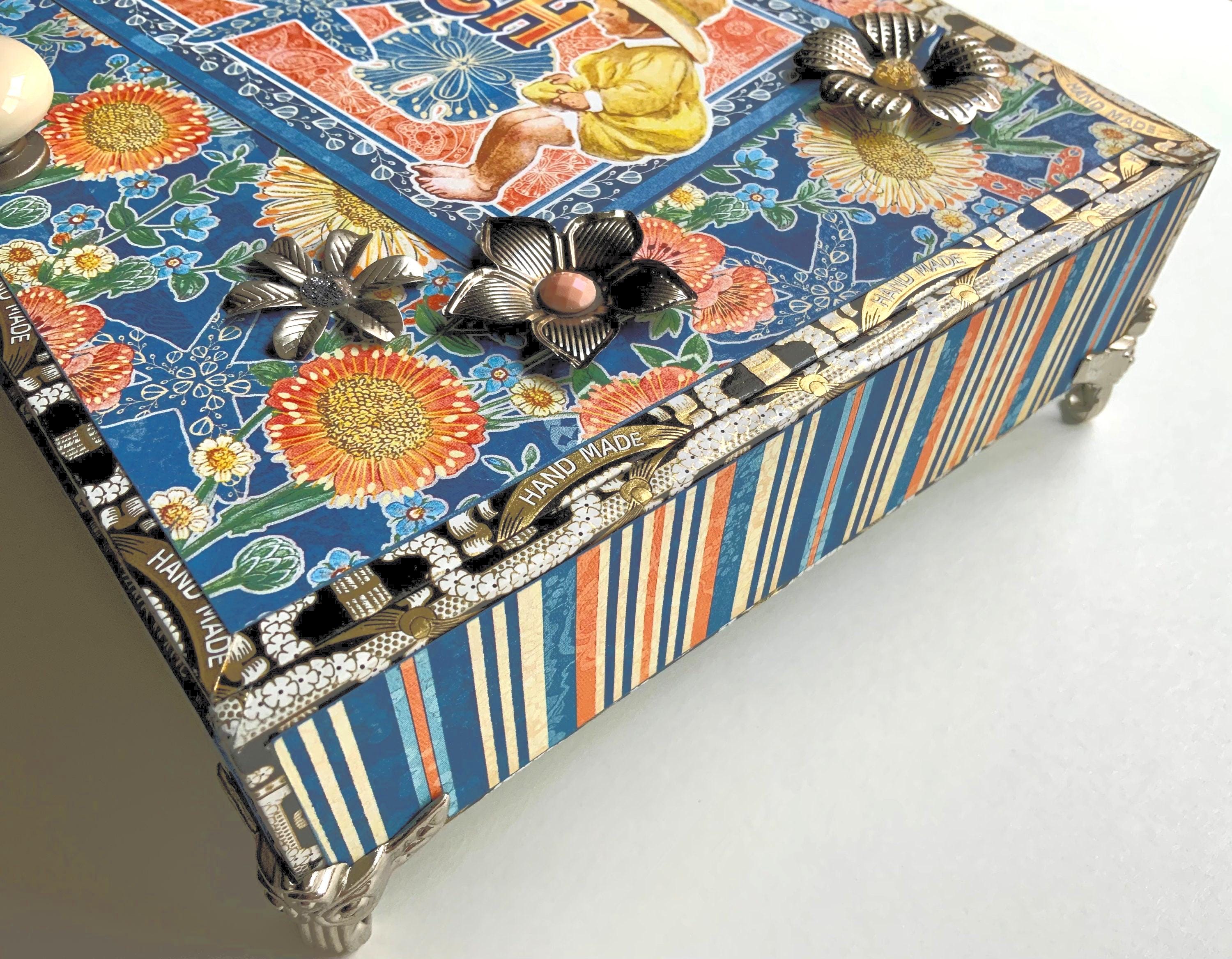All of my keepsake boxes are authentic upcycled cigar boxes. I carefully select the best ones to decorate, and most surfaces are covered with premium papers, trims, and embellishments. For my Camacho “piano finish” boxes, the glossy black lids may show faint surface scratches from their original life — these are minor and add to the authentic character of the box.