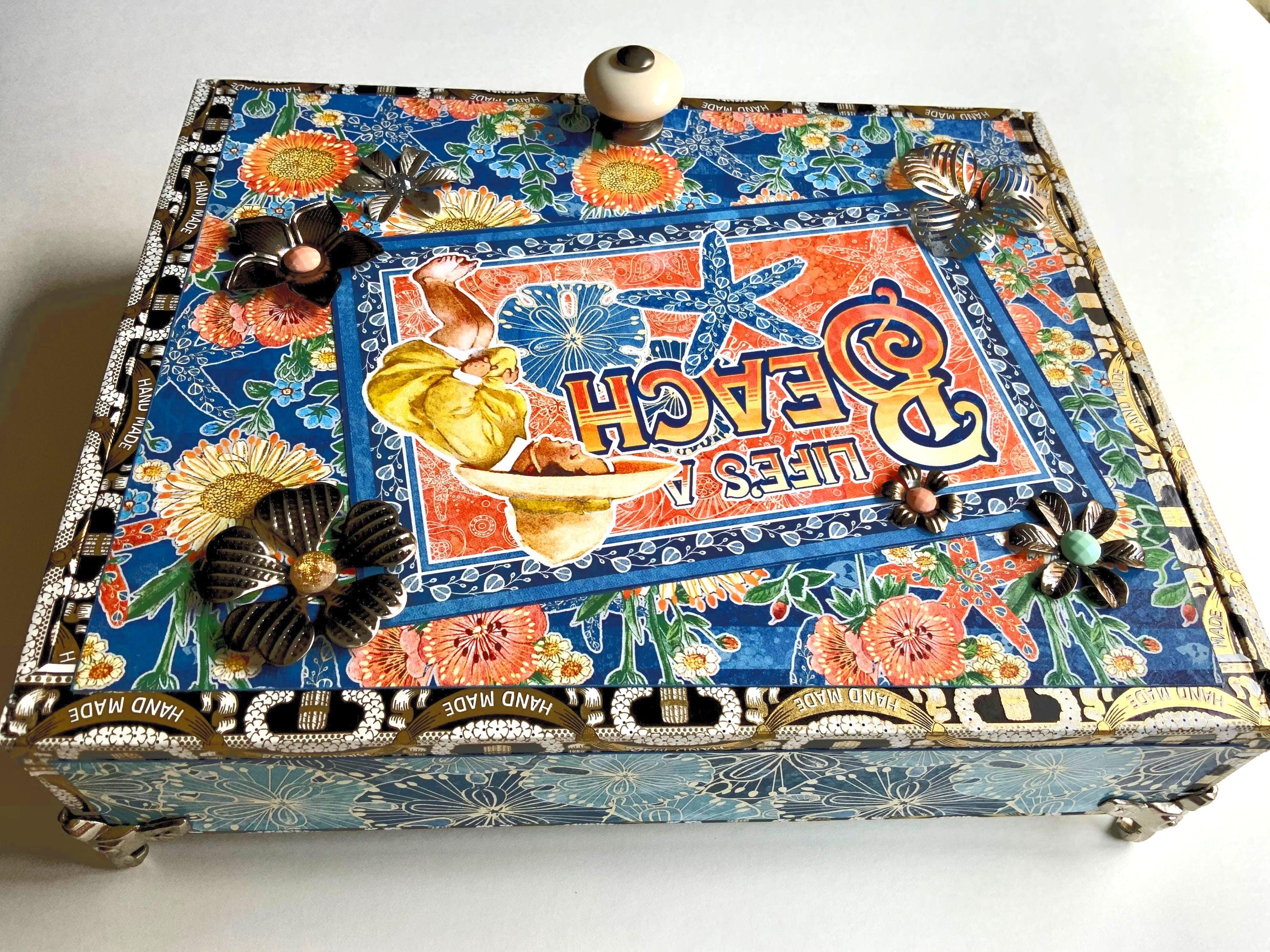 Life’s a Beach Decorated Cigar Box – Coastal Memory Box with Vintage Nautical Kids, Flowers & Metal Accents – Handmade Gift - Beach Decor