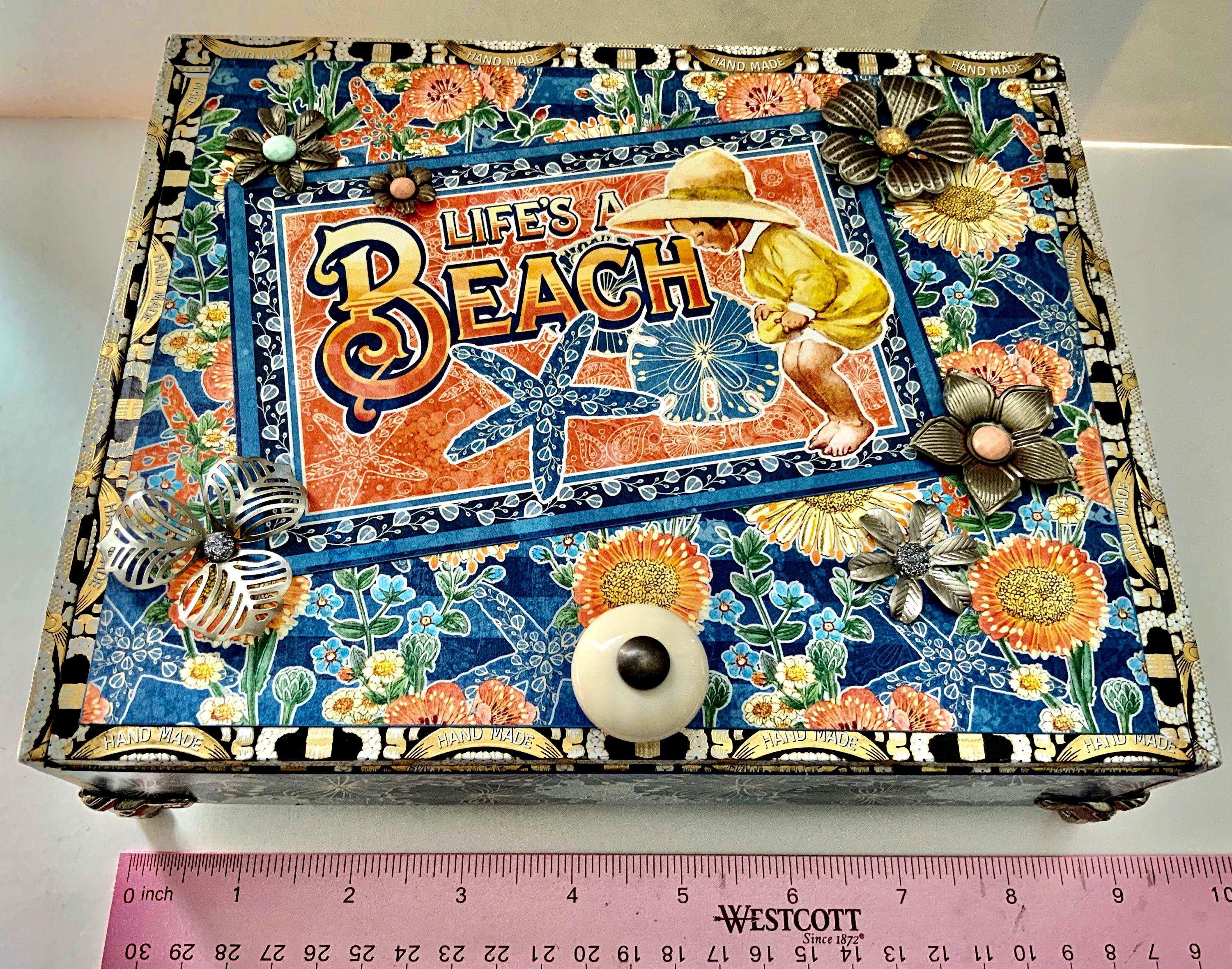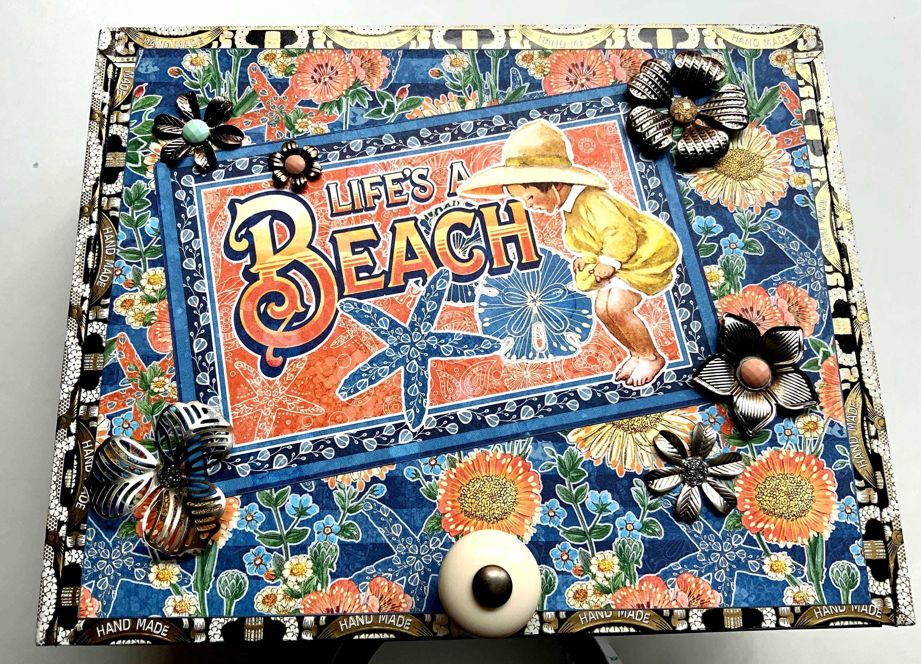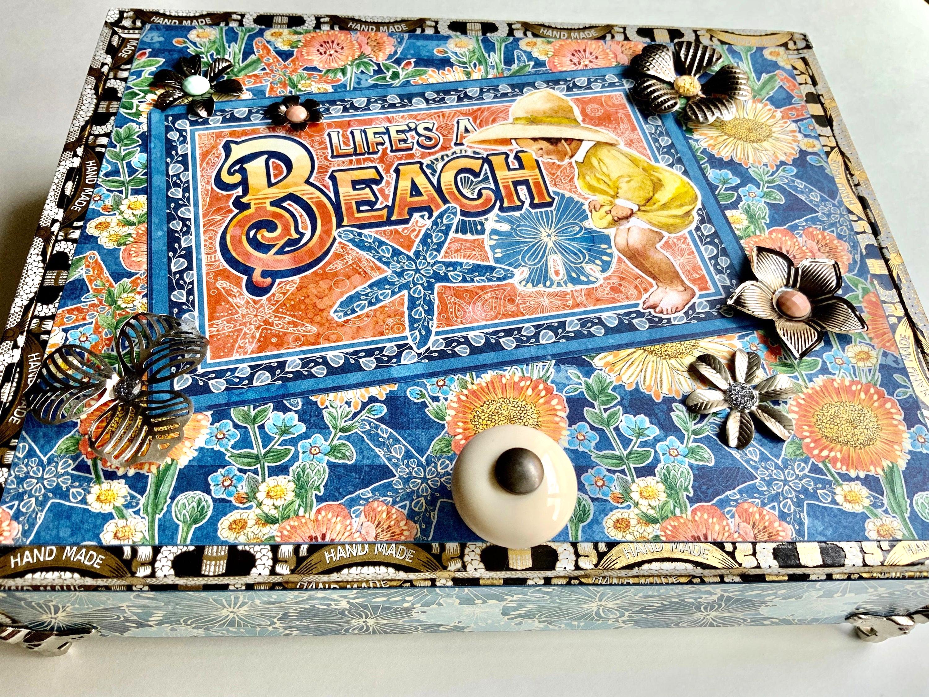 Bring the nostalgia of sun-kissed days to life with this embellished coastal-themed decorated cigar box. Topped with a cheerful “Life’s a Beach” design featuring vintage illustrations of children playing at the shore, the lid is richly adorned with layered metal flowers, pearl centers, and a classic cream-and-bronze knob.