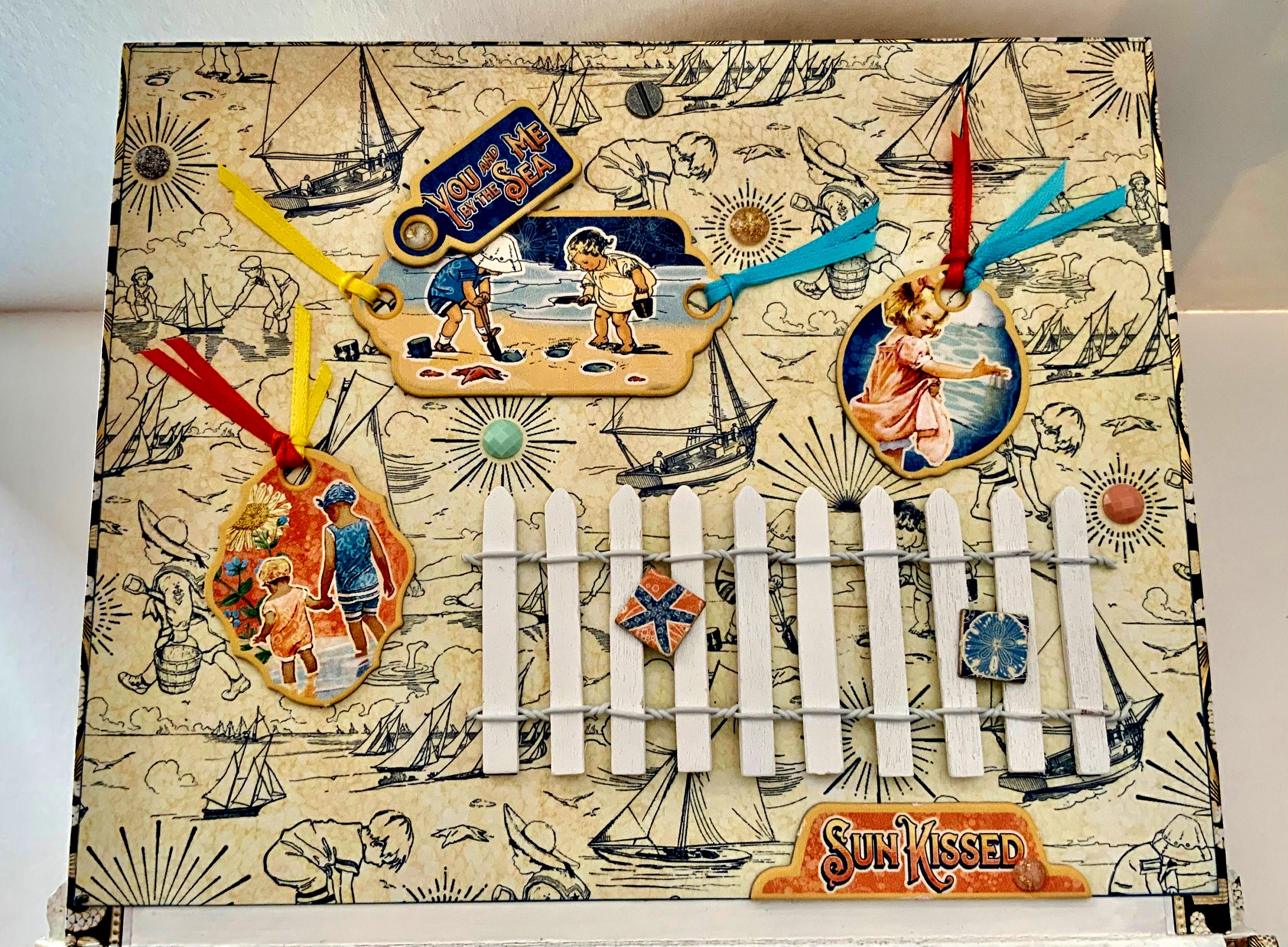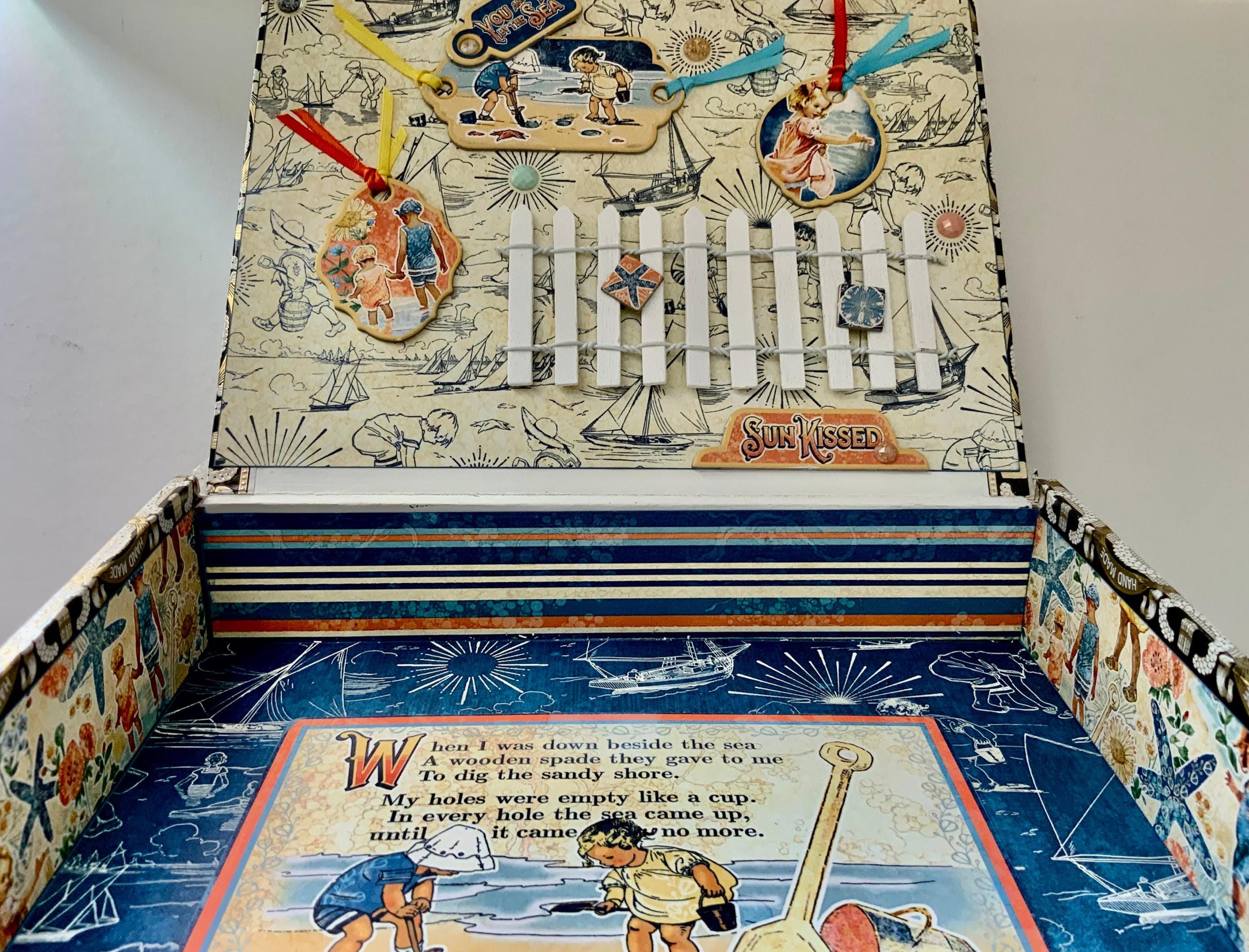 Inside, whimsical nautical illustrations of boats and sunbursts create a charming backdrop for a seaside poem panel, while a white picket fence, retro beach tags, and vibrant ribbons complete the cheerful design.