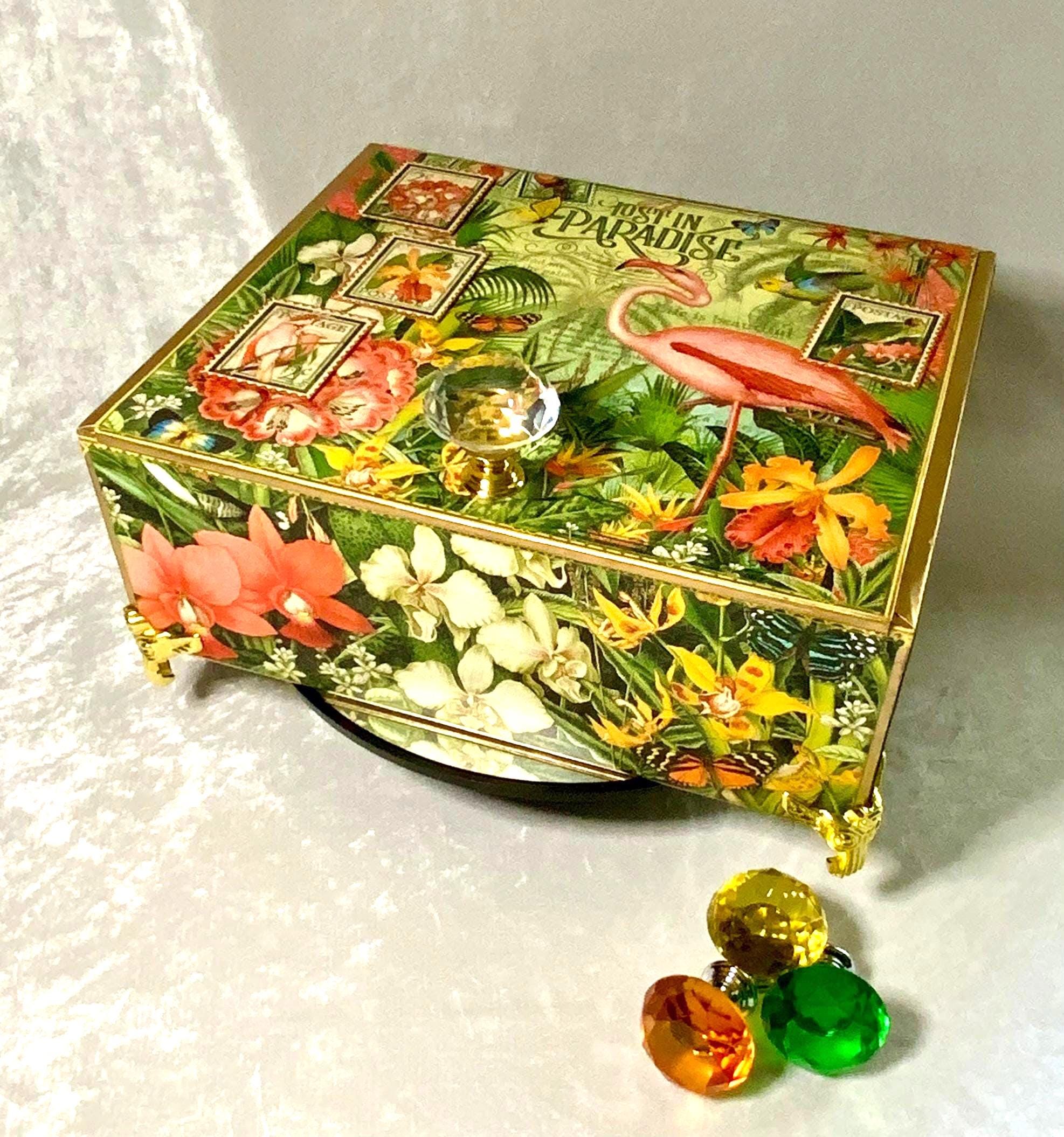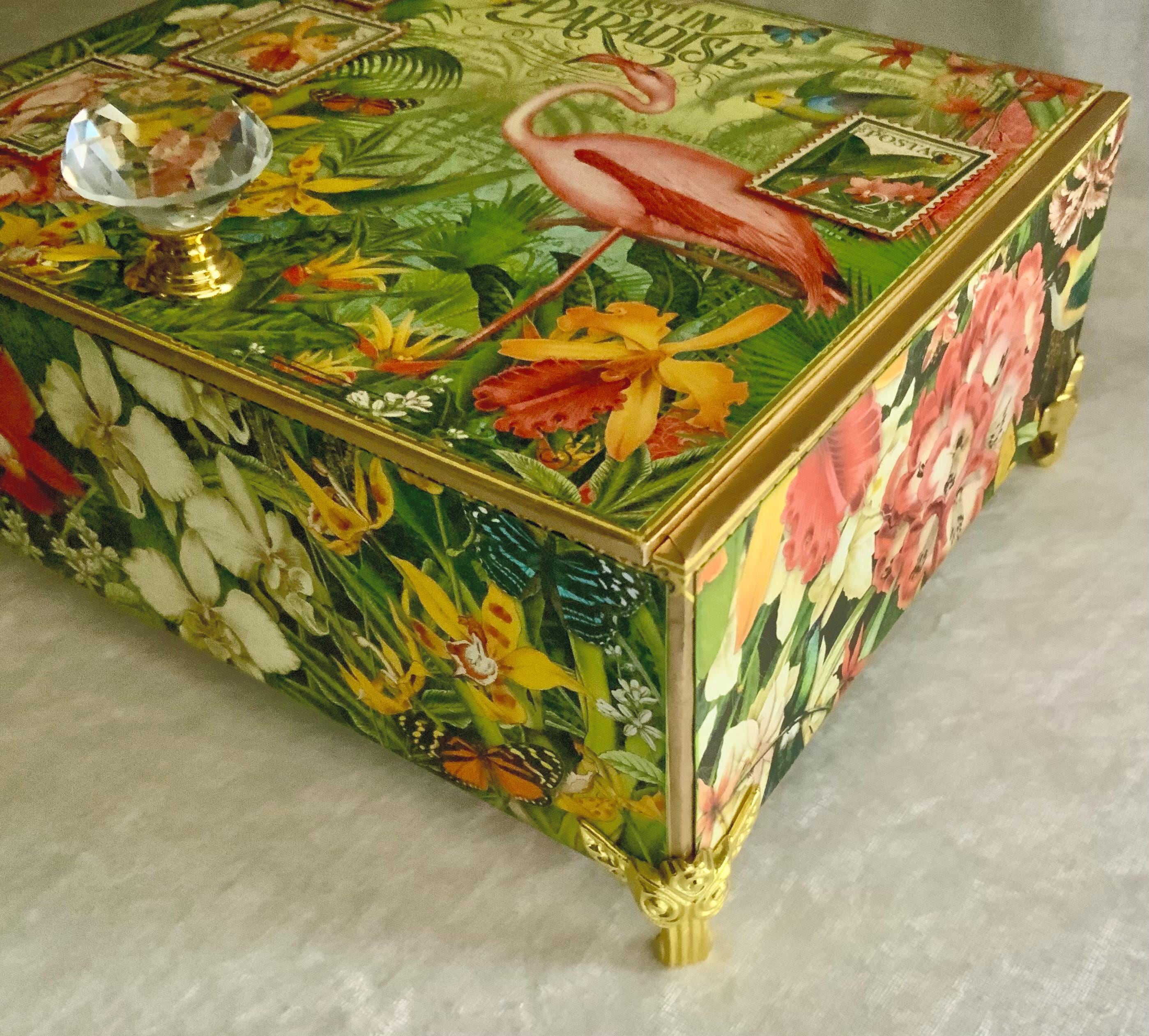 The lid showcases a pink flamingo surrounded by orchids, butterflies, and bright jungle blooms. A large crystal-glass knob adds a touch of elegance and sparkle. The lid is decorated with vintage-style postage prints, while the interior reveals more lush illustrations and tropical stamps. A bright colorful lining adds a luscious finishing touch.