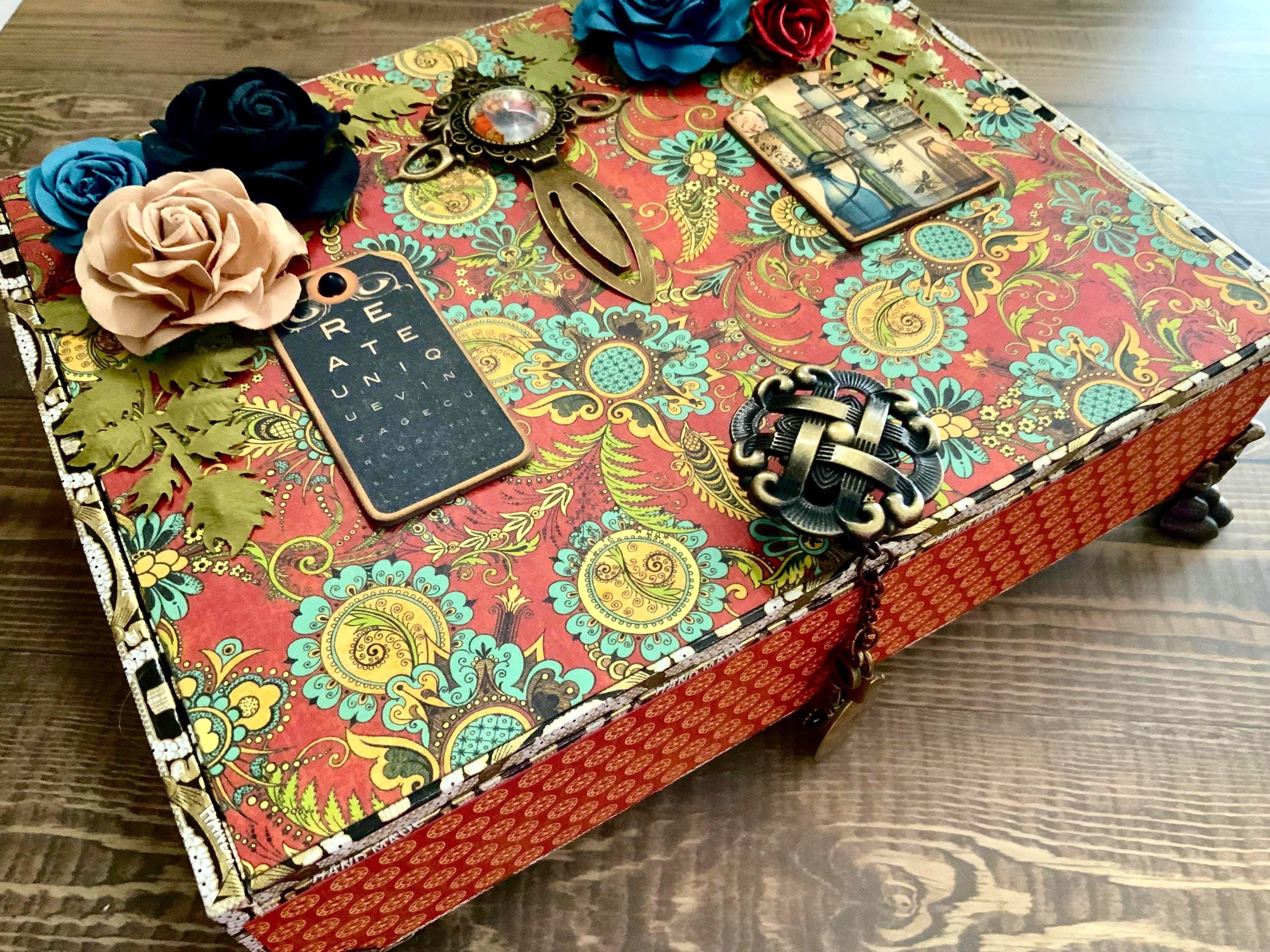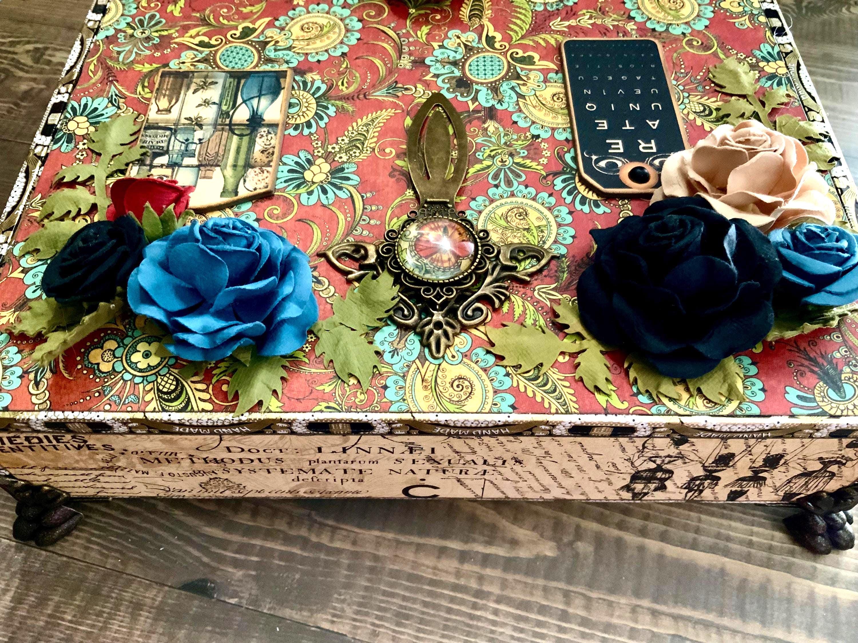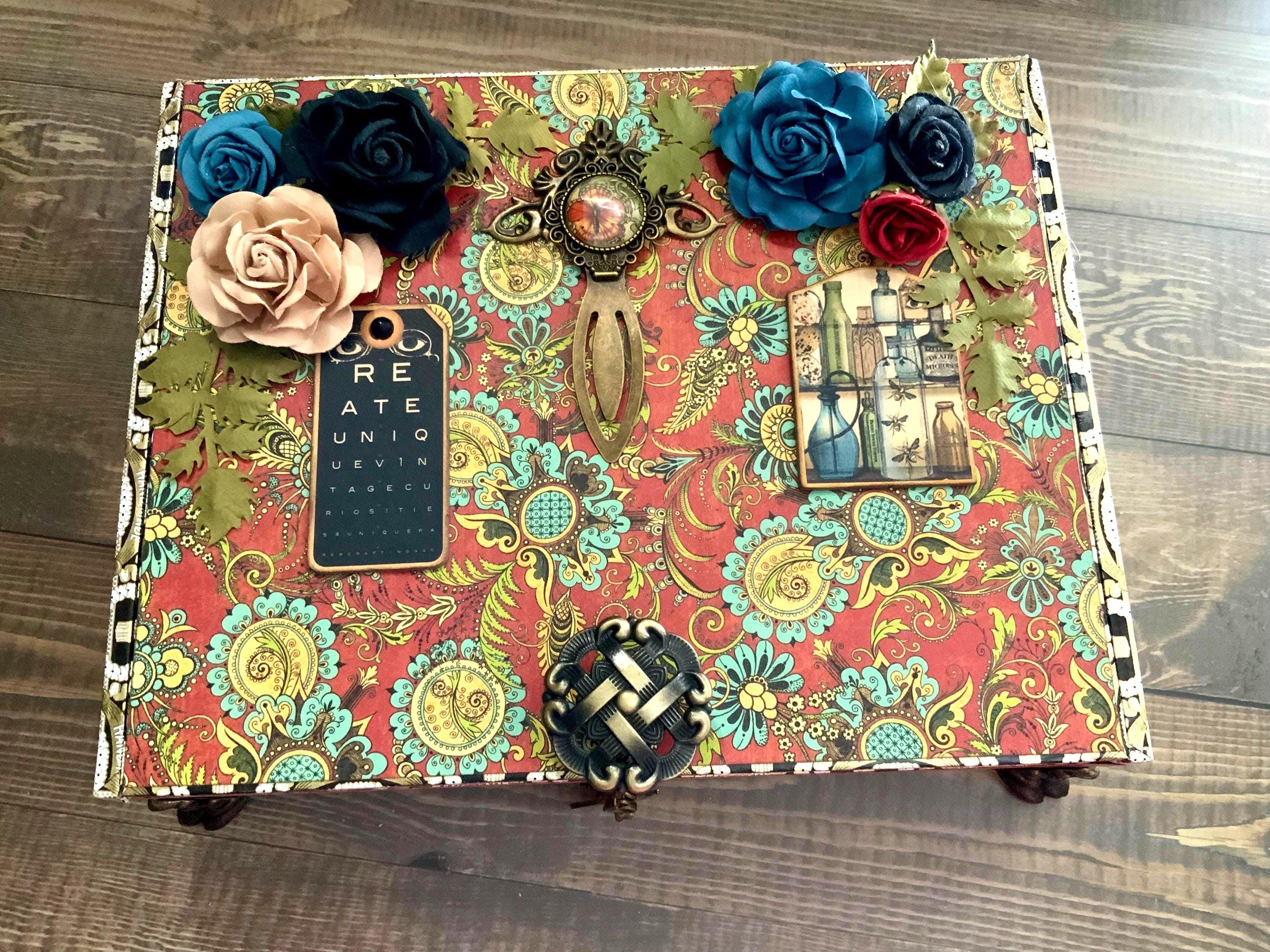 Step into a whimsical world of wonder with this fully embellished keepsake cigar box, decorated using the Olde Curiosity Shoppe collection by Graphic 45. Featuring the signature page and hand-selected coordinating papers, this box is bursting with nostalgic oddities, rich colors, and vintage flair.