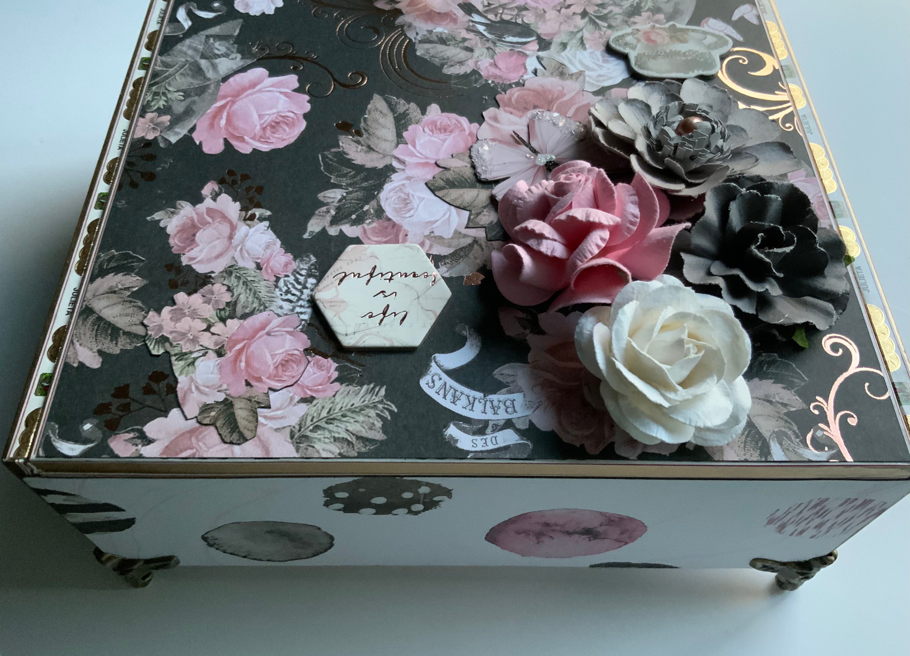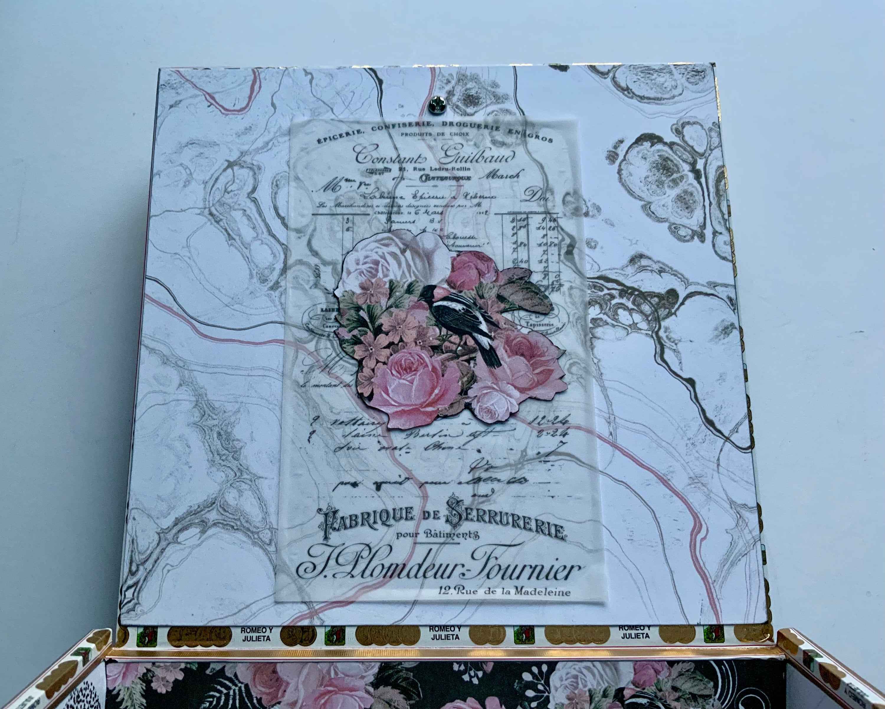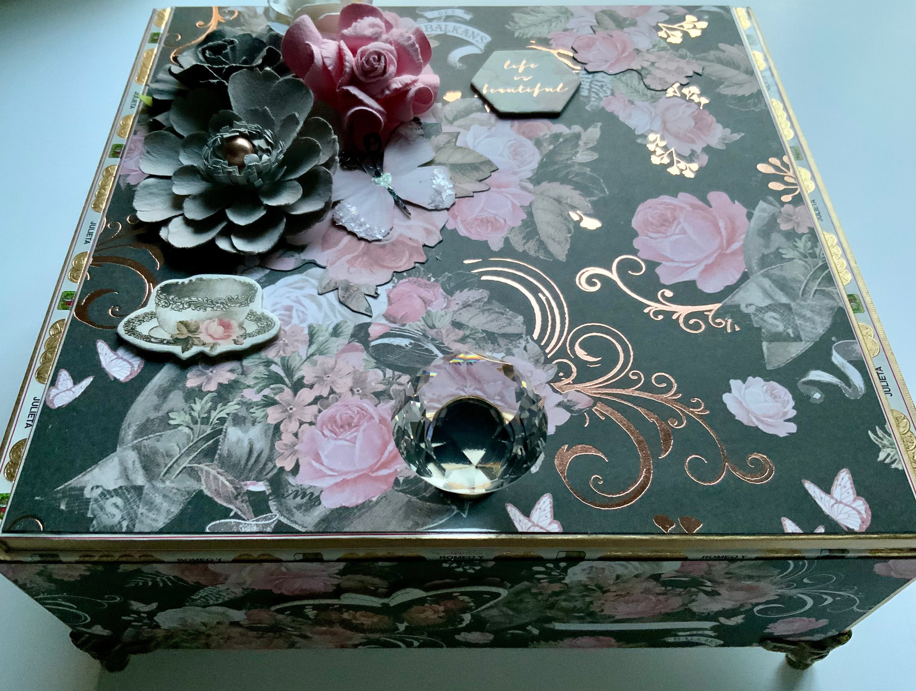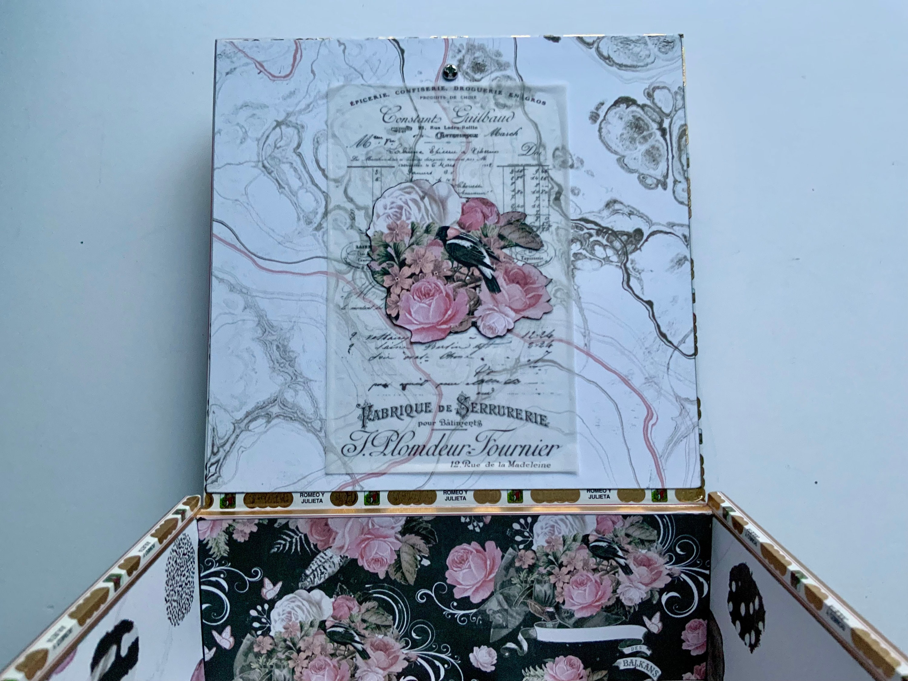 All of my keepsake boxes are authentic upcycled cigar boxes. I carefully select the best ones to decorate, and most surfaces are covered with premium papers, trims, and embellishments. For my Camacho âpiano finishâ boxes, the glossy black lids may show faint surface scratches from their original life â these are minor and add to the authentic character of the box.