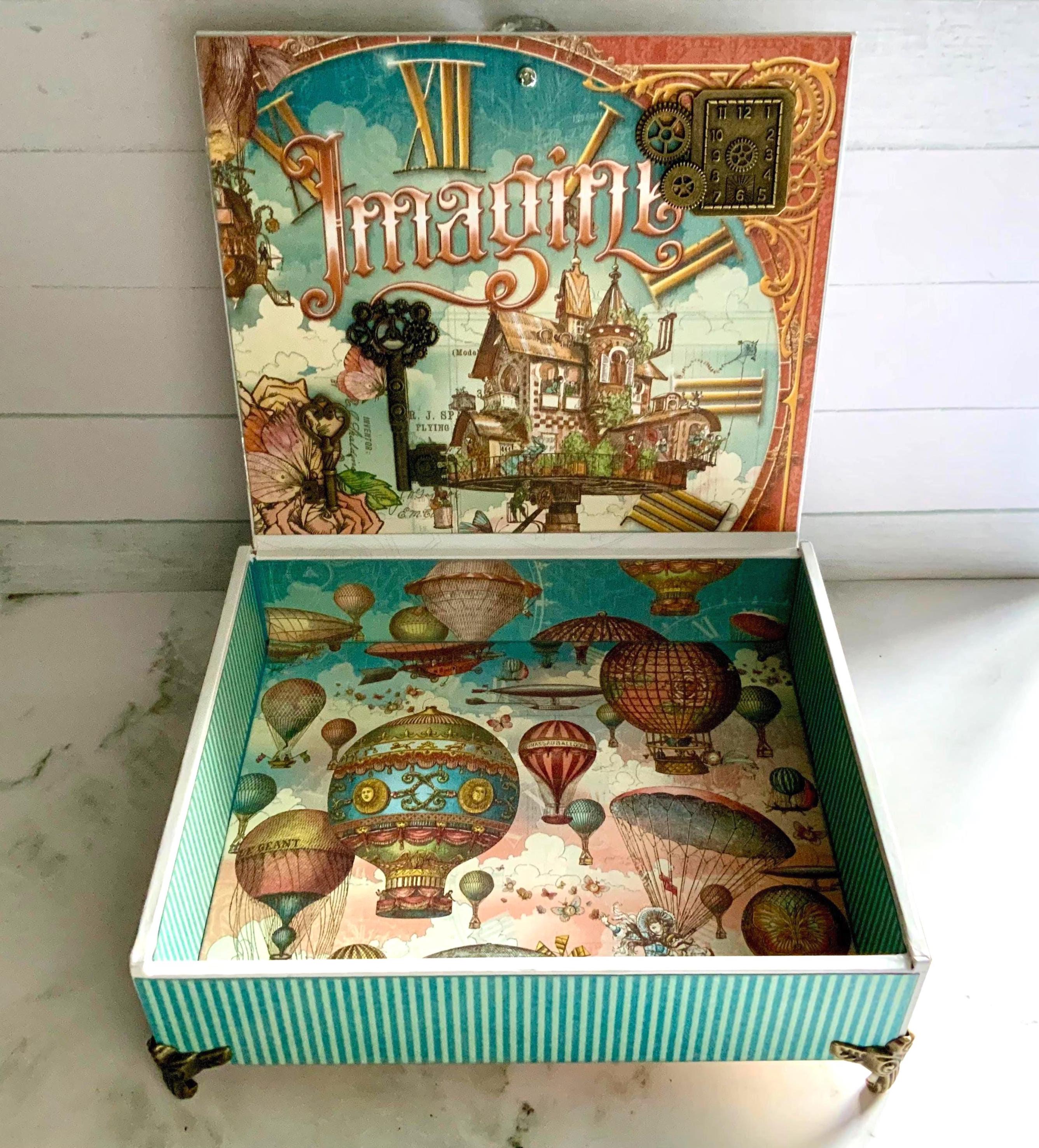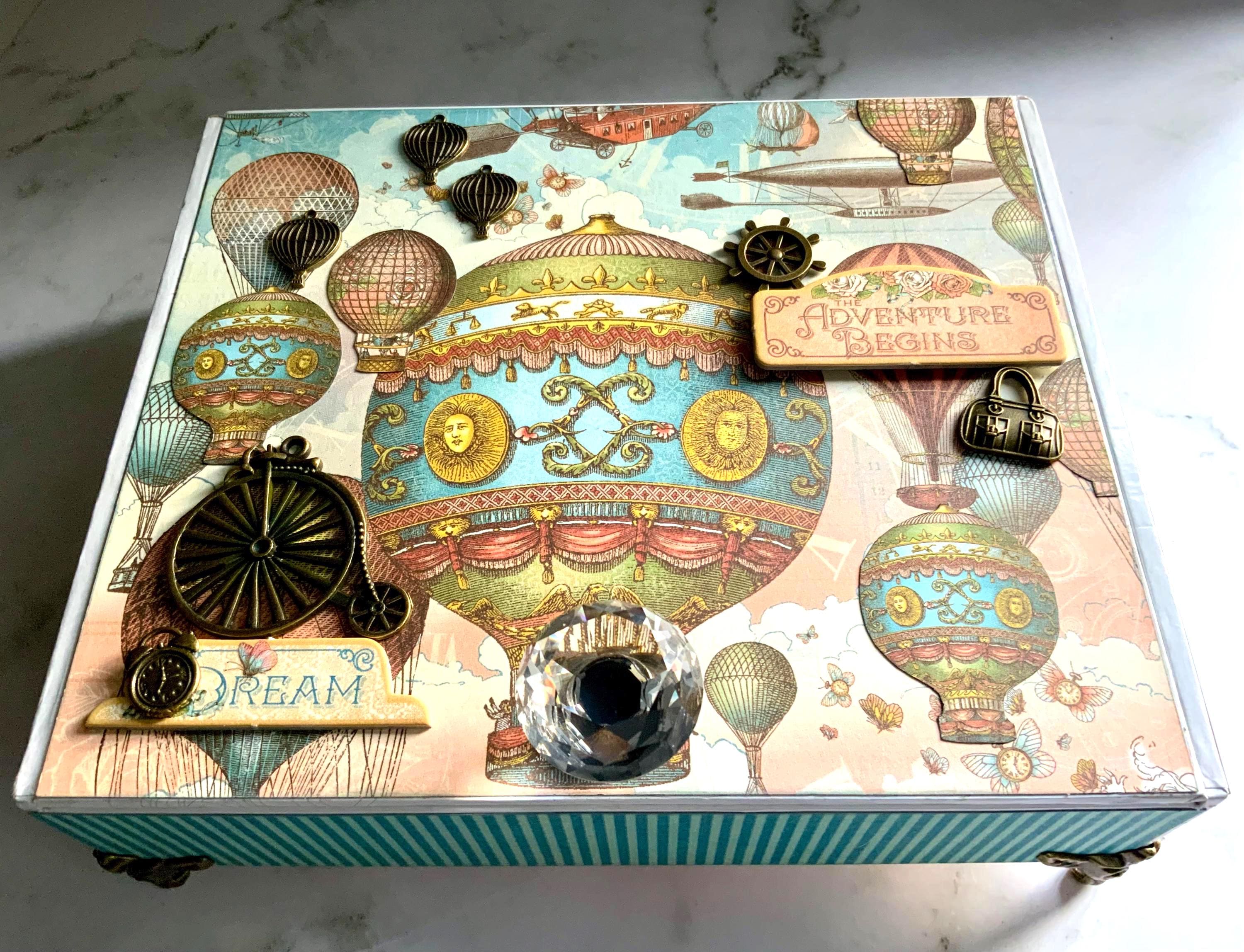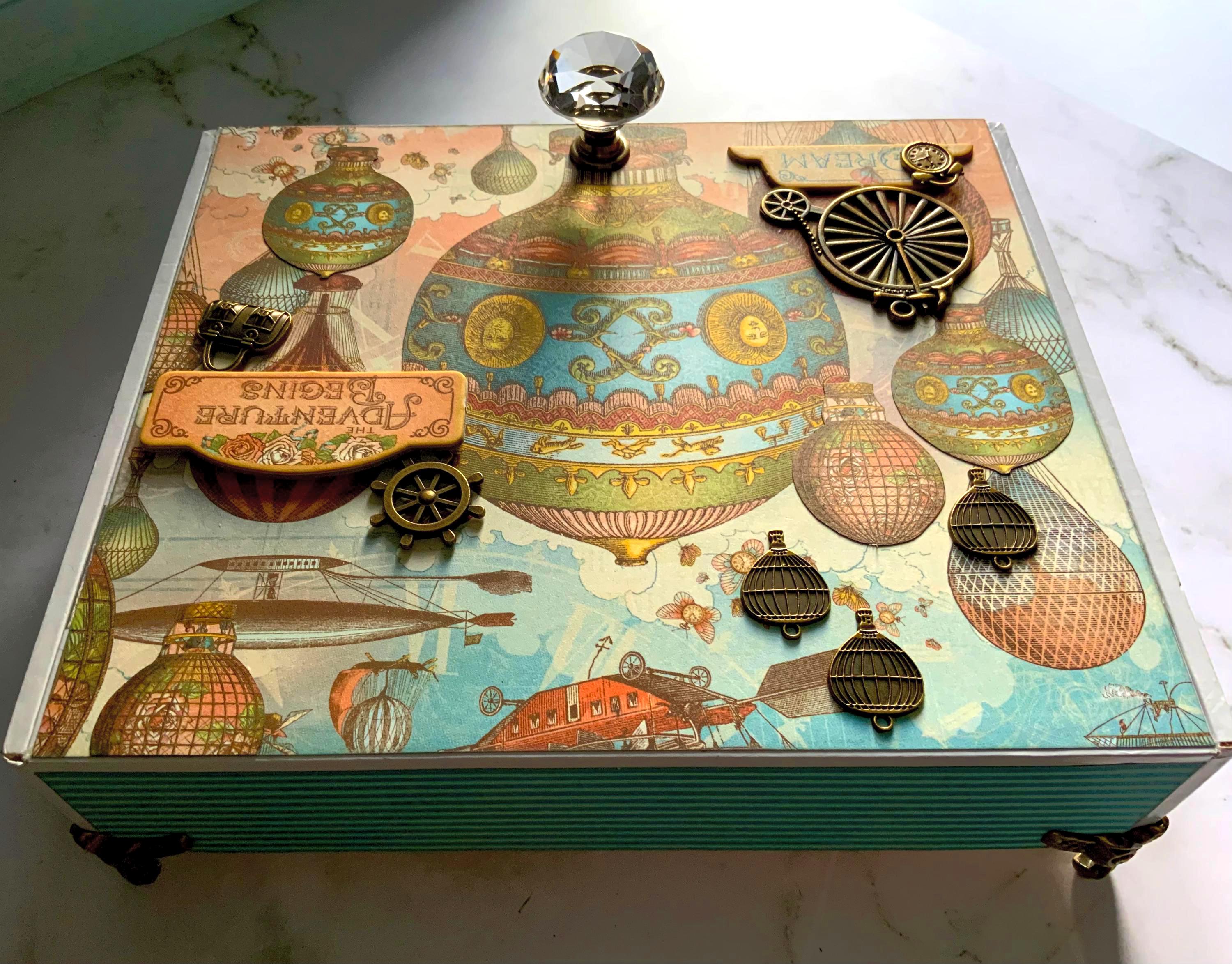 Decorated Cigar Box. Vintage Hot Air Balloon theme decorated box.
