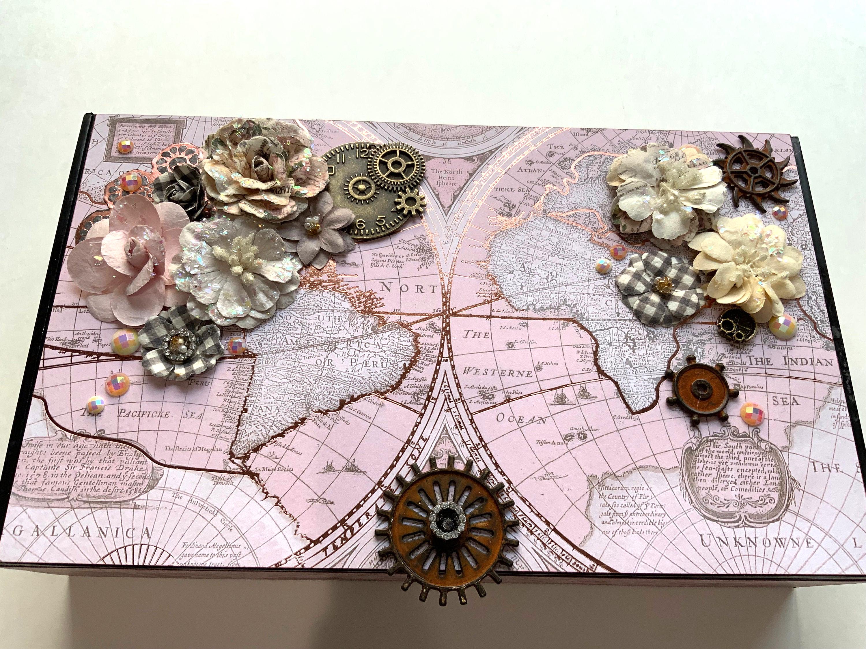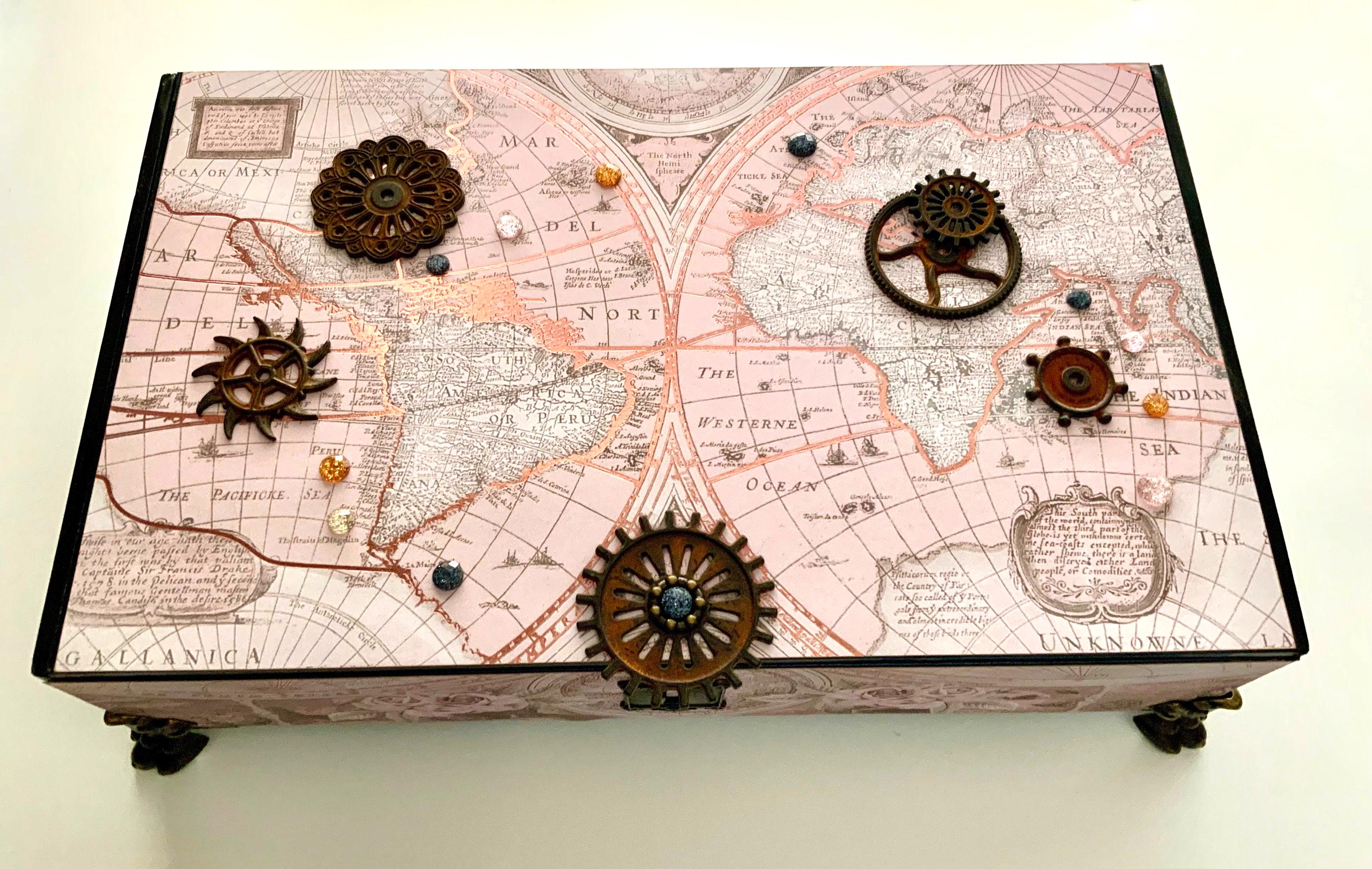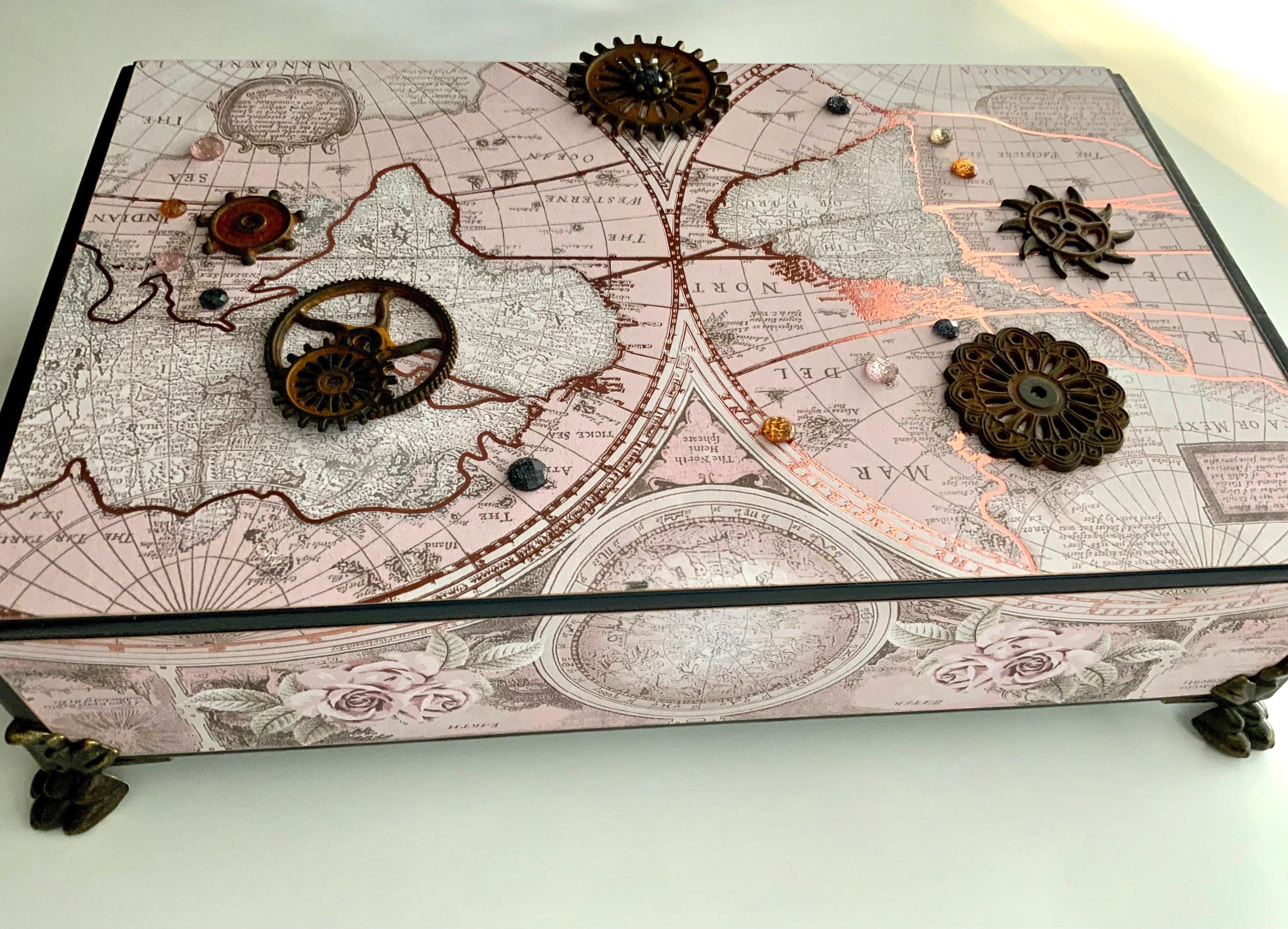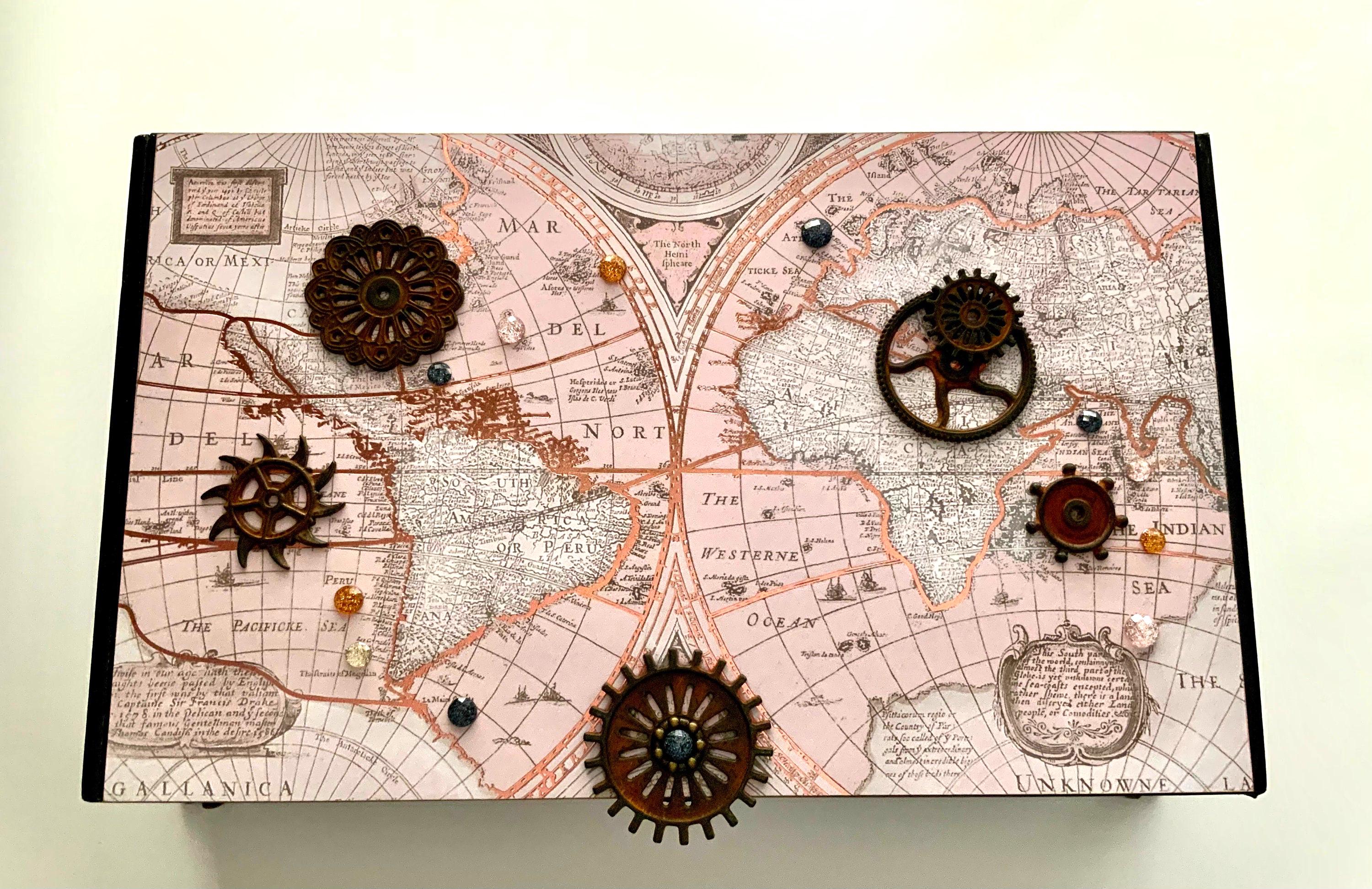 This stunning steampunk-inspired cigar box features a pale pink world map accented with bronze gears, sparkling gems, and vintage charm. Handmade from a repurposed cigar box, it blends industrial design with romantic flair—perfect for the adventurer, dreamer, or collector.
