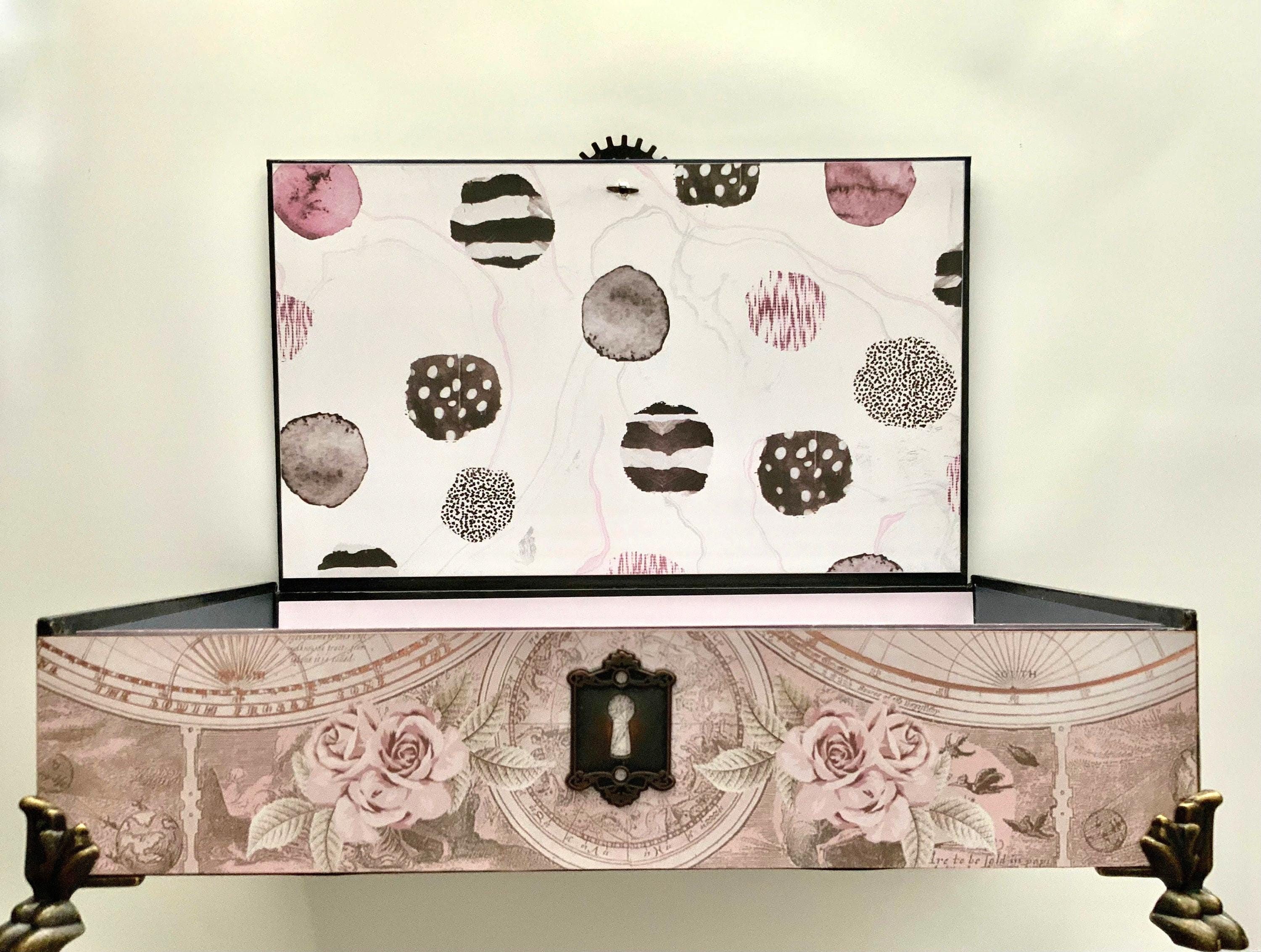 The paper is pinks and grays with rose gold foil accents. I lined up the map to match the inside top and inside bottom together as a continuation of the map. It is a gorgeous box! The option for flowers on the lid is available-no charge. It will have fewer rusty gears.