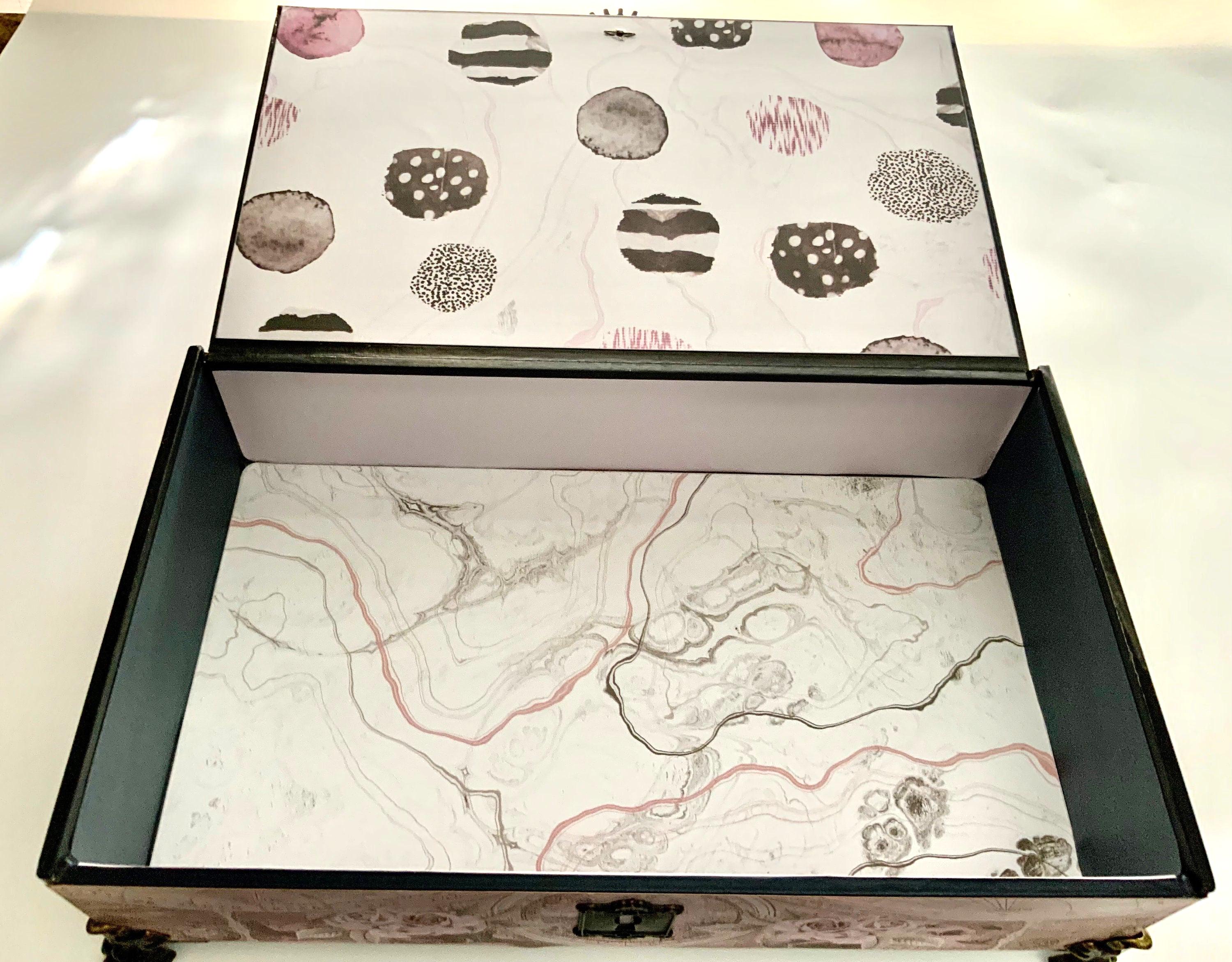 All boxes are thoroughly aired out before decorating to ensure there’s no residual odor. I also clean and line each one with care. All work is done in a smoke-free studio, and your box will arrive fresh and ready to enjoy.