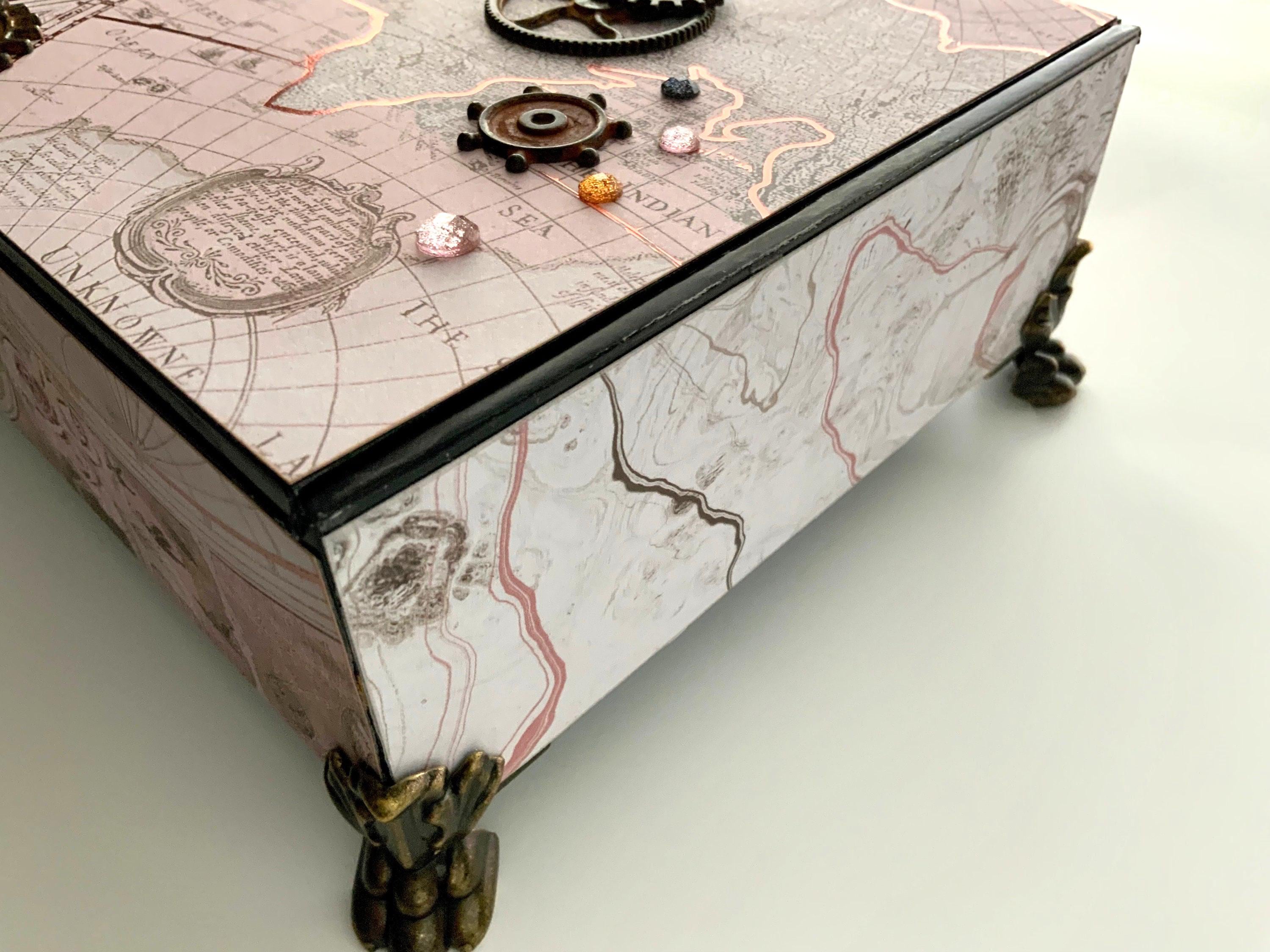Intricate metal gears and a compass motif reflect a love of travel and time, while shimmering rhinestones and floral map art soften the piece with a feminine edge. Ornate claw-style feet elevate this box into a functional and decorative keepsake.