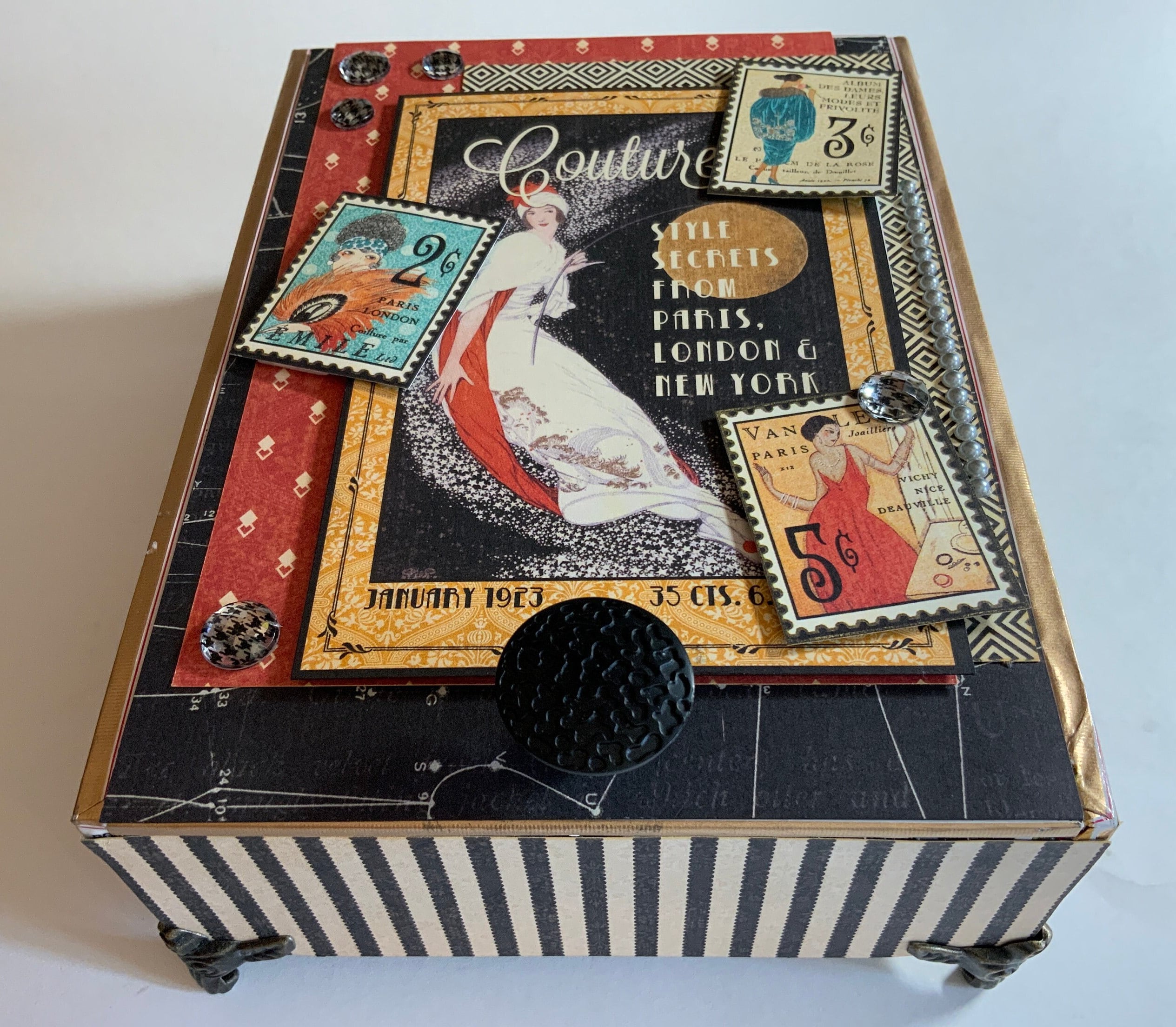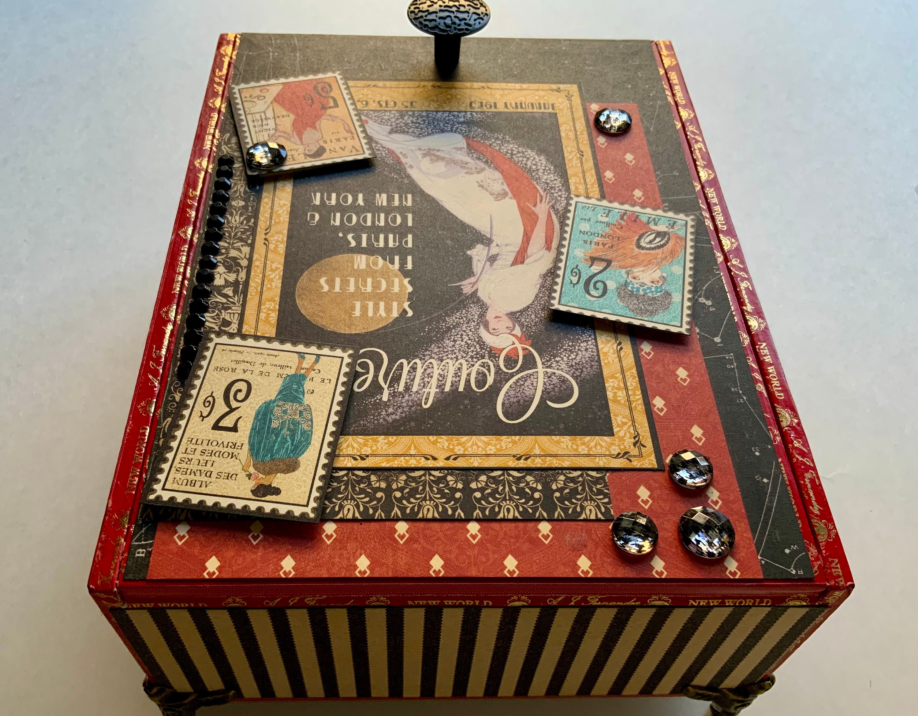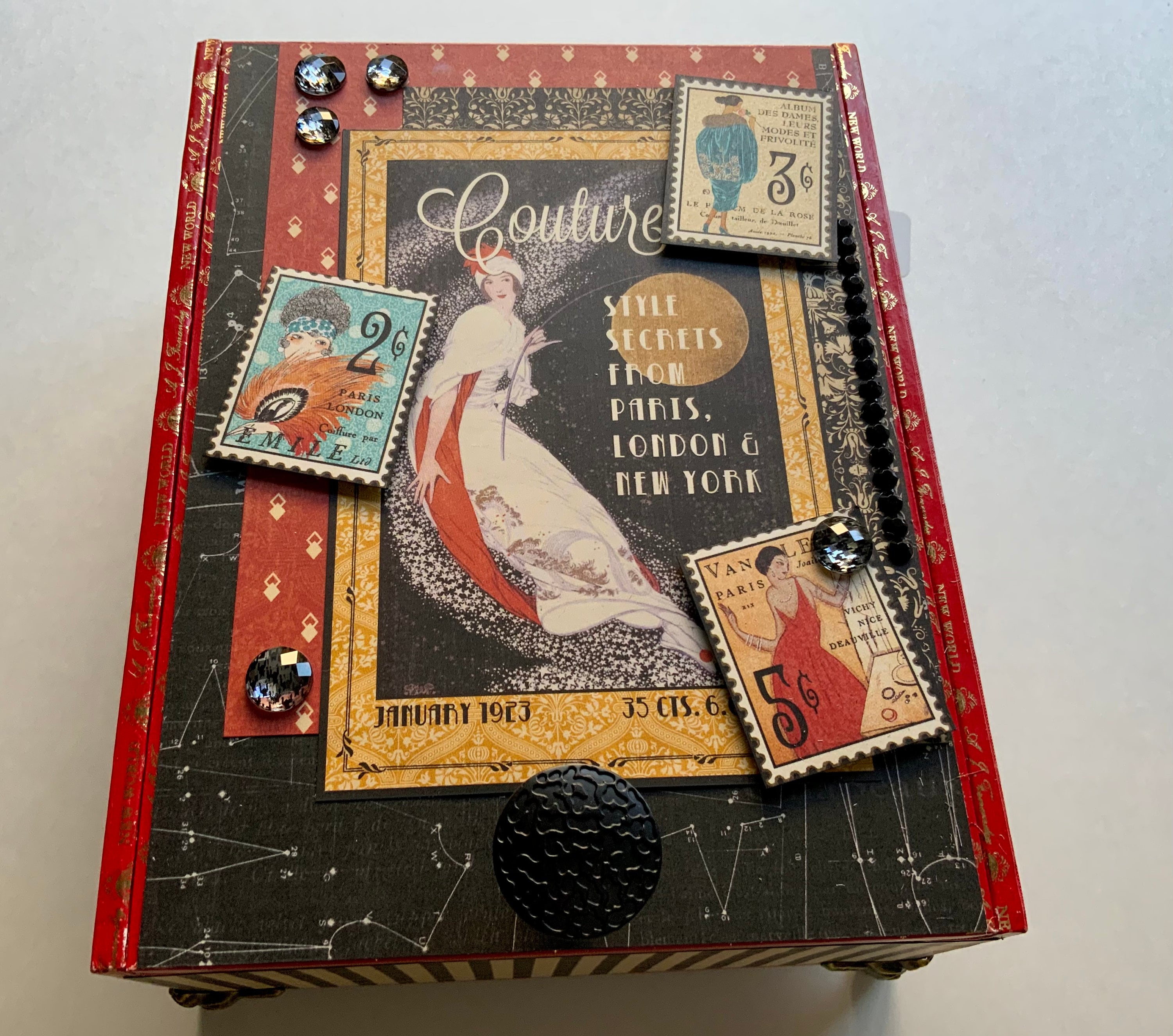 Handcrafted using the stunning Graphic 45 Couture paper collection, this elegant keepsake box features layered couture artwork, dimensional postage-style embellishments, and faceted jewel accents that catch the light and add subtle sparkle. The design evokes timeless fashion, sophistication, and old-world charm.