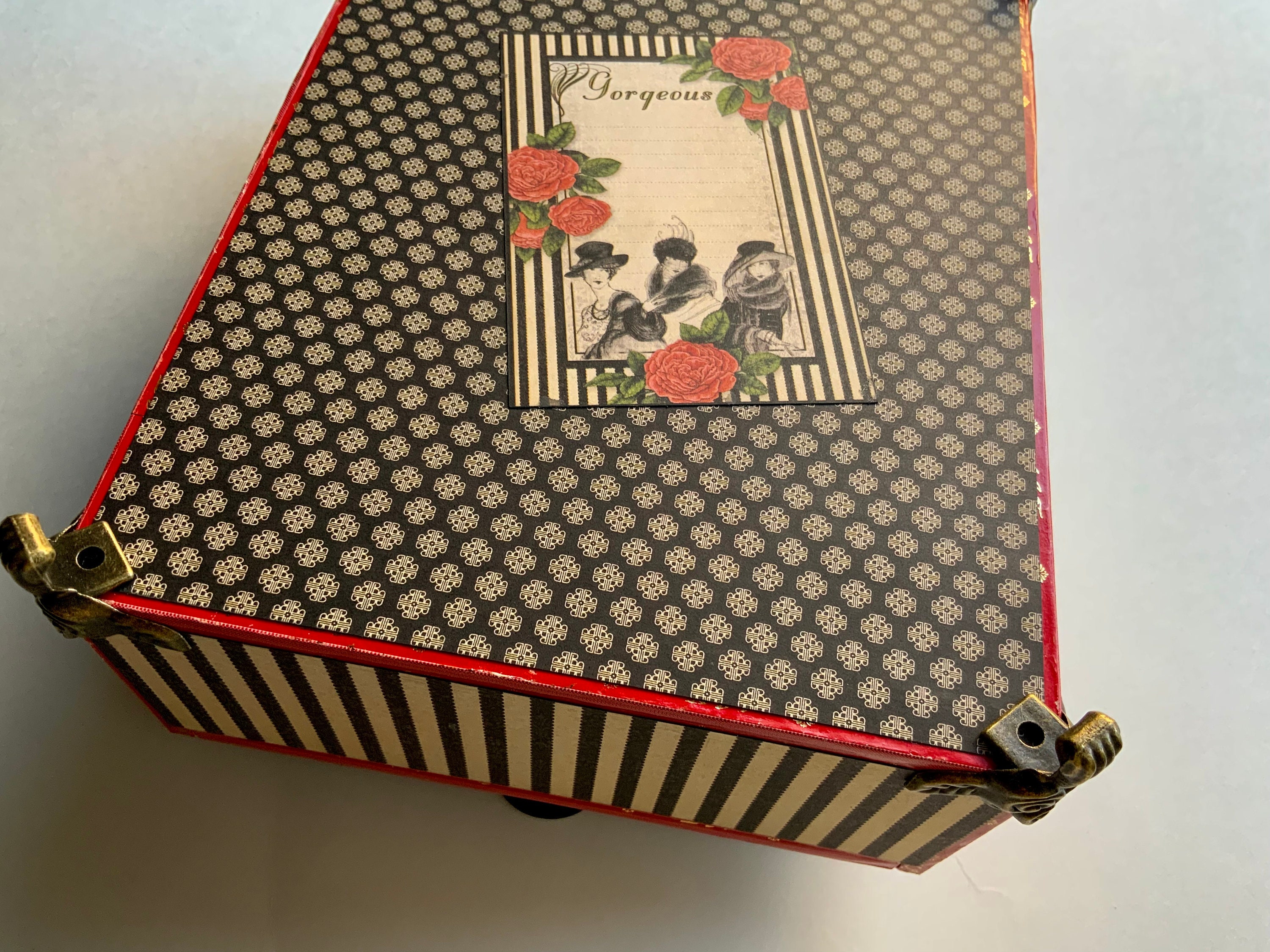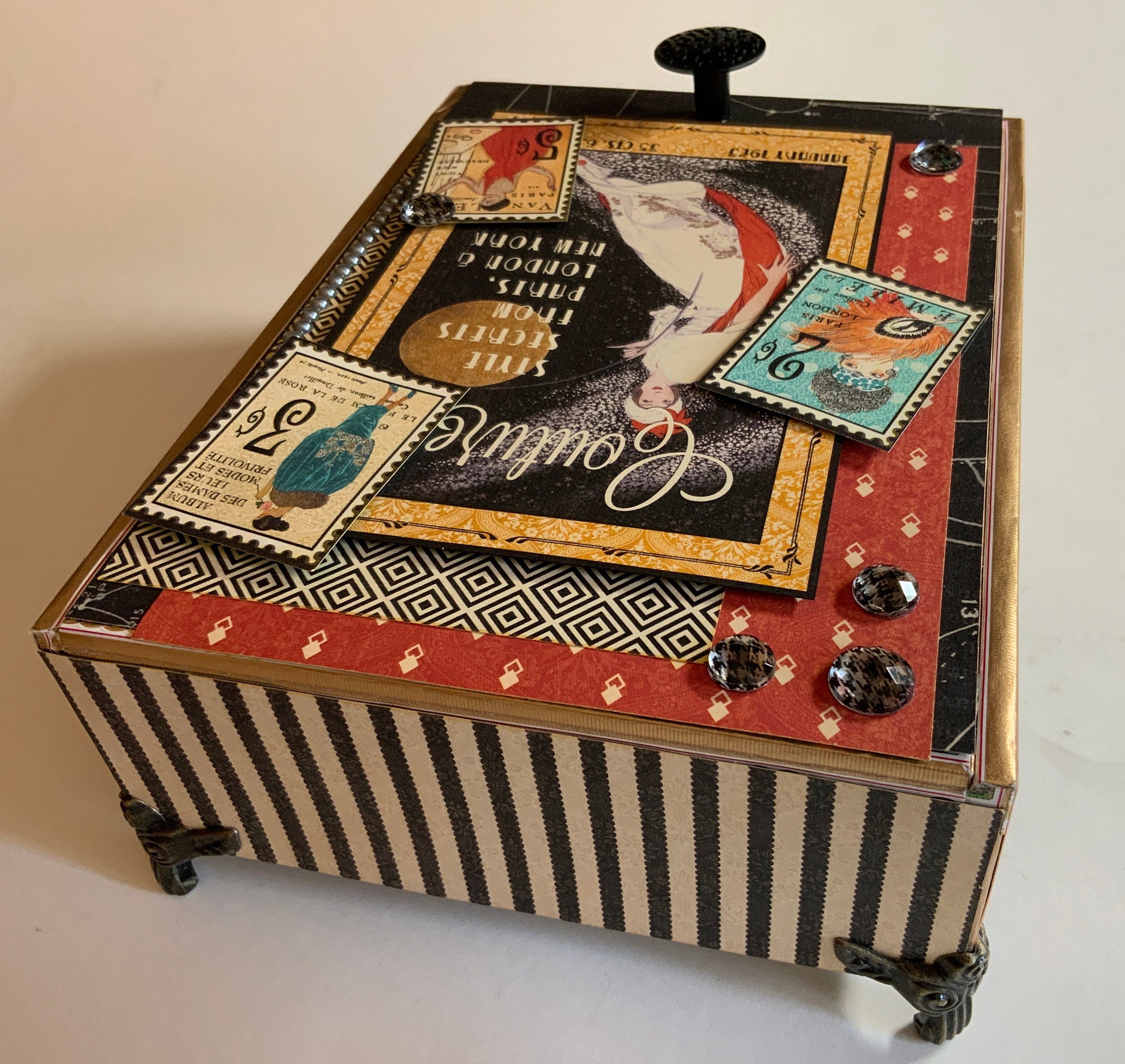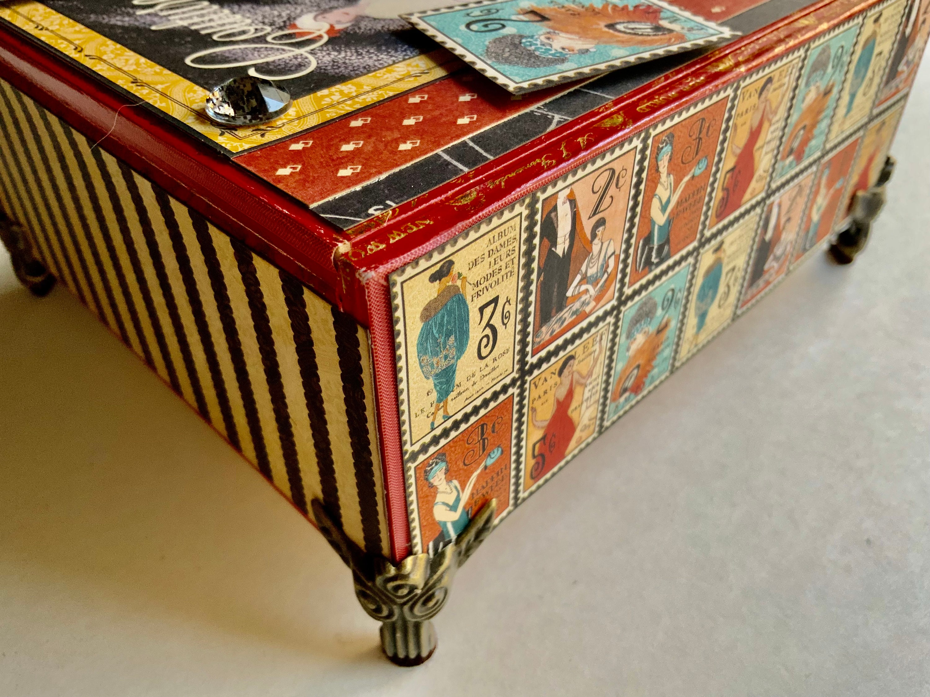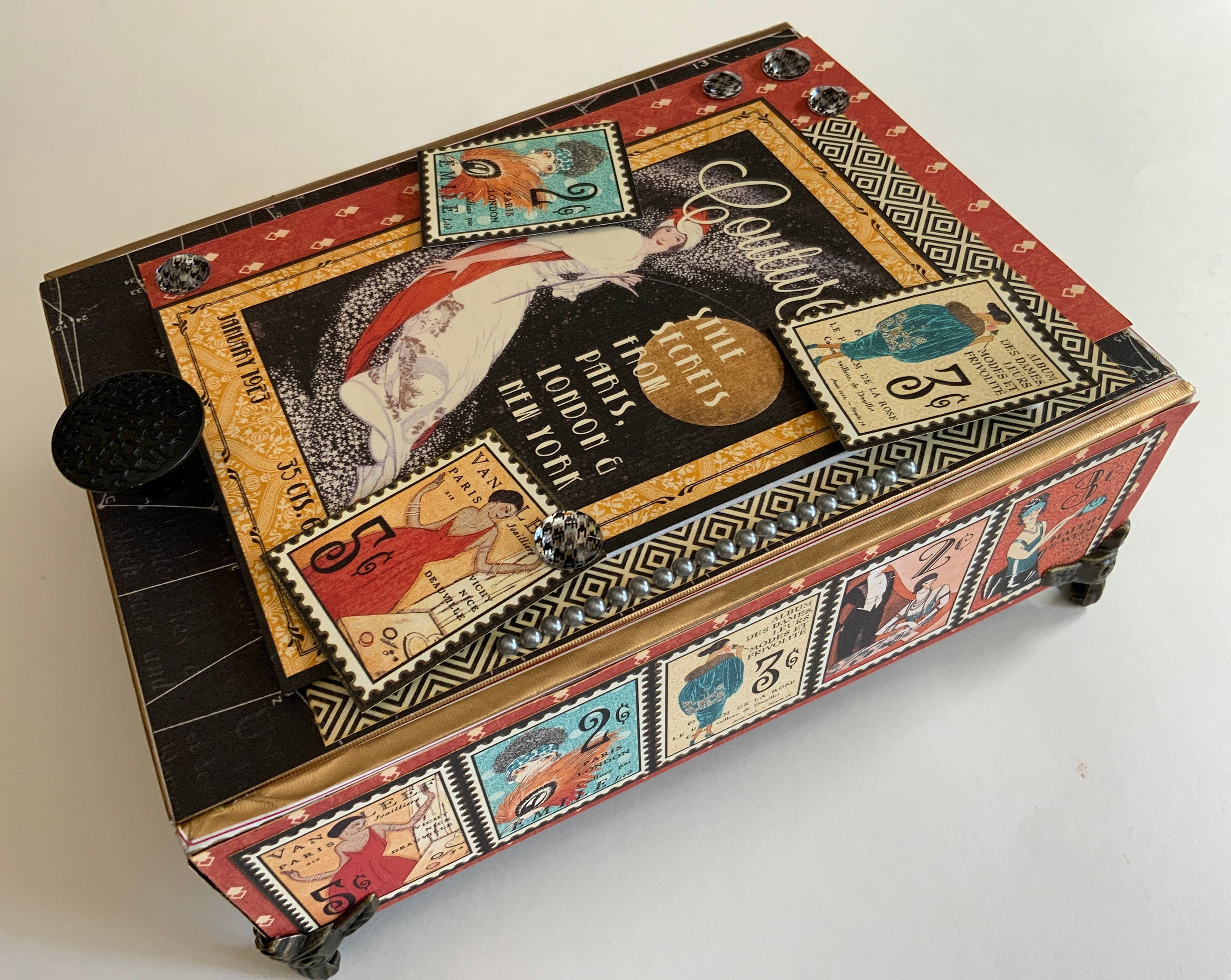 Handcrafted using the stunning Graphic 45 Couture paper collection, this elegant keepsake box features layered couture artwork, dimensional postage-style embellishments, and faceted jewel accents that catch the light and add subtle sparkle. The design evokes timeless fashion, sophistication, and old-world charm.