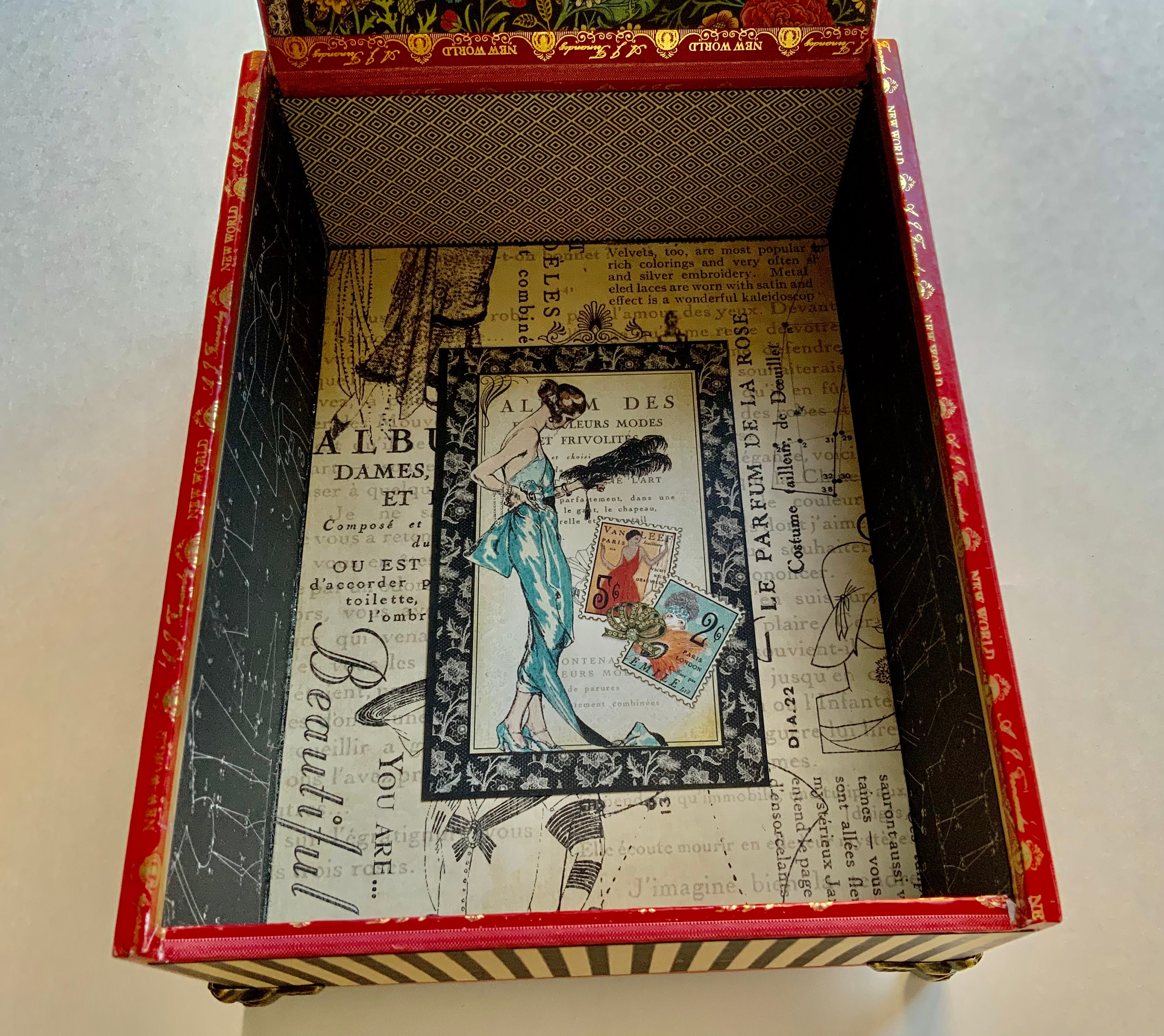 The interior is fully lined with coordinating patterns, creating a refined and cohesive space perfect for storing jewelry, letters, or treasured keepsakes.